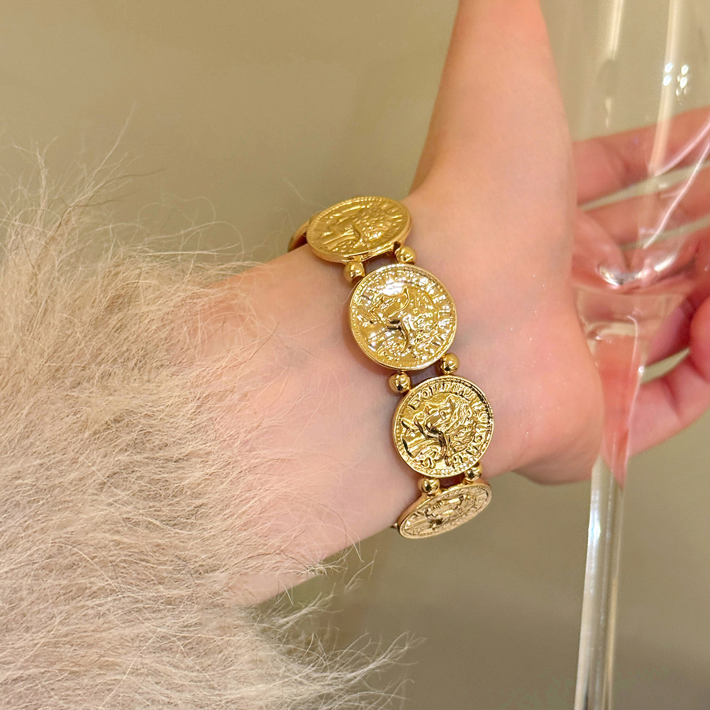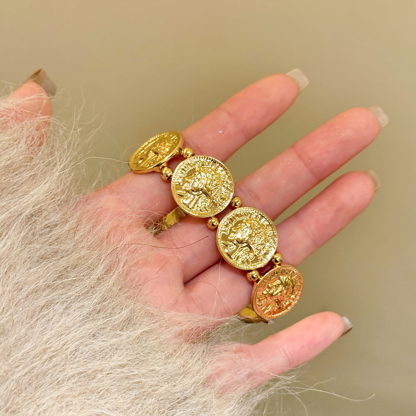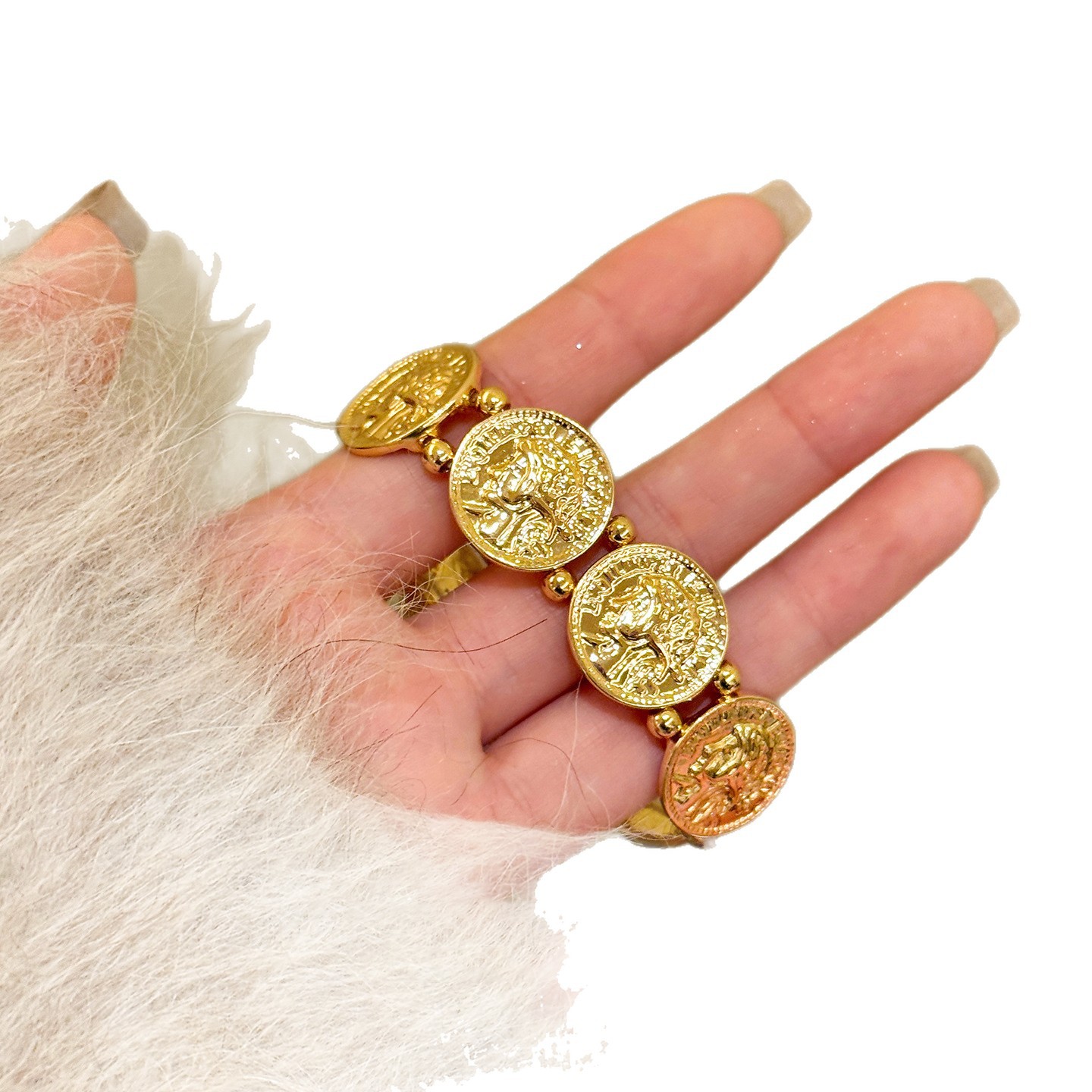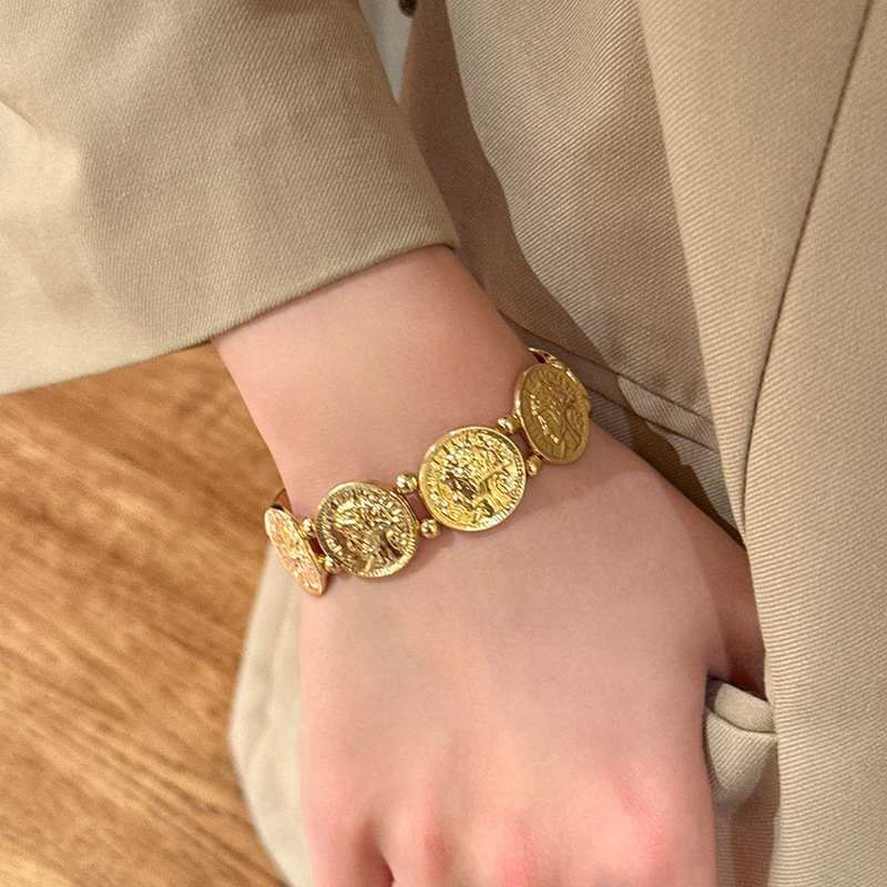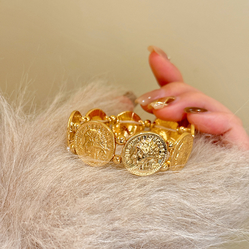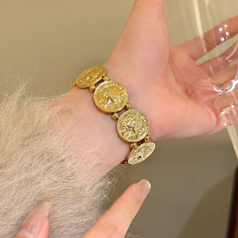 欧美跨境金属风圆形人像弹力手链轻奢高级感手环时尚个性气质手饰 English | 投诉