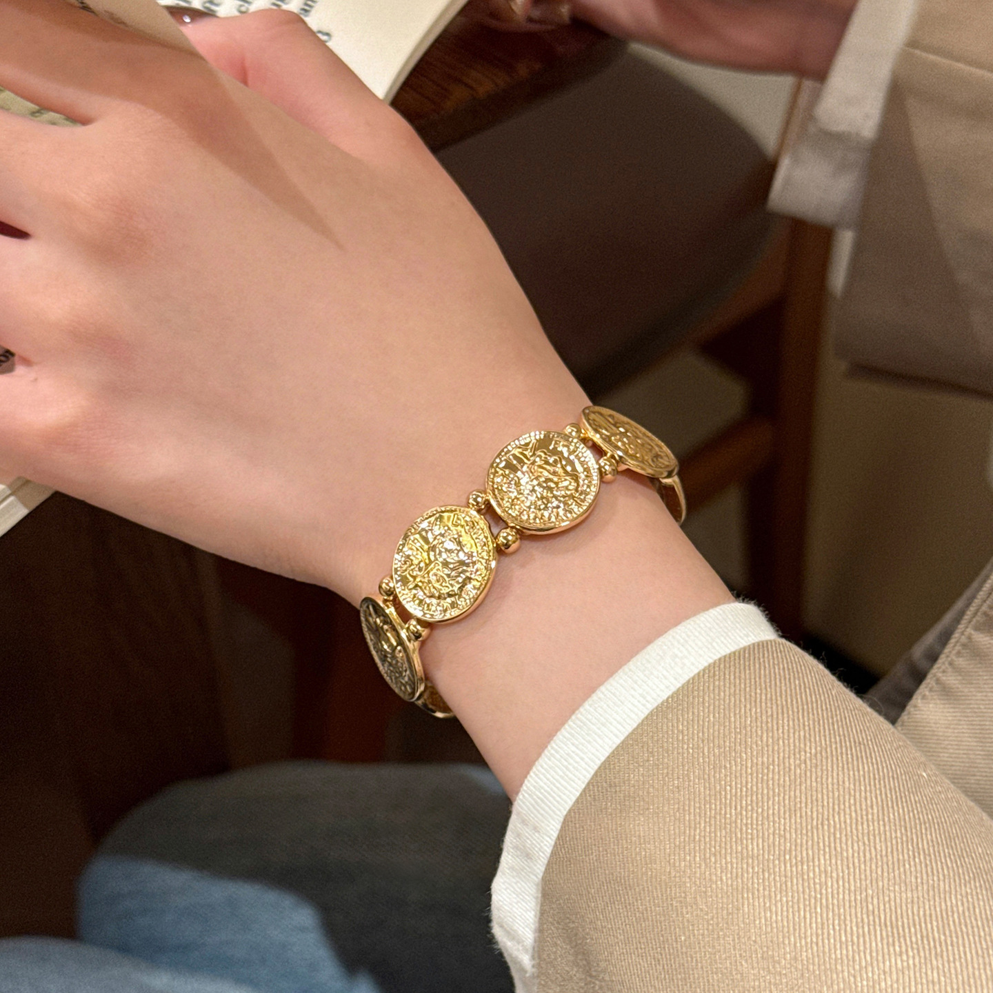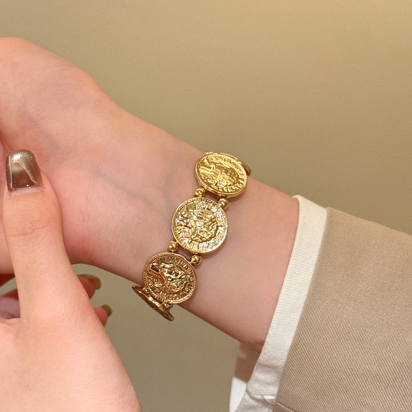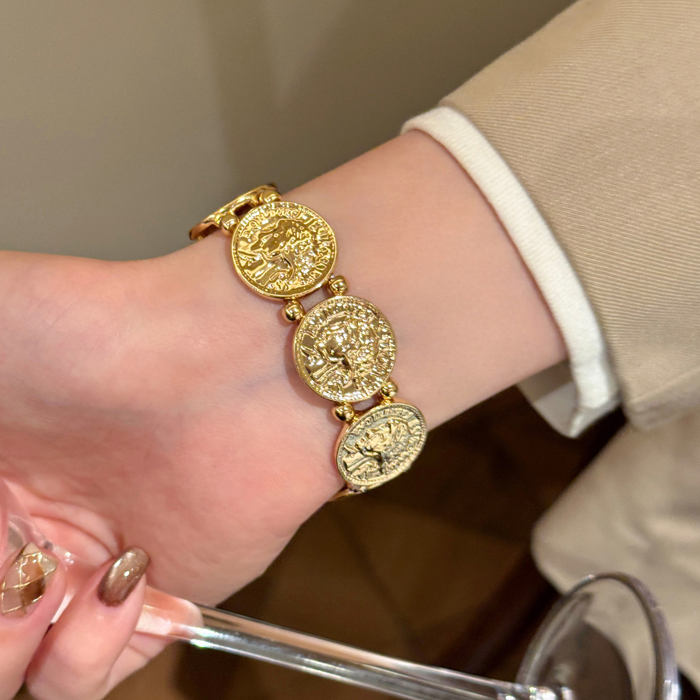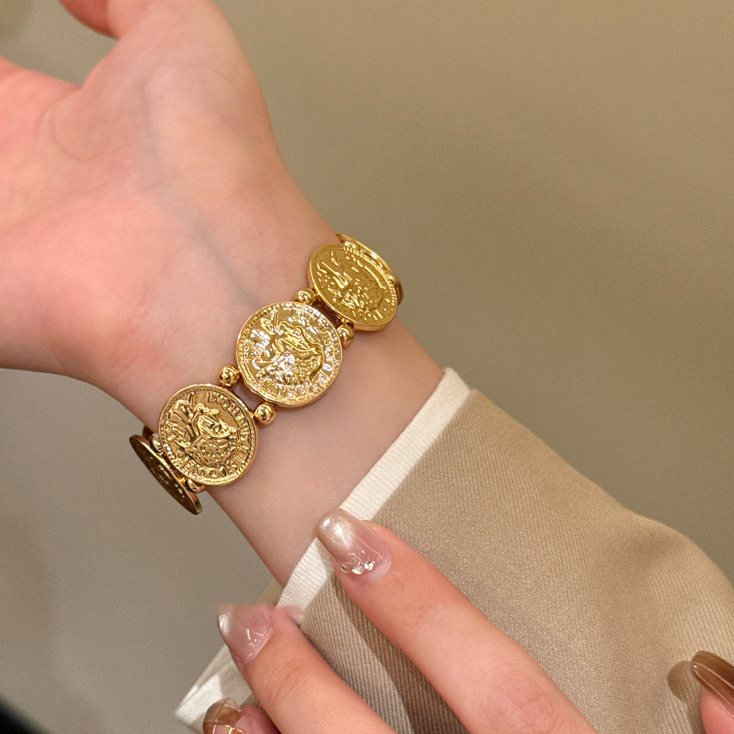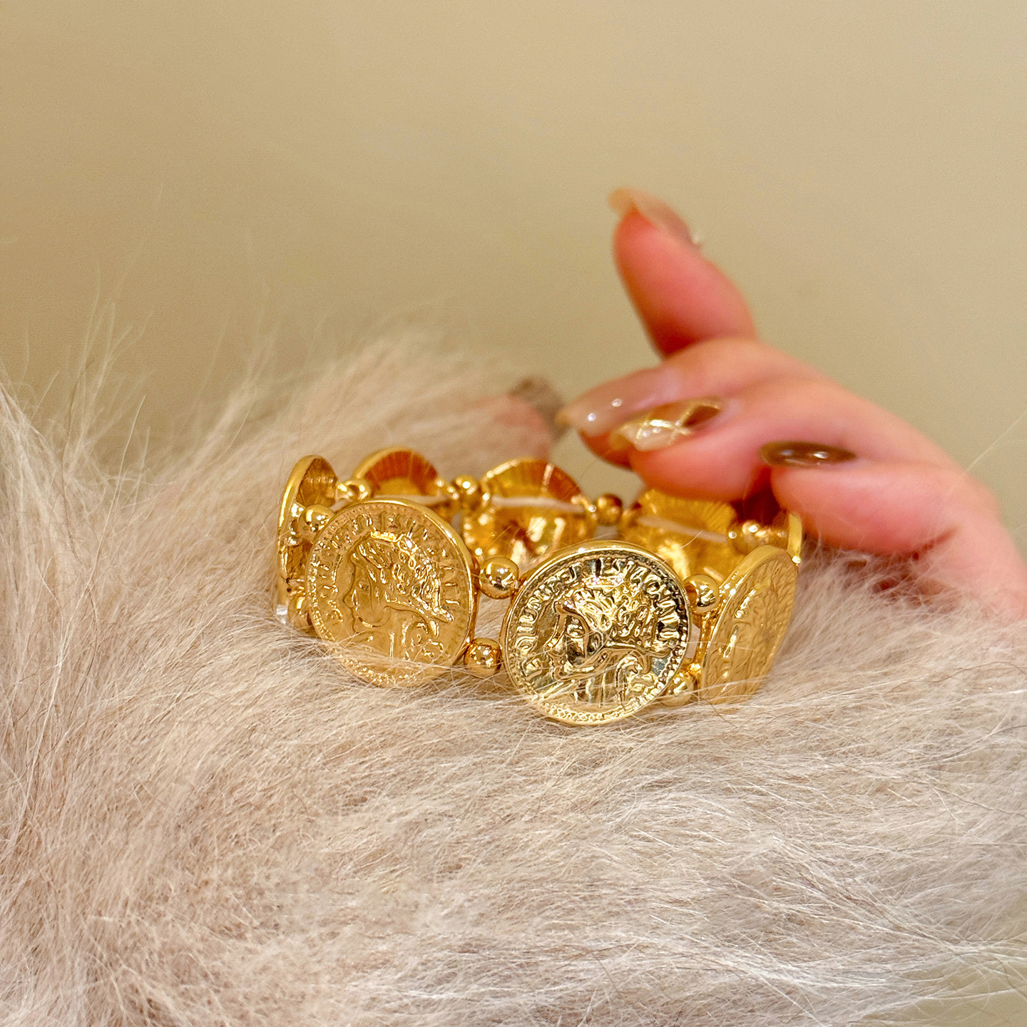 欧美跨境金属风圆形人像弹力手链轻奢高级感手环时尚个性气质手饰 English | 投诉