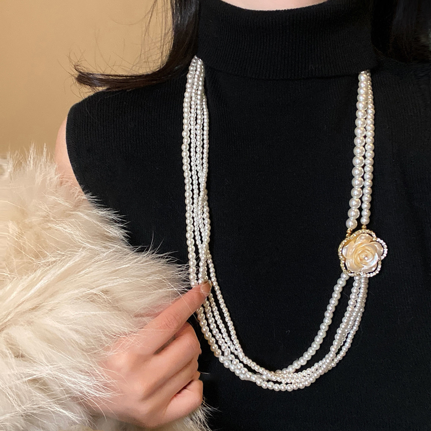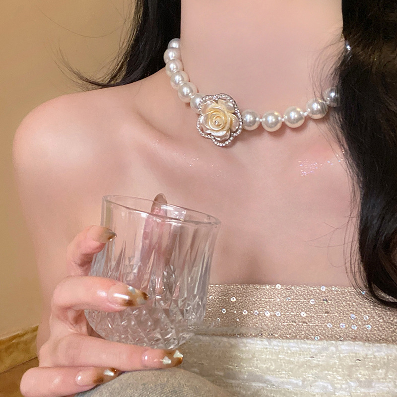 法式超仙宫廷风镶钻树脂花朵珍珠项链配饰女毛衣链轻奢高级感项饰 English | 投诉