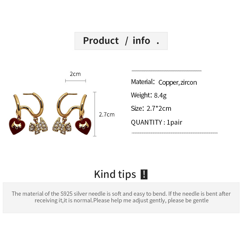 材质: 铜 处理工艺: 镶锆石 品牌: 丰美饰品厂 流行元素: 爱心/心形 风格: 轻奢风 货号: HE30017-1 造型: 心形,动物/生肖 产地: 义乌 颜色: 耳环-金色-红色(真金电镀) 有可授权的自有品牌: 是 是否跨境出口专供货源: 是 上市年份/季节: 2025年冬季 耳针材质: 钢 风格分类: 时尚通勤 适用人群: 女式 流行元素分类: 形状/图案 重量: 0.5 kg/对