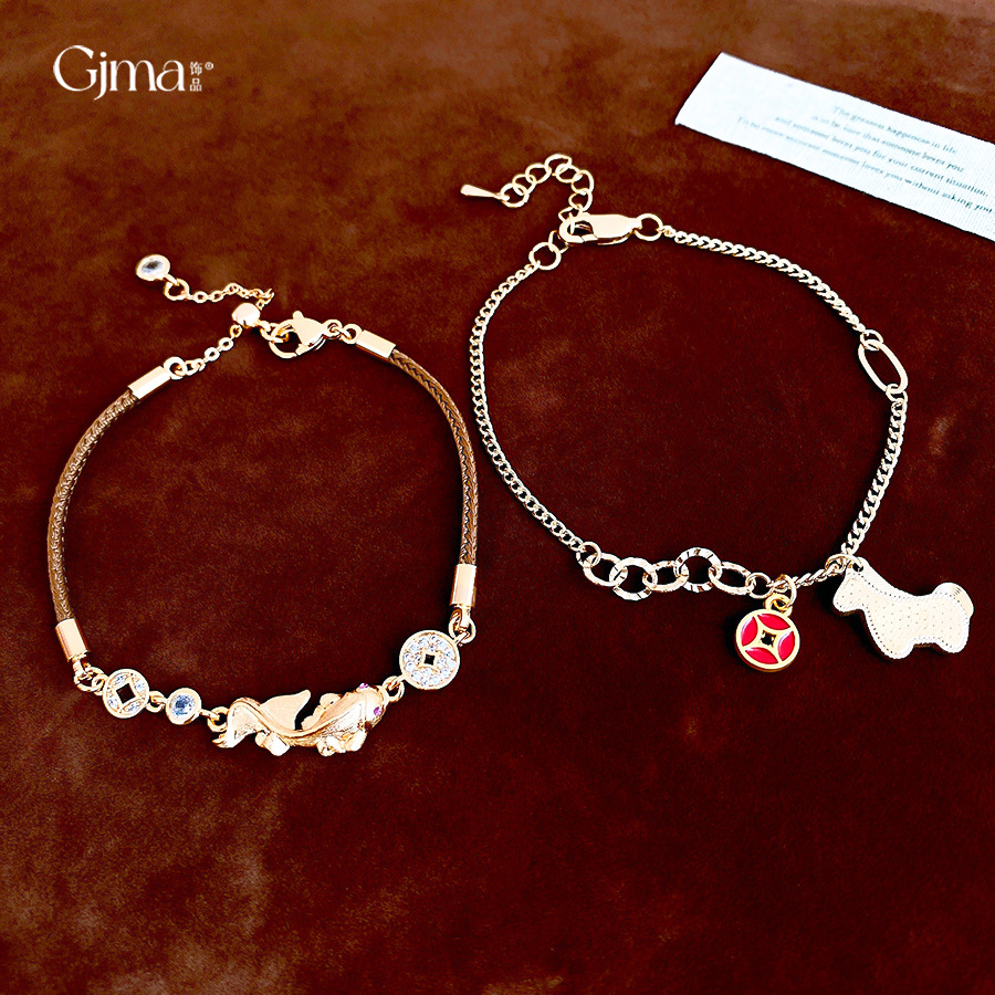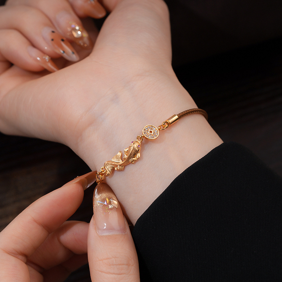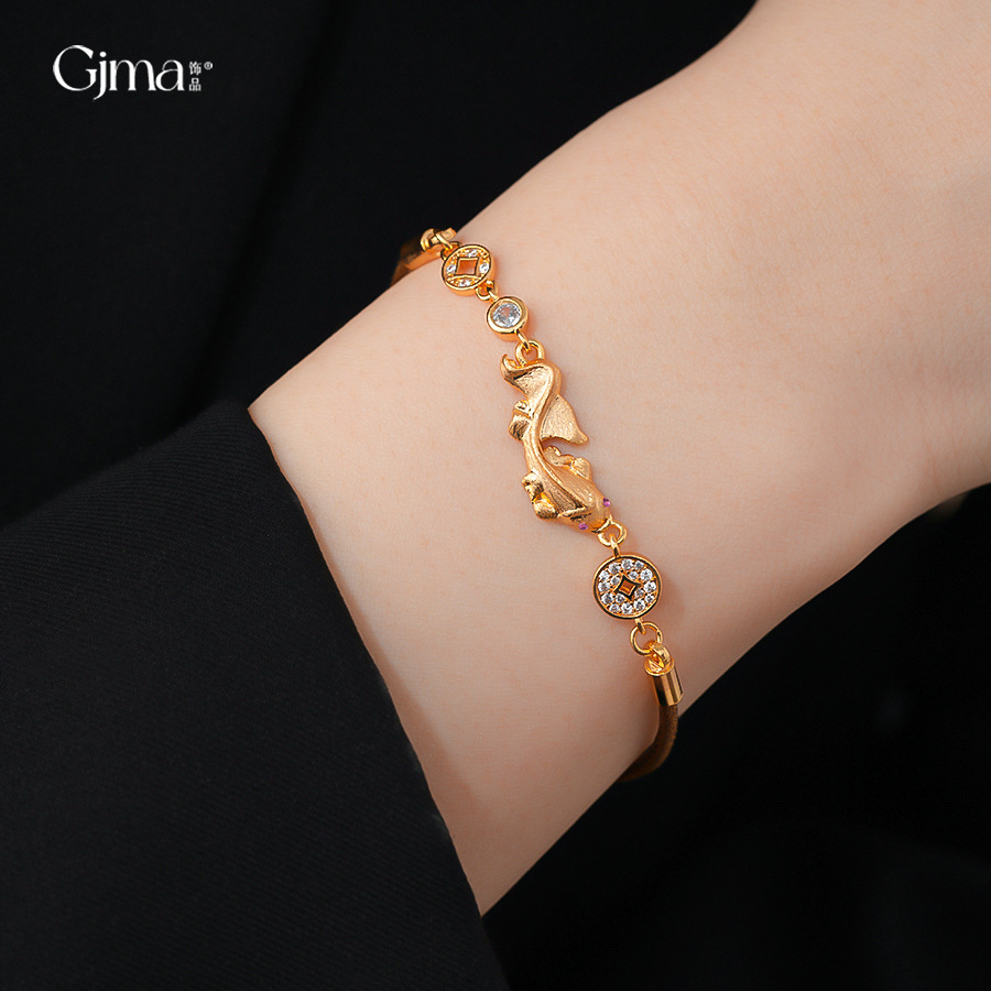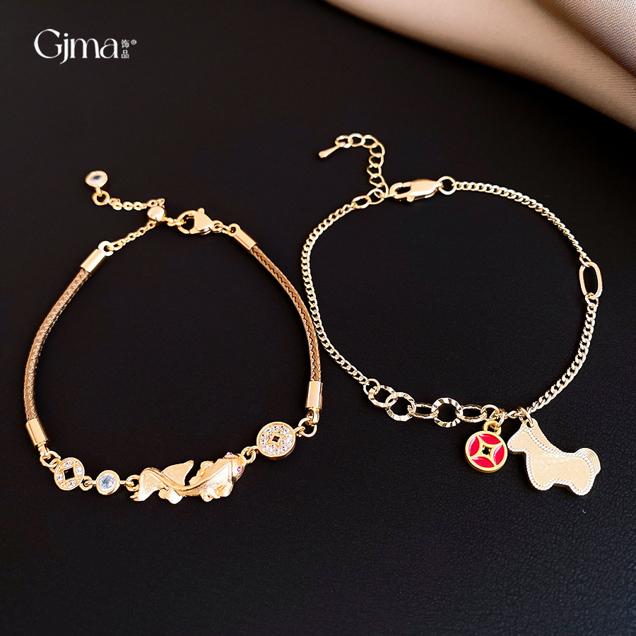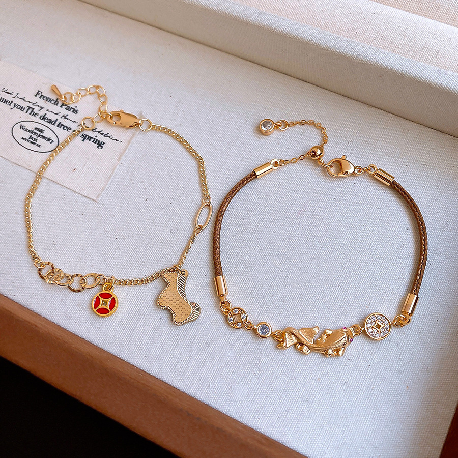 材质: 铜 品牌: 丰美饰品厂 处理工艺: 镶锆石 风格: 新中式 适用人群: 女式 样式: 女式 造型: 动物/生肖 适用送礼场合: 展销会 货号: HB5063-HB5066 产地: 义乌 颜色: 手链-金色-咖色(真金电镀),手链-金色 有可授权的自有品牌: 是 是否跨境出口专供货源: 是 流行元素: 锦鲤 上市年份/季节: 2025年冬季 风格分类: 个性风潮 流行元素分类: 动物 重量: 0.5 kg/条