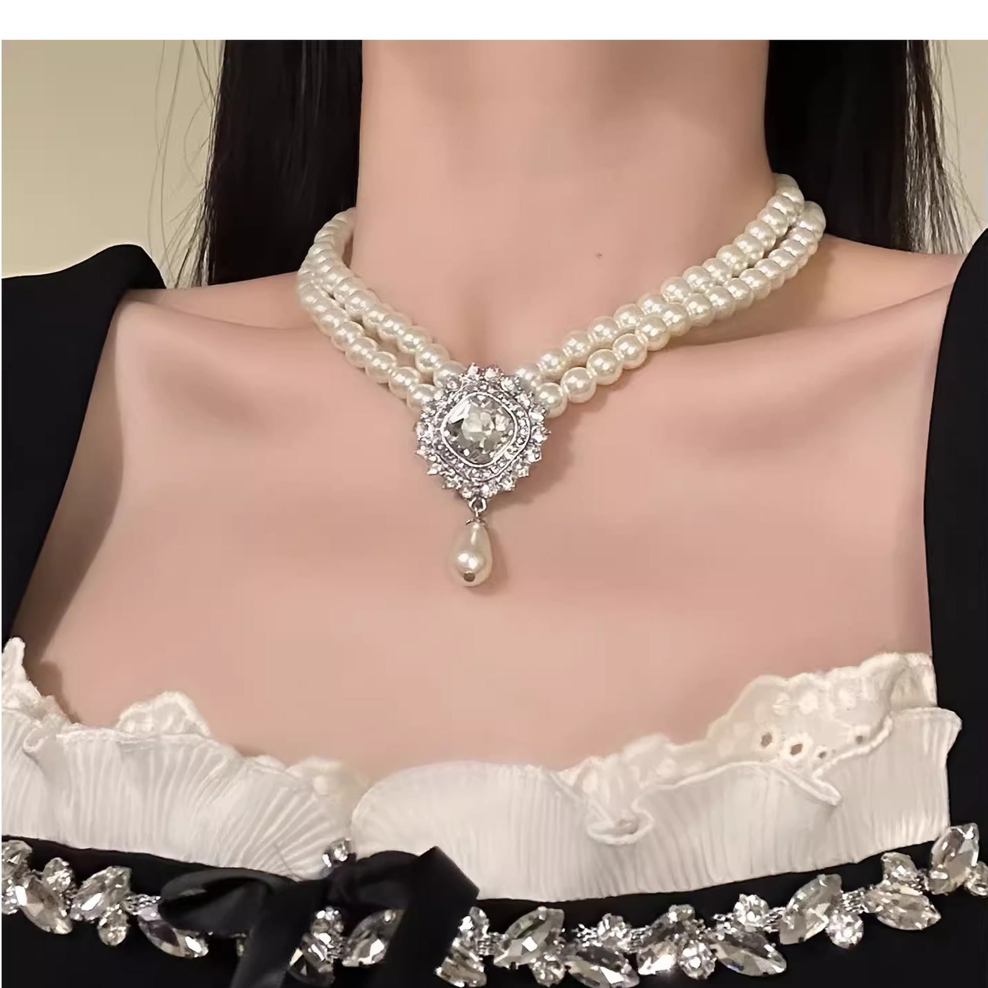 欧美宫廷风镶钻几何水滴珍珠项链配饰女重工毛衣链轻奢高级感项饰