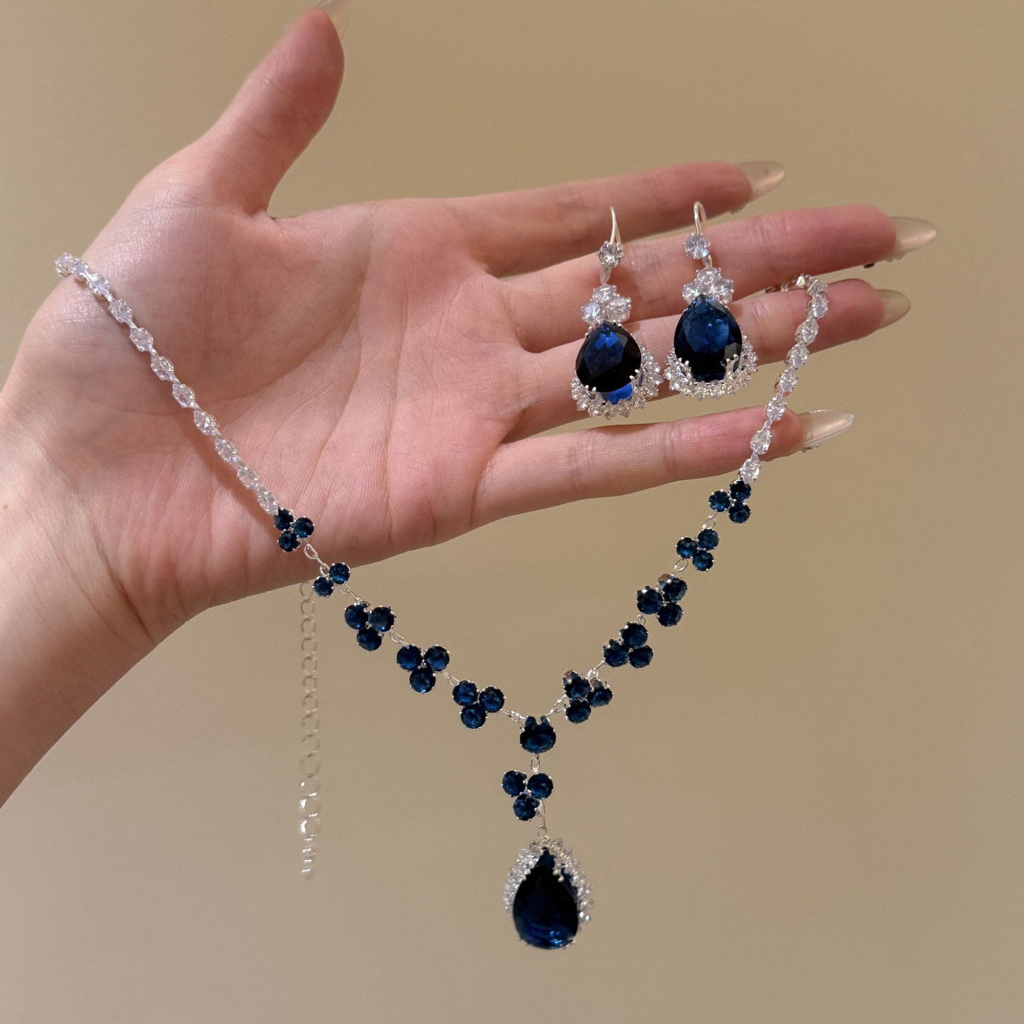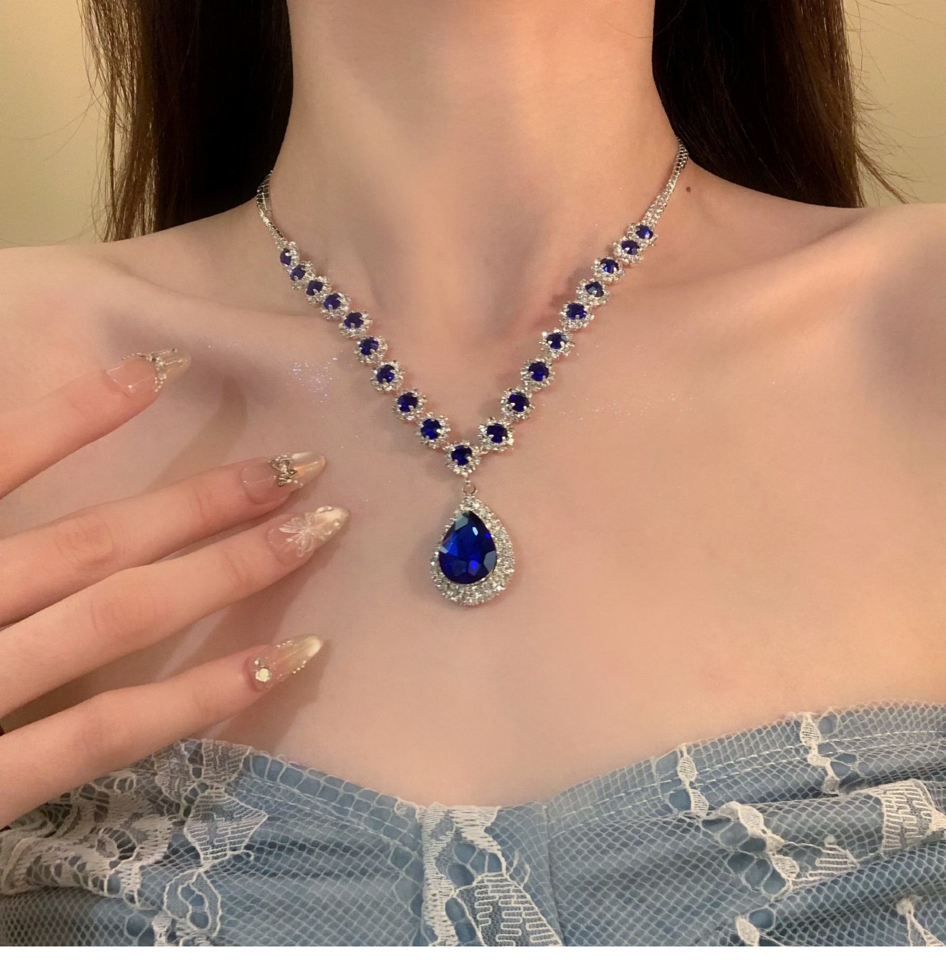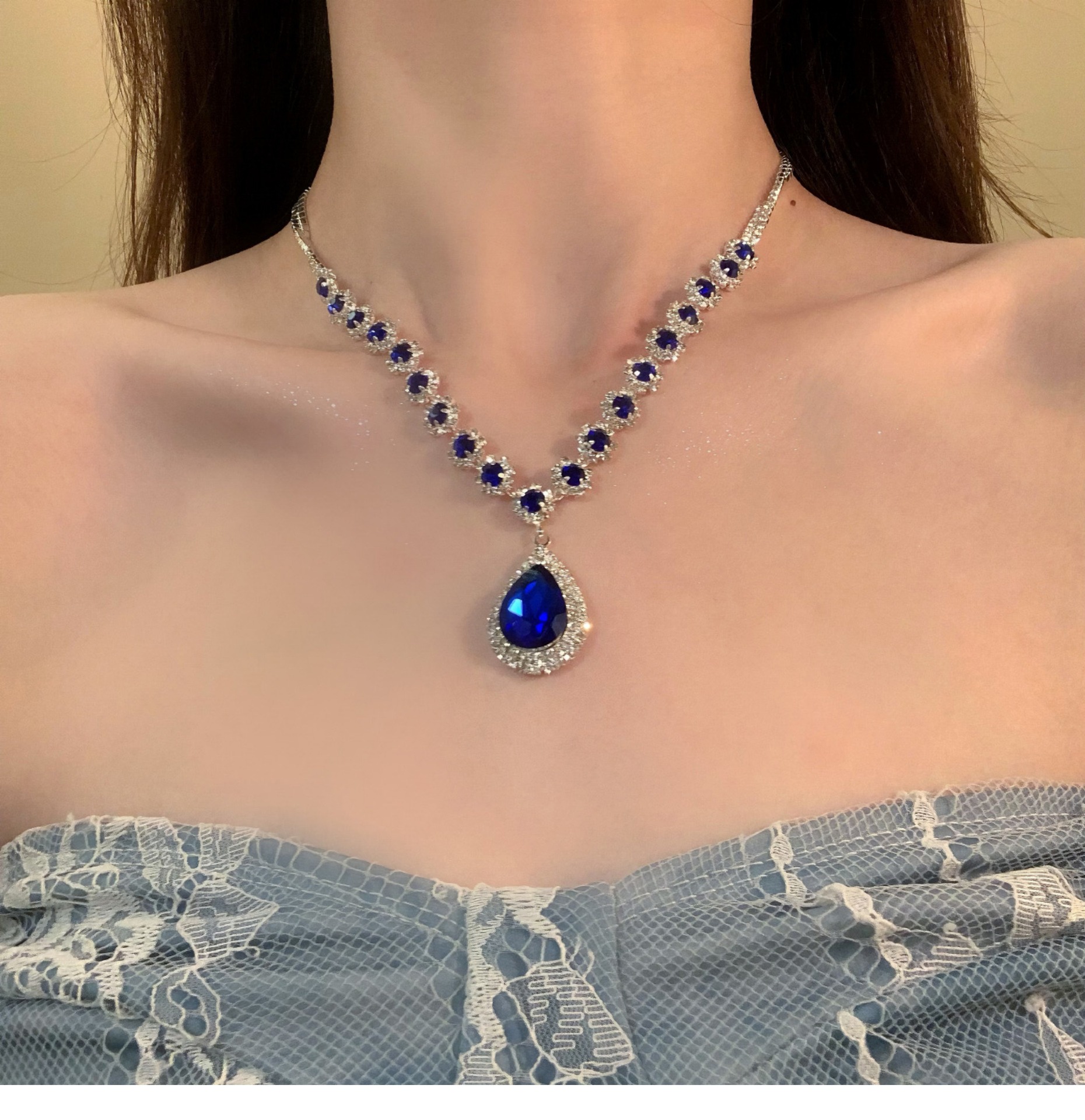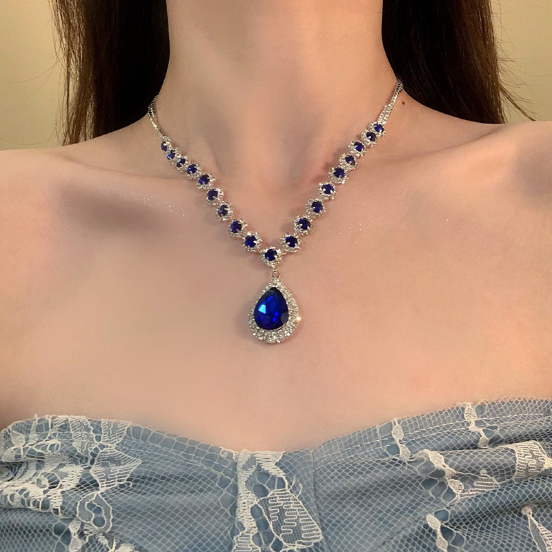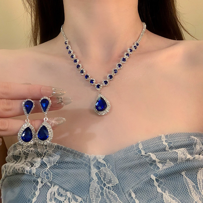 材质: 铜 处理工艺: 镶锆石 链子样式: 锁骨链 坠子材质: 铜镶锆石 品牌: 丰美饰品厂 流行元素: 水滴 造型: 水滴形,几何型,其他 货号: 16-HN10950-1 产地: 义乌 是否多层: 否 周长: 41cm(含)-50cm(含) 颜色: 项链-耳钩-银色-蓝色(两件套) 有可授权的自有品牌: 是 是否跨境出口专供货源: 是 上市年份/季节: 2025年冬季 风格: 宫廷风 重量: 33.6g 风格分类: 文艺复古 适用人群: 女式 流行元素分类: 自然 重量: 0.5 kg/条