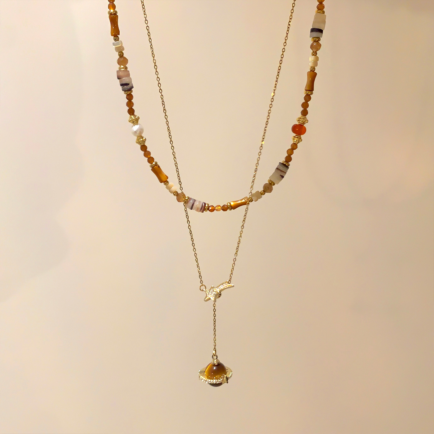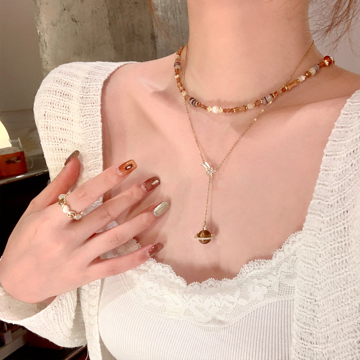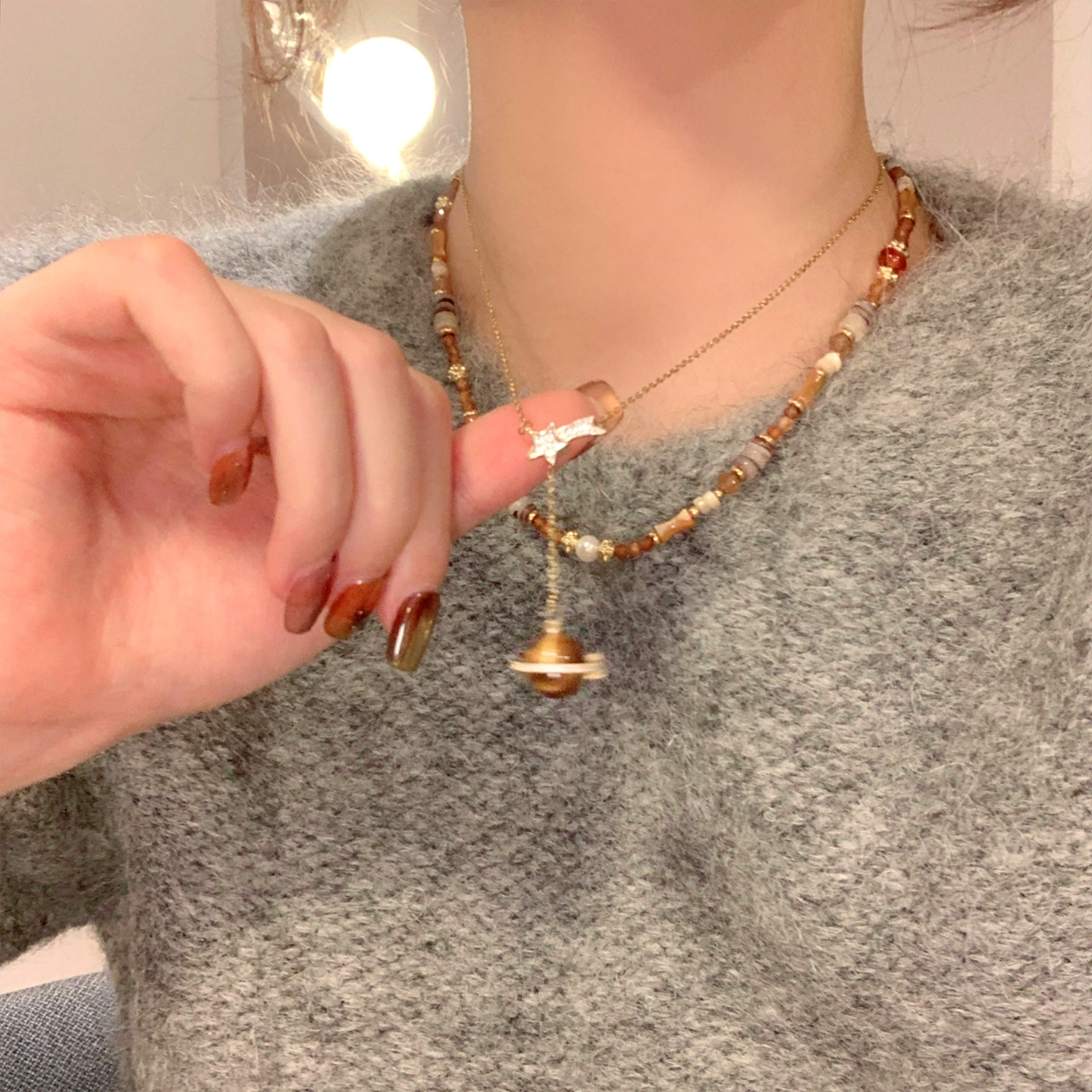材质: 铜 处理工艺: 电镀 链子样式: 锁骨链 坠子材质: 铜 品牌: 丰美饰品厂 流行元素: 土星,星星 造型: 几何型 货号: 5-WN2188-1 产地: 义乌 是否多层: 否 周长: 41cm(含)-50cm(含) 颜色: 项链-金色-咖色 有可授权的自有品牌: 是 是否跨境出口专供货源: 是 上市年份/季节: 2025年冬季 风格: 美拉德风 重量: 5g 风格分类: 文艺复古 适用人群: 女式 流行元素分类: 自然 重量: 0.5 kg/条