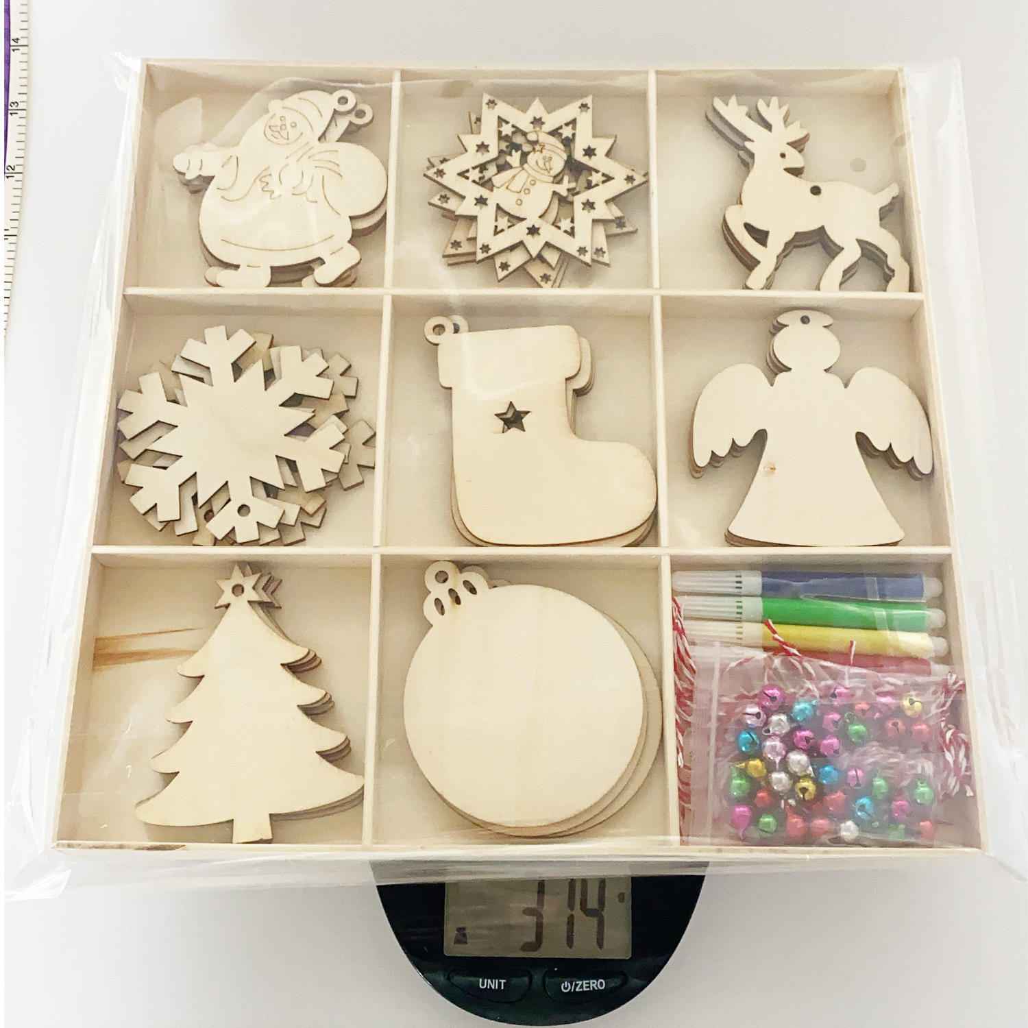 产品重量:24个挂件+6格木盒:100克 ,6格原色木盒:42克