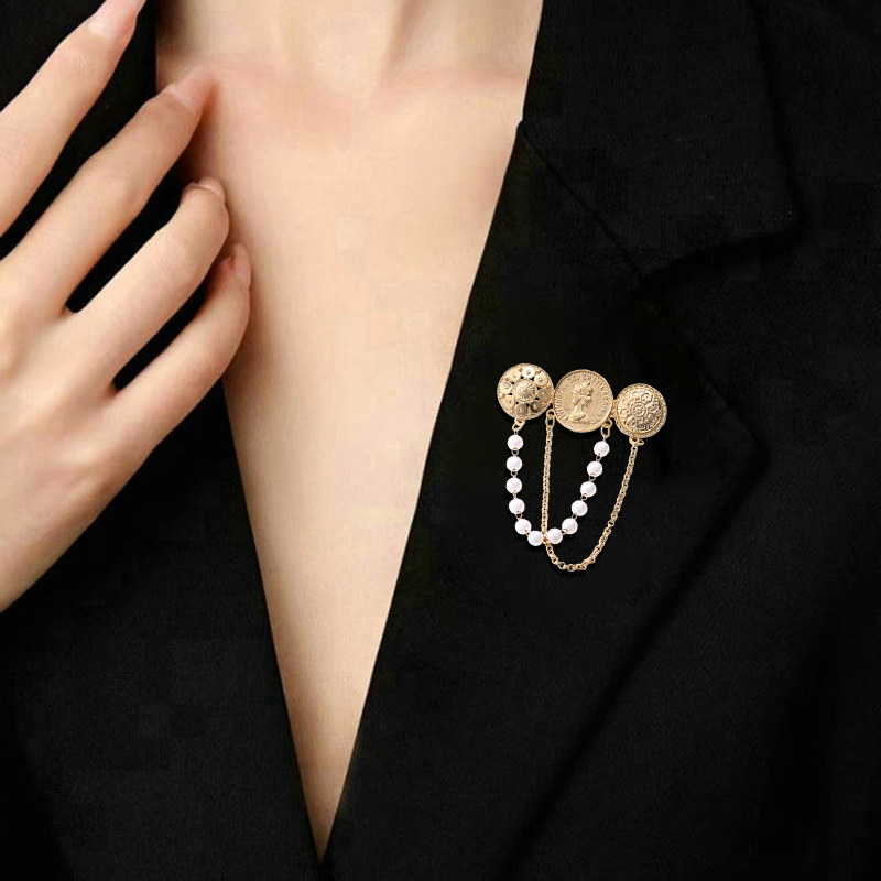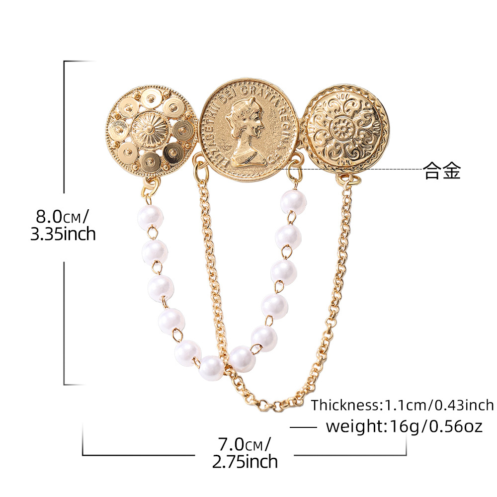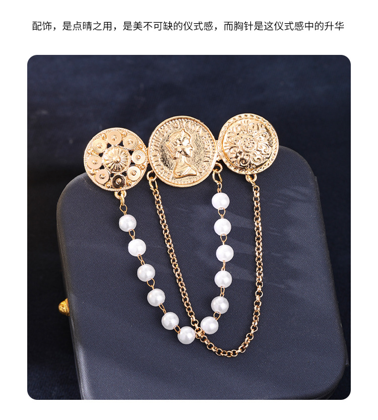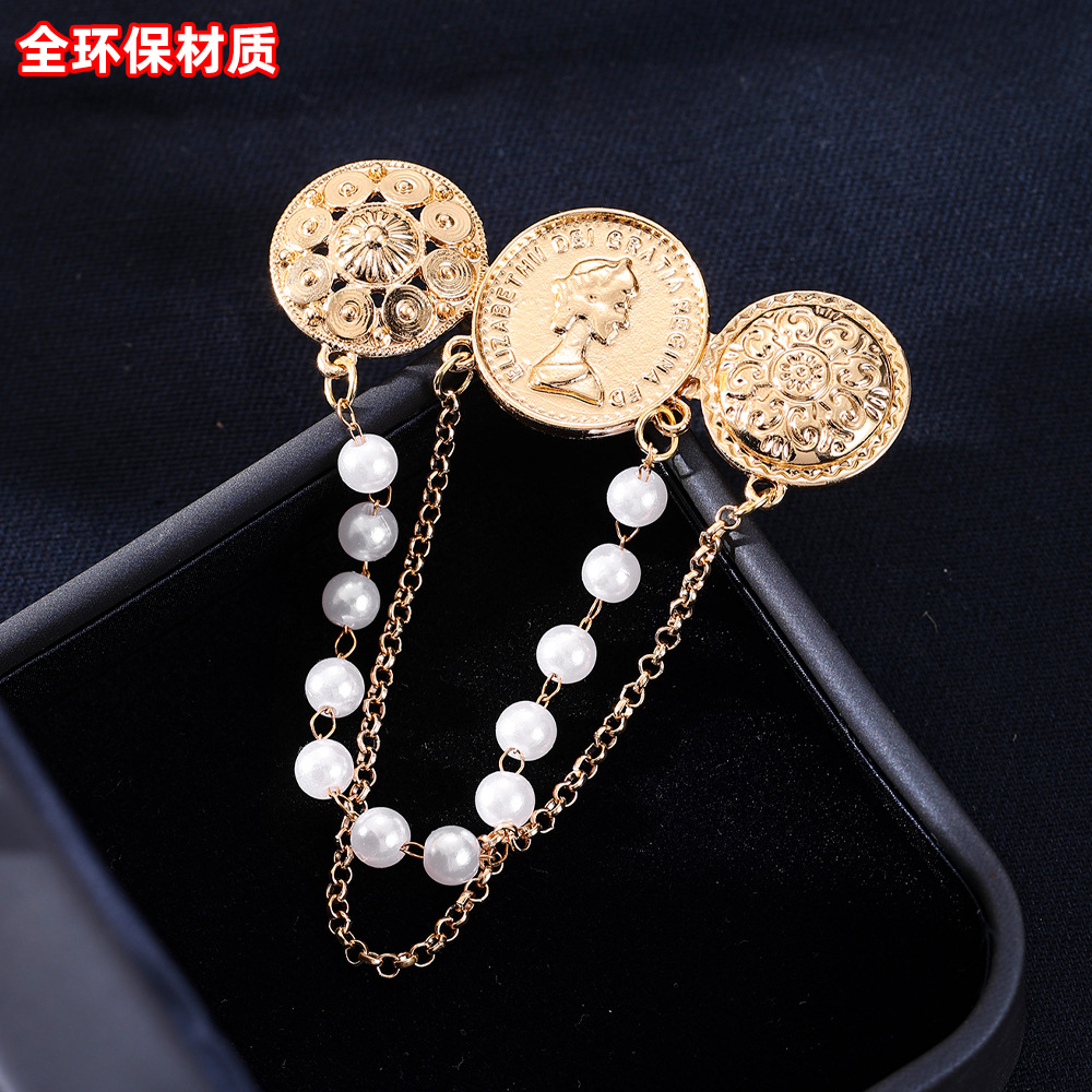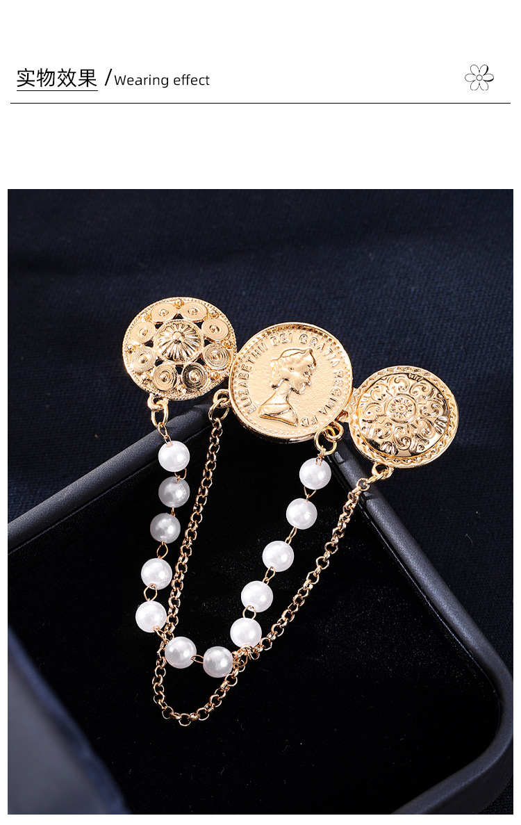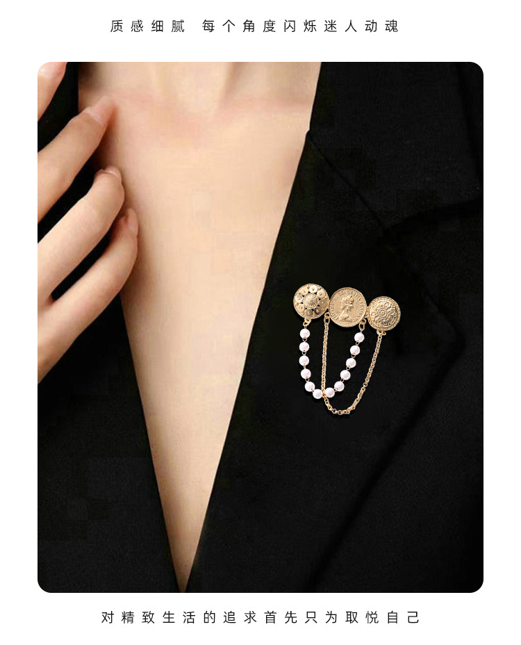 欧美时尚复古珍珠流苏胸花胸针设计感小香风浮雕金币别针名媛配饰 English | 投诉
