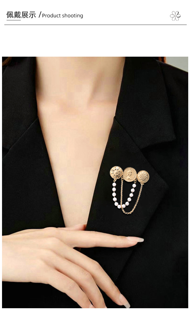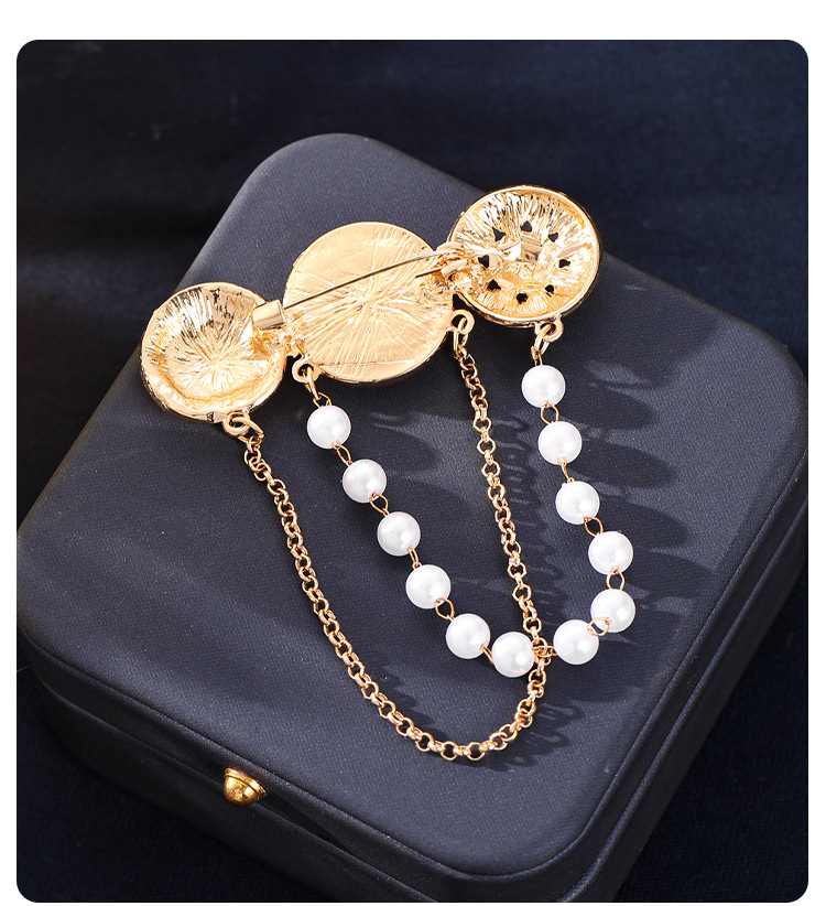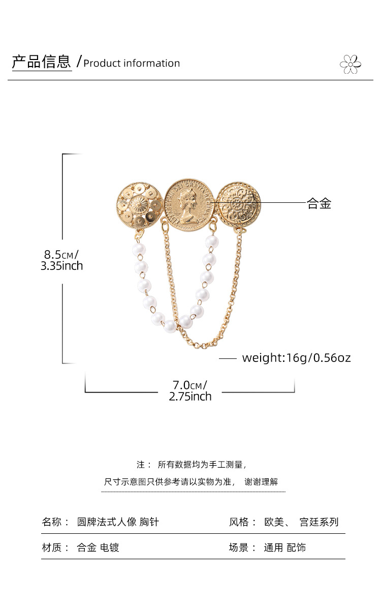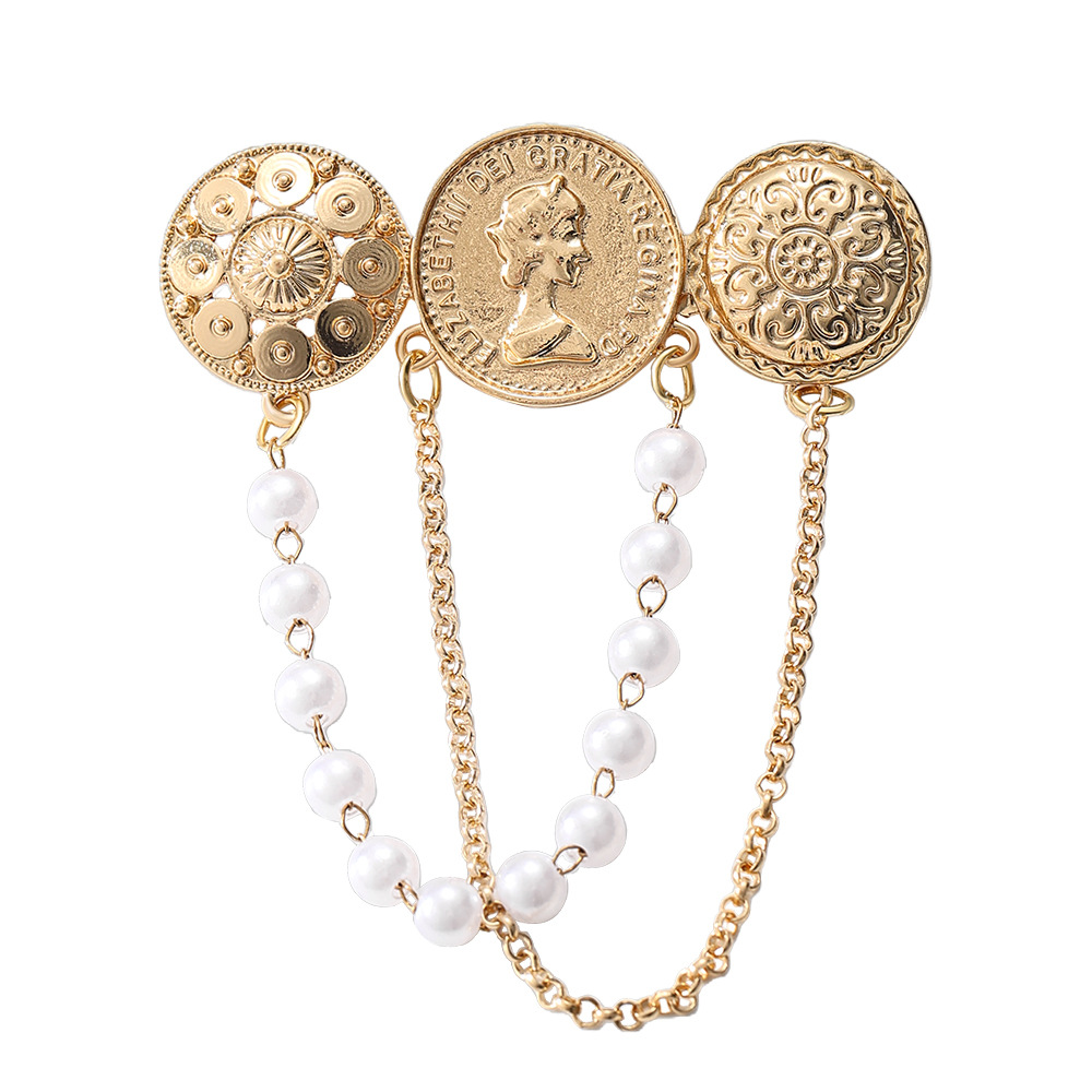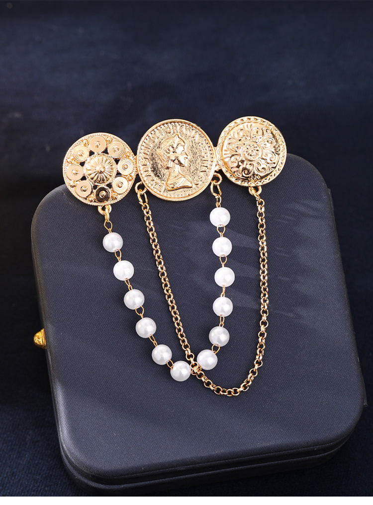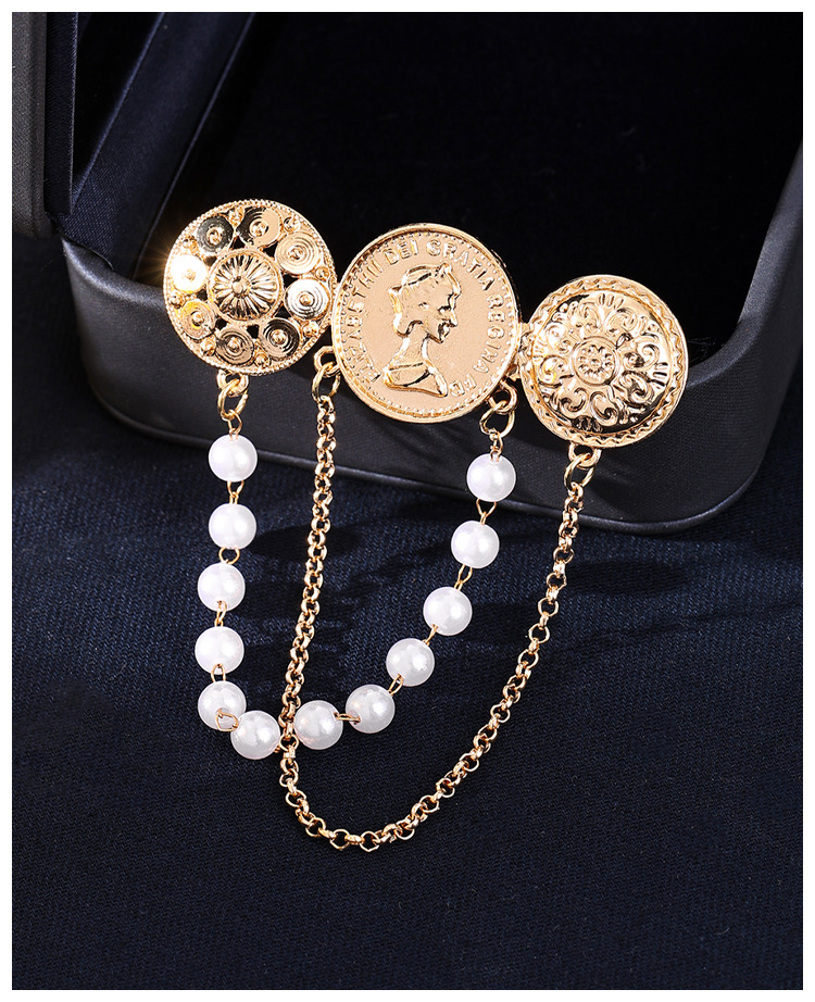 欧美时尚复古珍珠流苏胸花胸针设计感小香风浮雕金币别针名媛配饰 English | 投诉