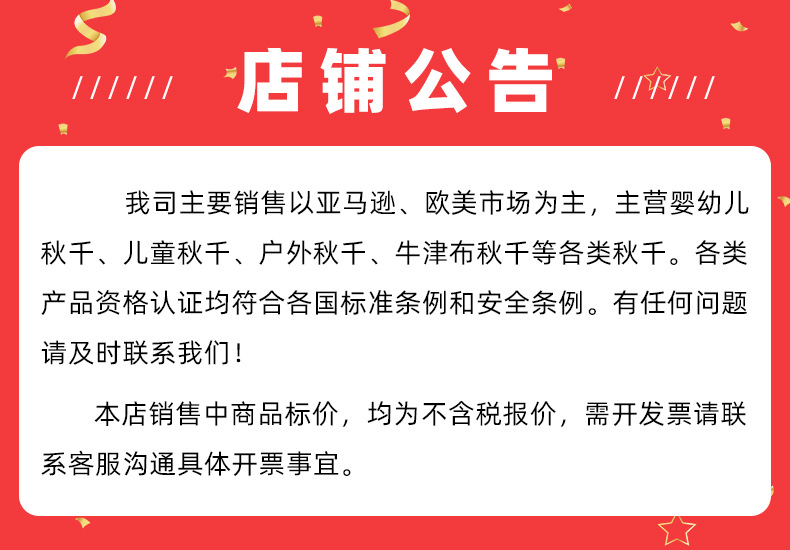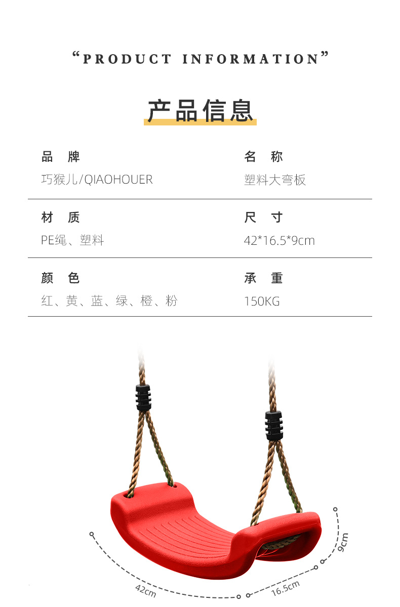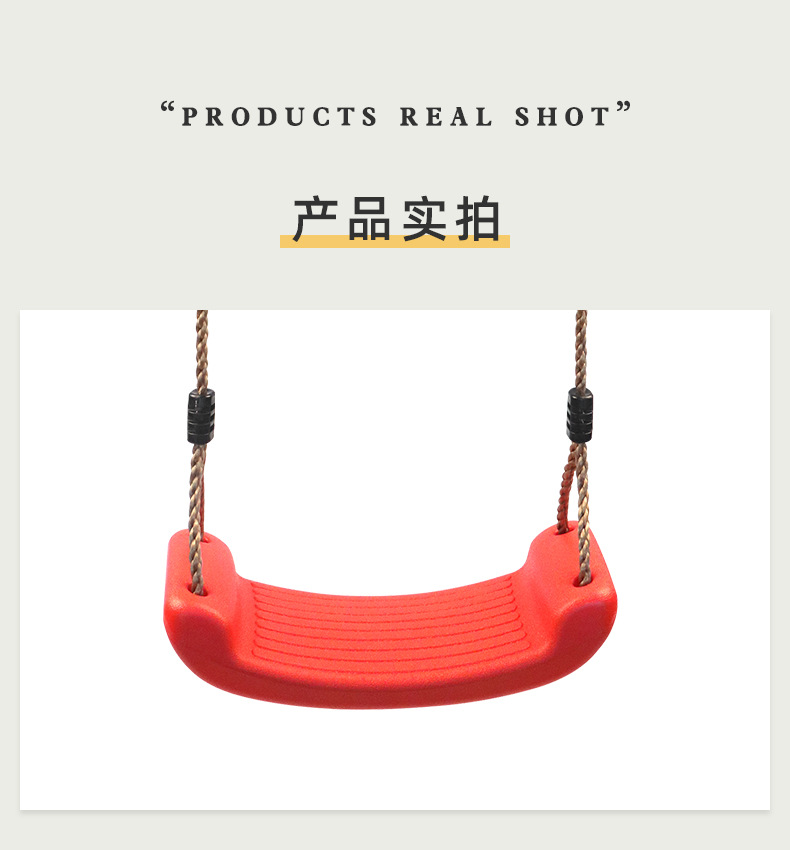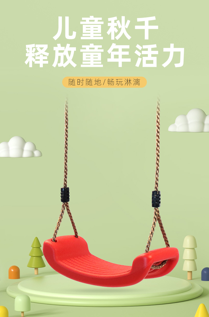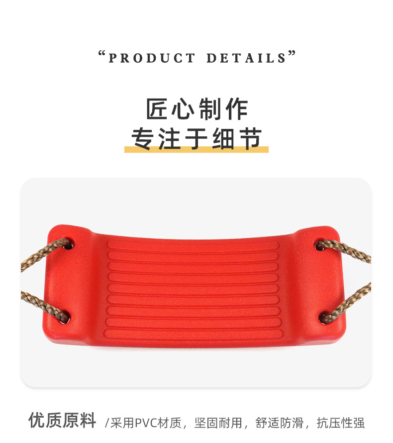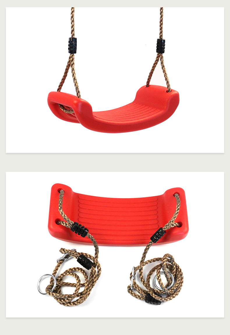 此秋千为环保塑料制成,环保,秋千板面有条纹设计,增加摩擦,防止宝宝滑出;背面有凹槽设计,增加承重力,让宝宝玩得更放心,玩得更开心。