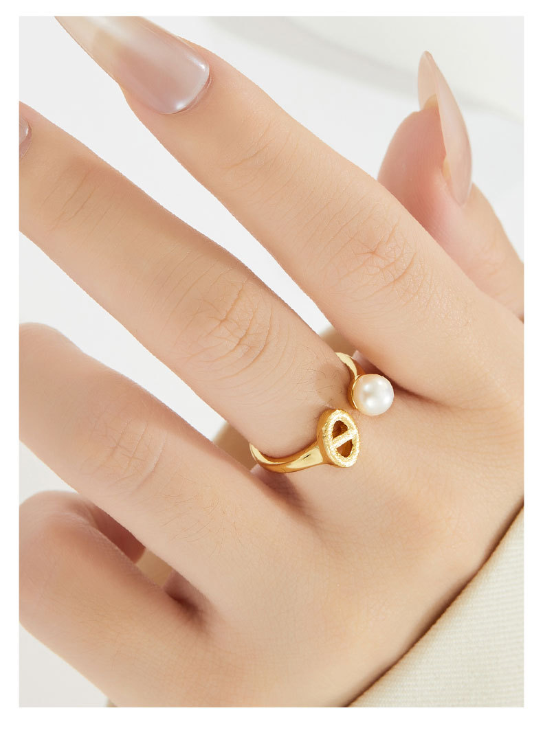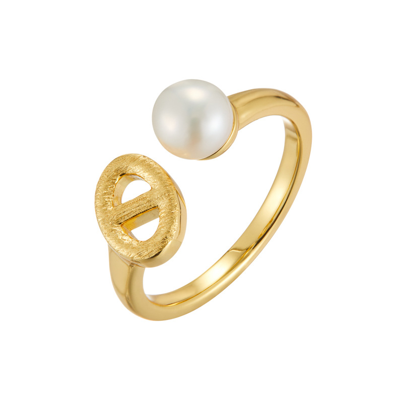 时尚又精致猪鼻子开口戒指手工拉丝淡水珍珠可调节食指戒新款指环