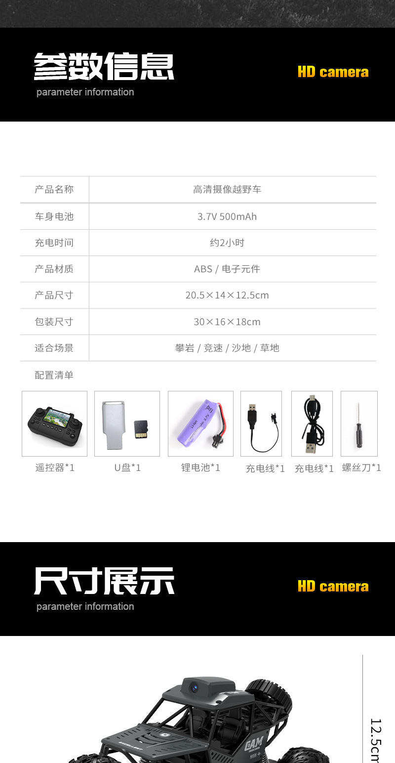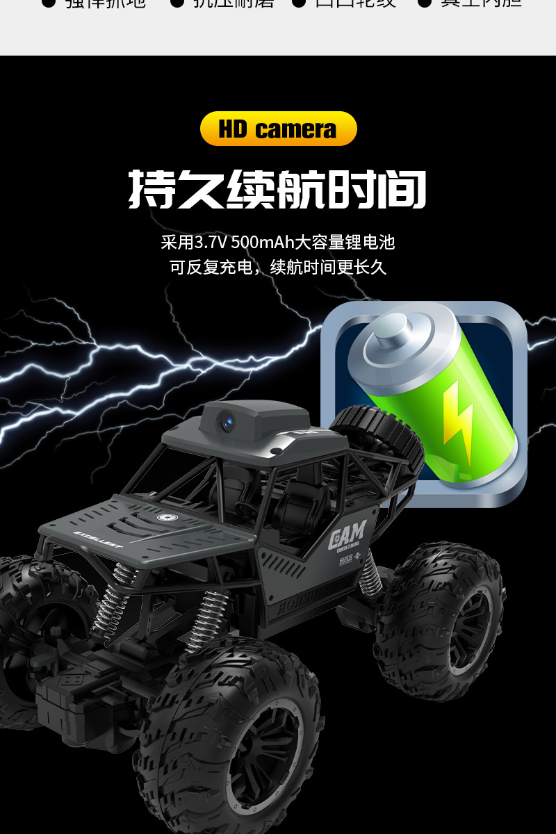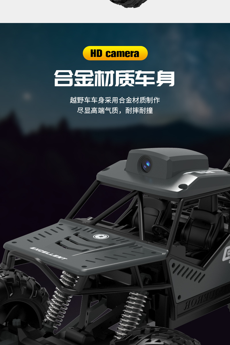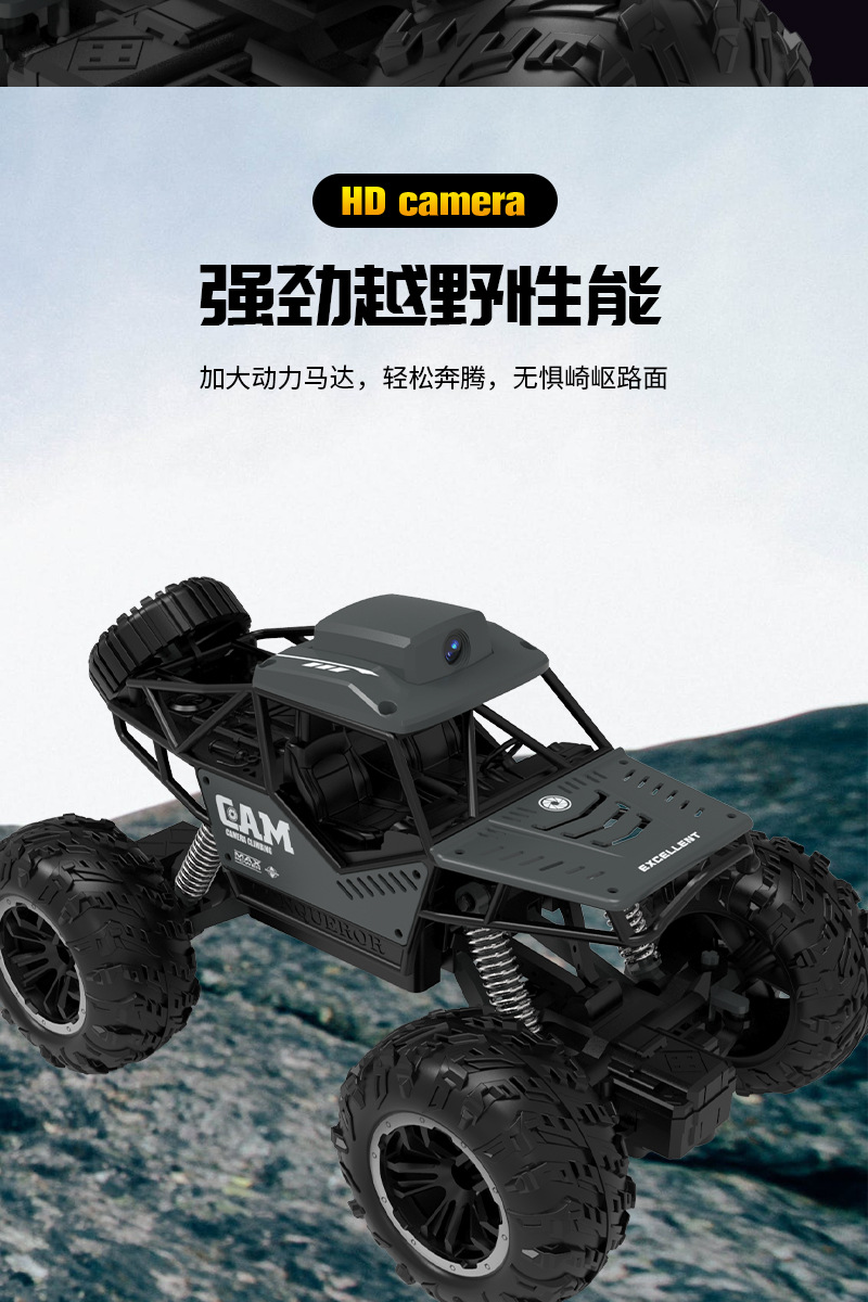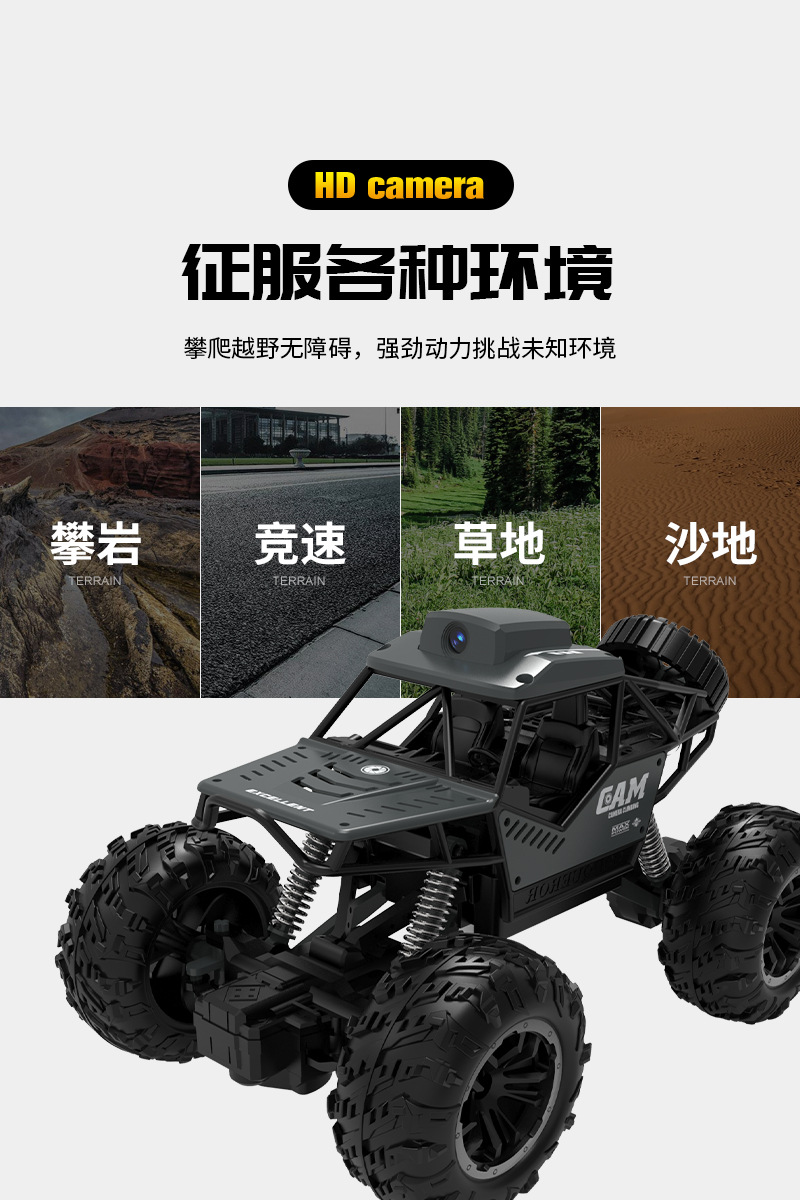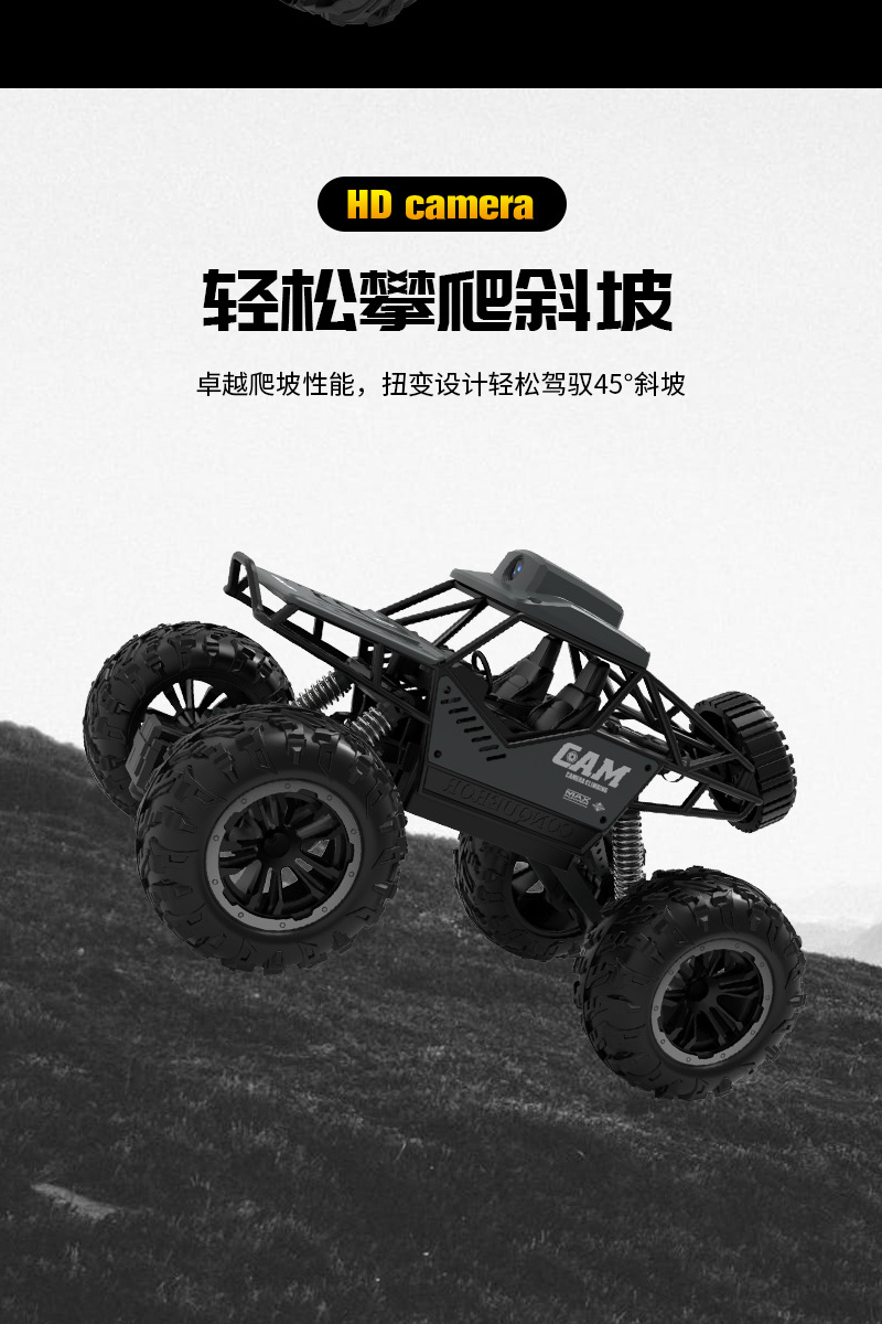 产品功能:产品采用2.4G遥控技术,不受同类产品干扰。强劲越野攀爬性能,不受场地限制,无论是沙地、泥浆、石头、崎岖山路等。结构操控仿真,前进后退,左右转。 四通攀爬车,遥控上液晶屏可实时看画面 拍照 录像 可插内存卡,照片录像储存到内存卡中,可以回放。 配内存卡和读卡器