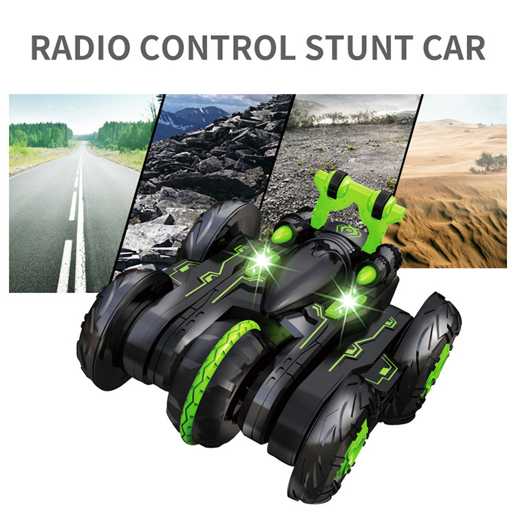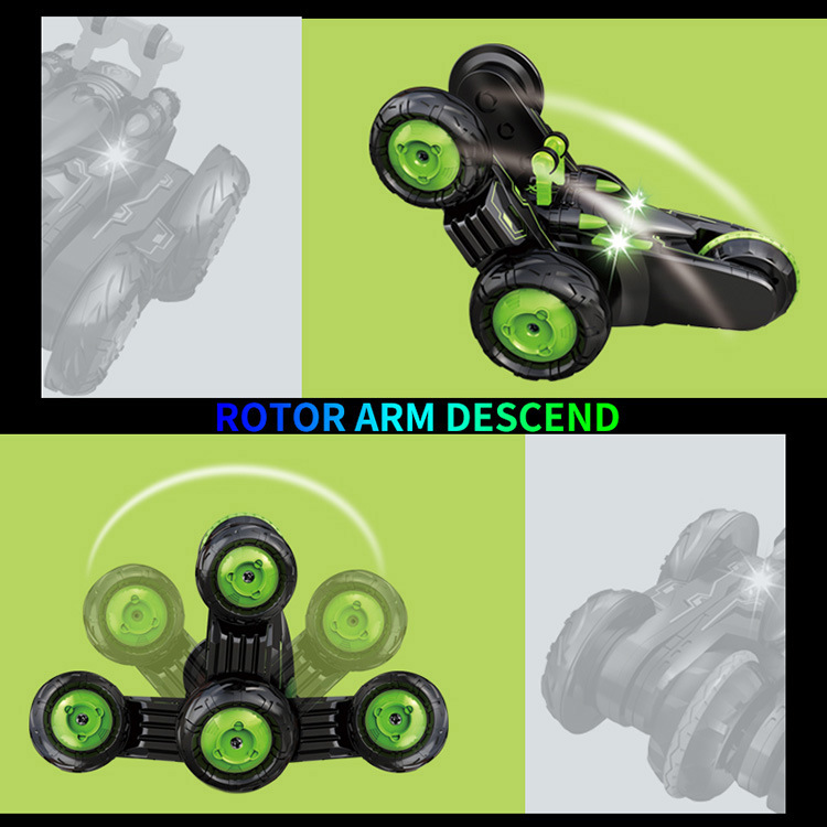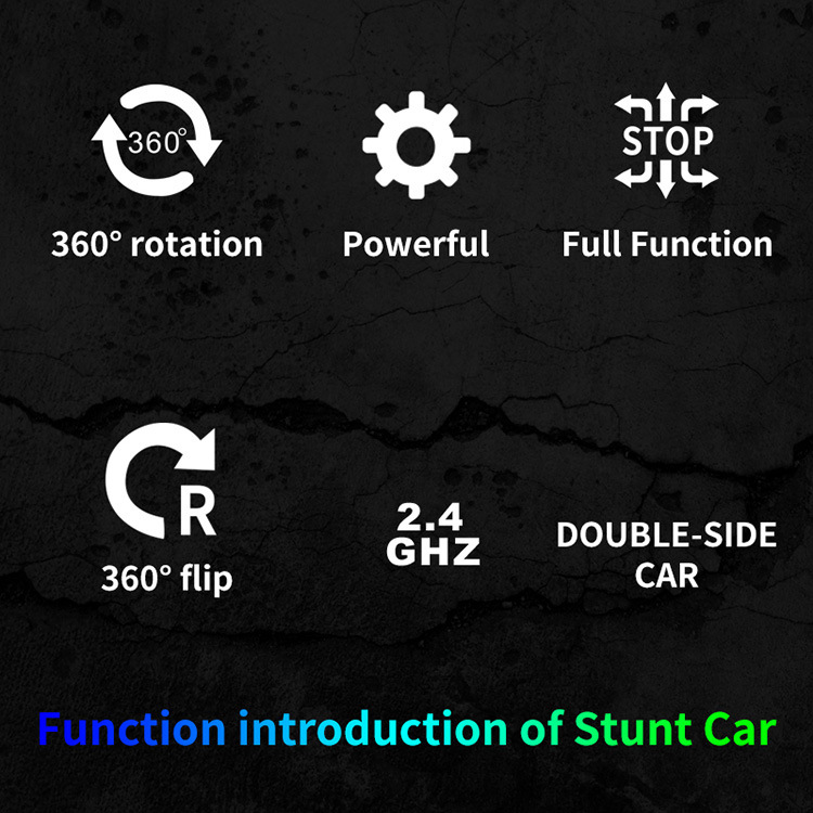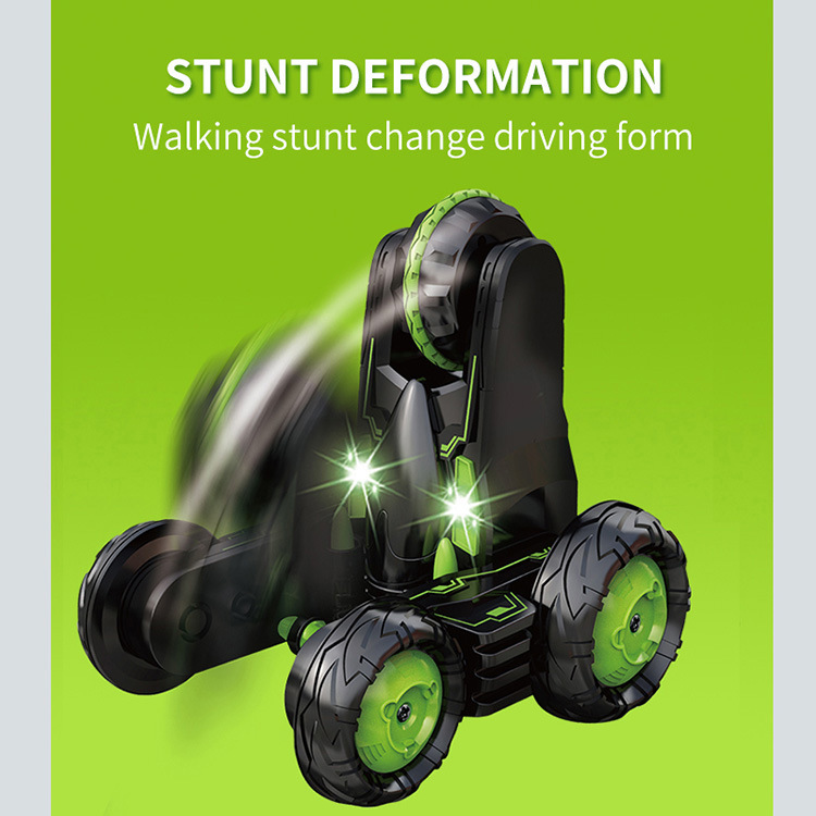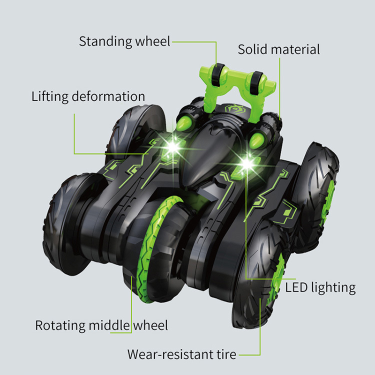 前进、后退、左转、右转。360度旋转,360度翻转。90度站立行驶,变形,有灯光。