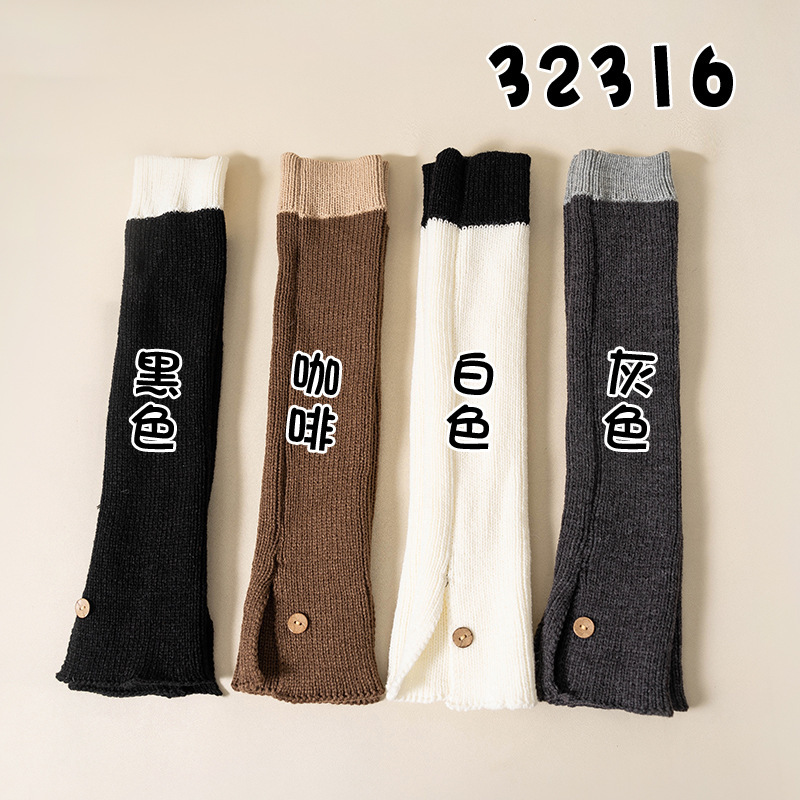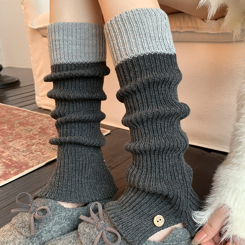靴尚棉袜套女拼色针织堆堆袜秋冬复古毛线JK纽扣灰色高筒小腿袜