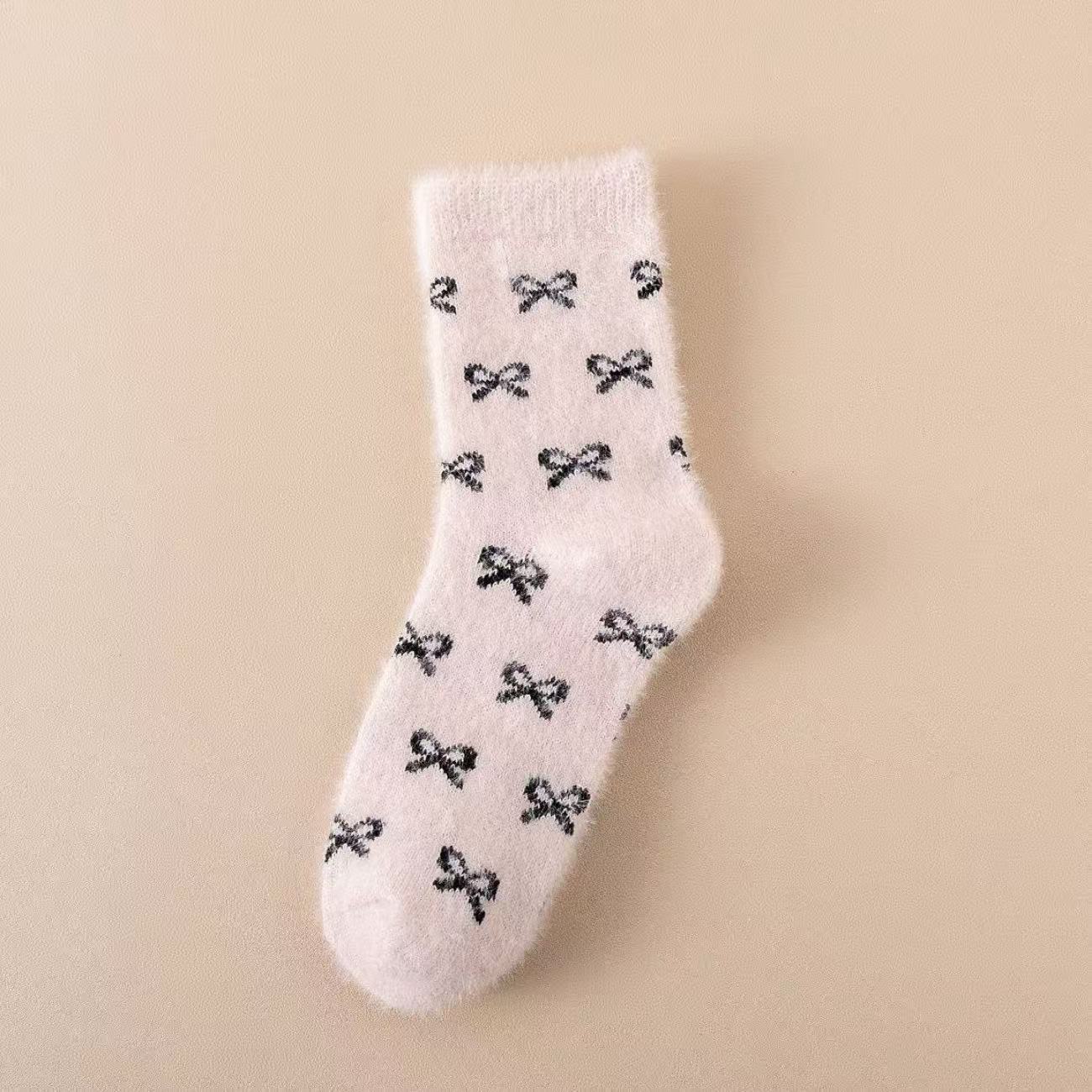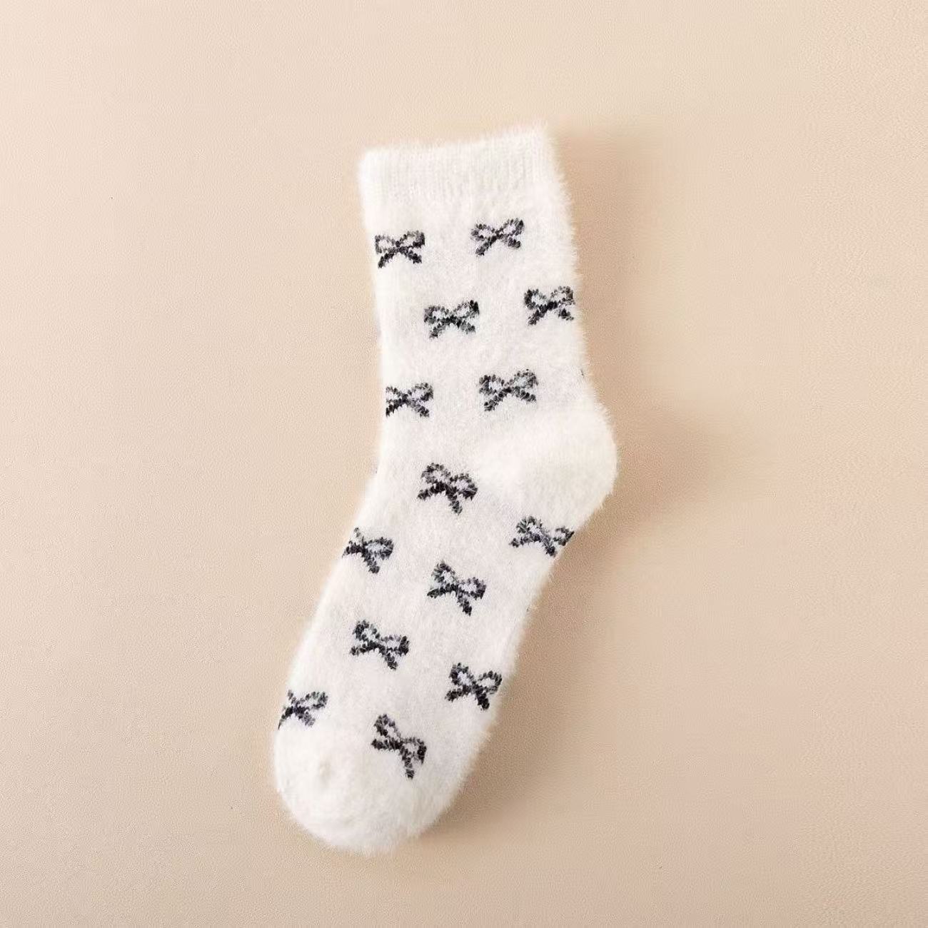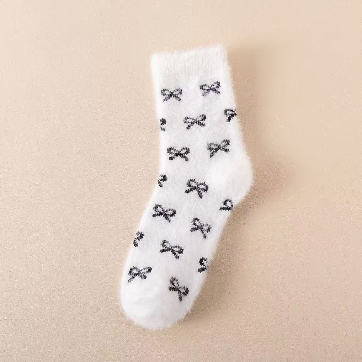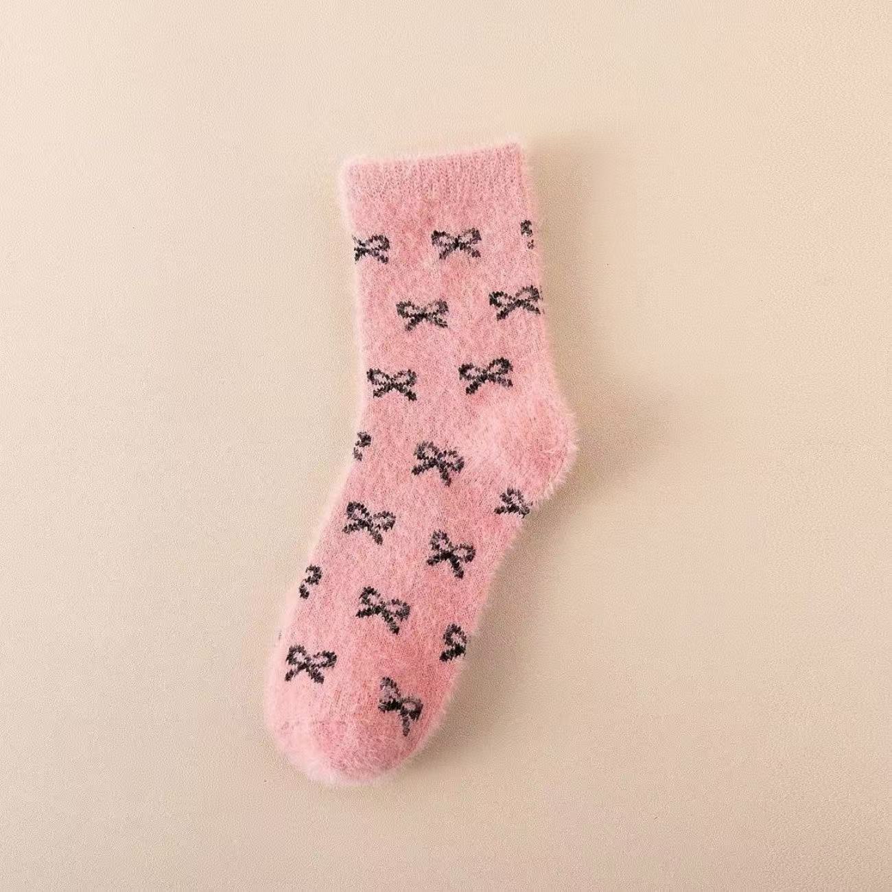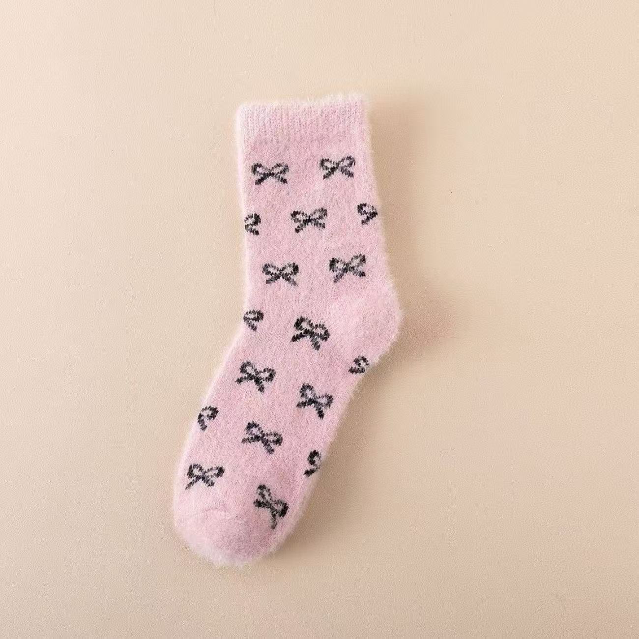 秋冬粉色水貂绒袜子女中筒加绒加厚毛茸茸家居舒适月子袜蝴蝶结