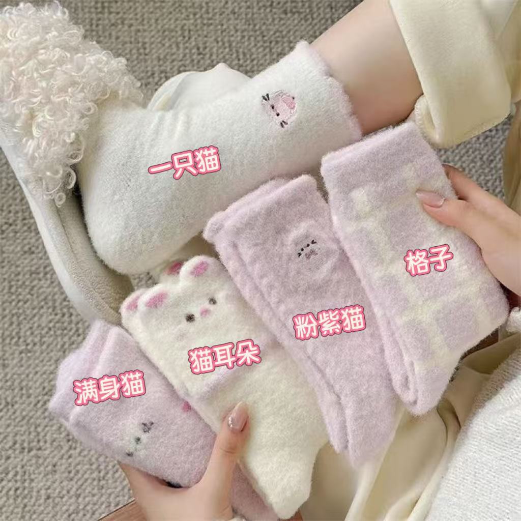 冬季粉色系袜子女加绒加厚中筒袜可爱卡通长袜保暖袜毛绒绒睡眠袜 投诉