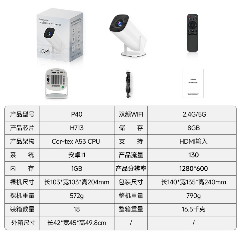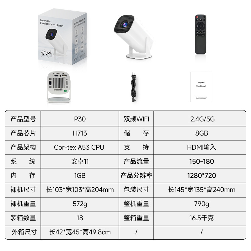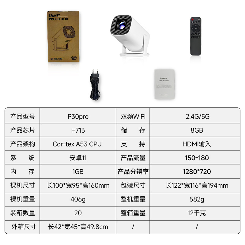 5、产品包装标配包括:投影仪+电源+遥控器+说明书。