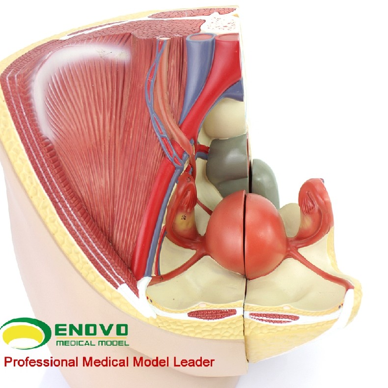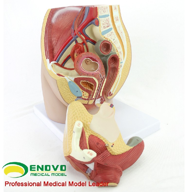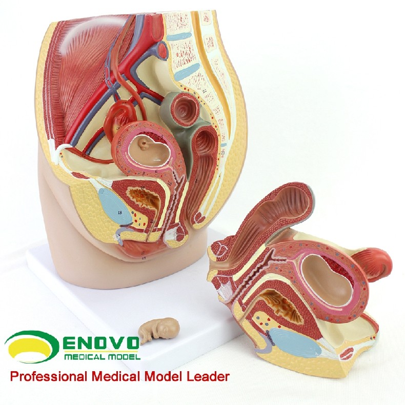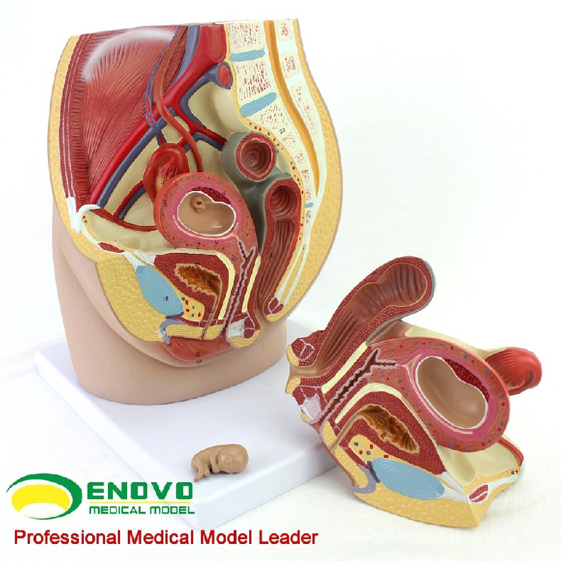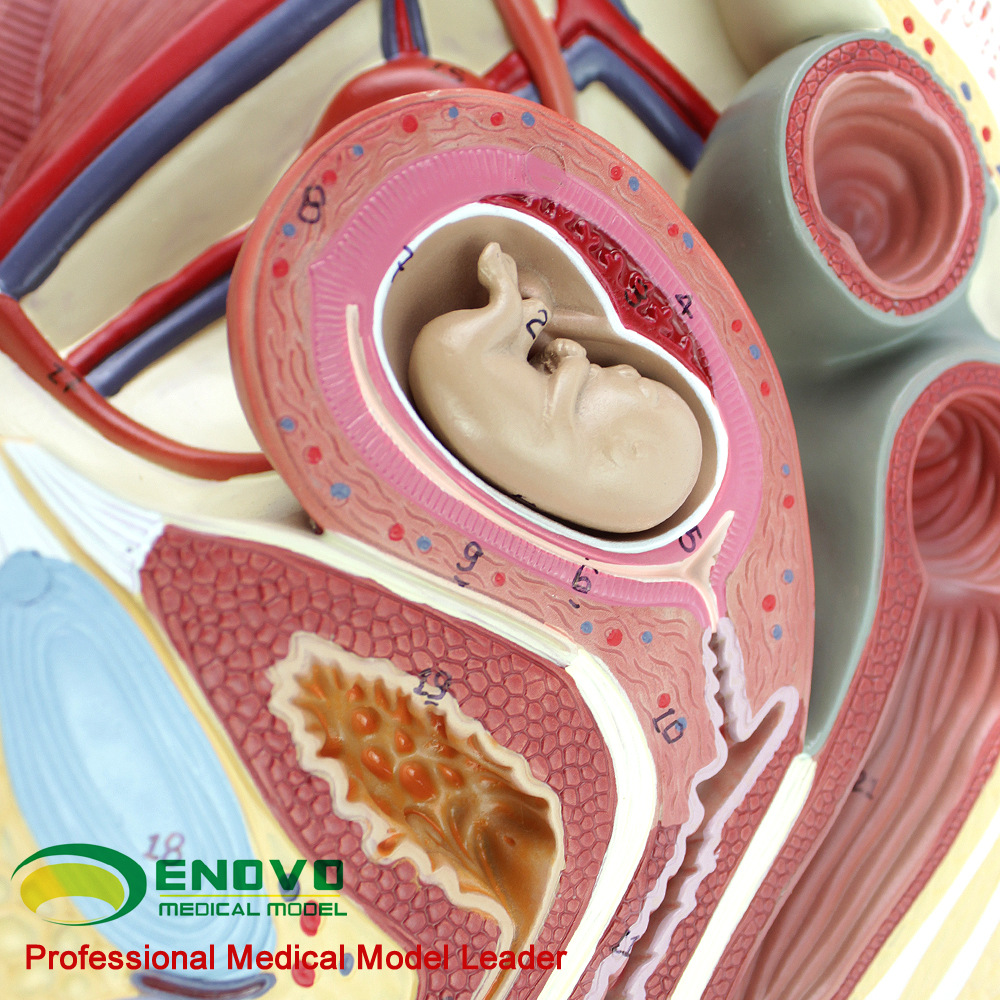 这个真人大小的模型,可拆分三部分组成,展示了女性盆腔系统的所有重要结构,并且非常详细地展示了腹腔和骨盆肌,女性泌尿生殖系统的内部结构,并且在子宫内部加了一个8周内的胎儿,展现了胎儿和子宫的关系,非常详细描绘。全部手工上色,并且配有数字指示标识