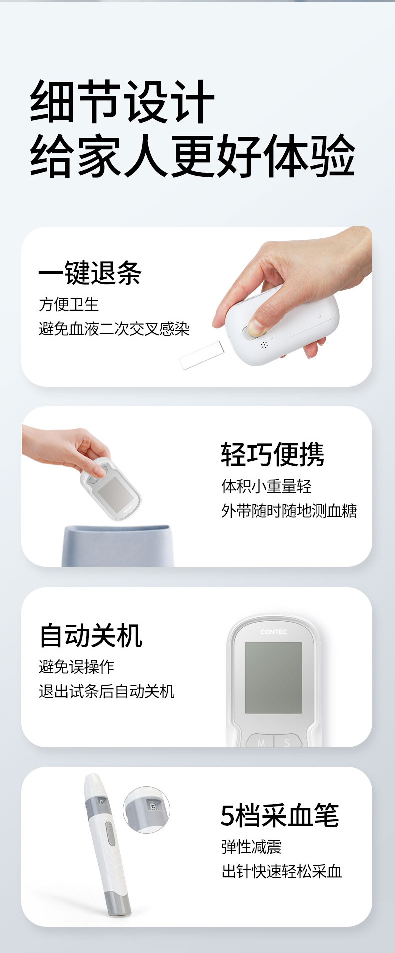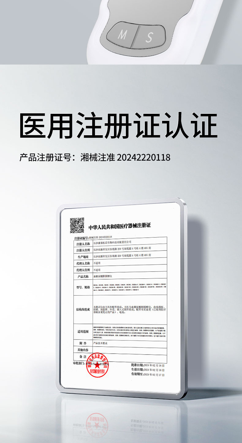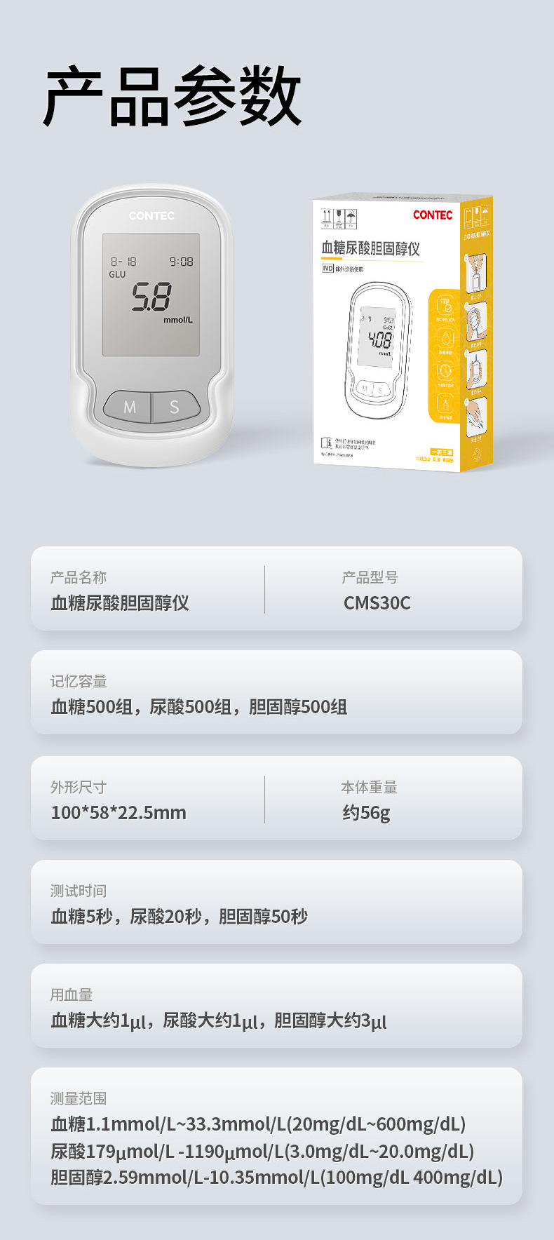 材质: ABS 品牌: Contec 类型: 血糖/尿酸/胆固醇检测 药(械)准字: 湘械注准20242220118 是否一次性: 否 颜色: 灰色 货号: CMS30C 产地: 湖南省长沙 外形尺寸: 100mm(长)×58mm(宽)×22. 重量: 约56g 测量时间: 血糖5秒,尿酸20秒,胆固醇50秒
