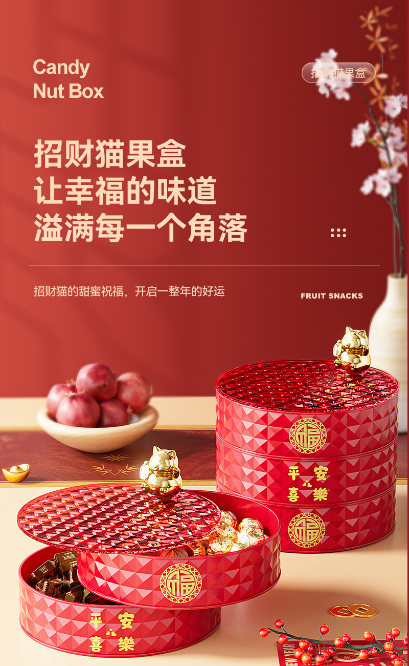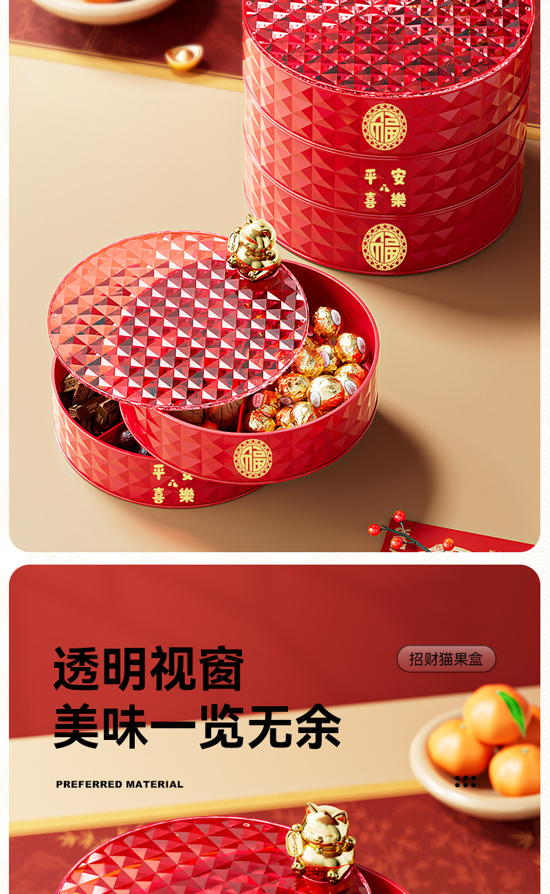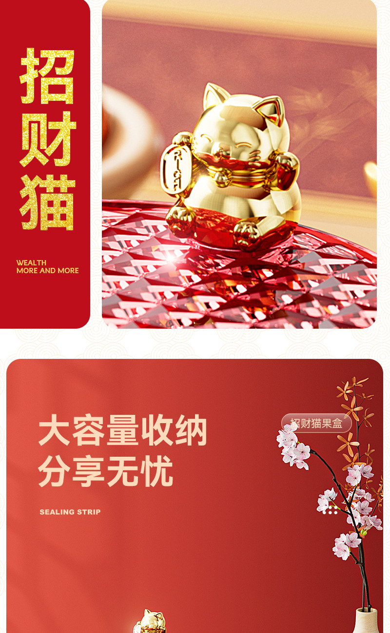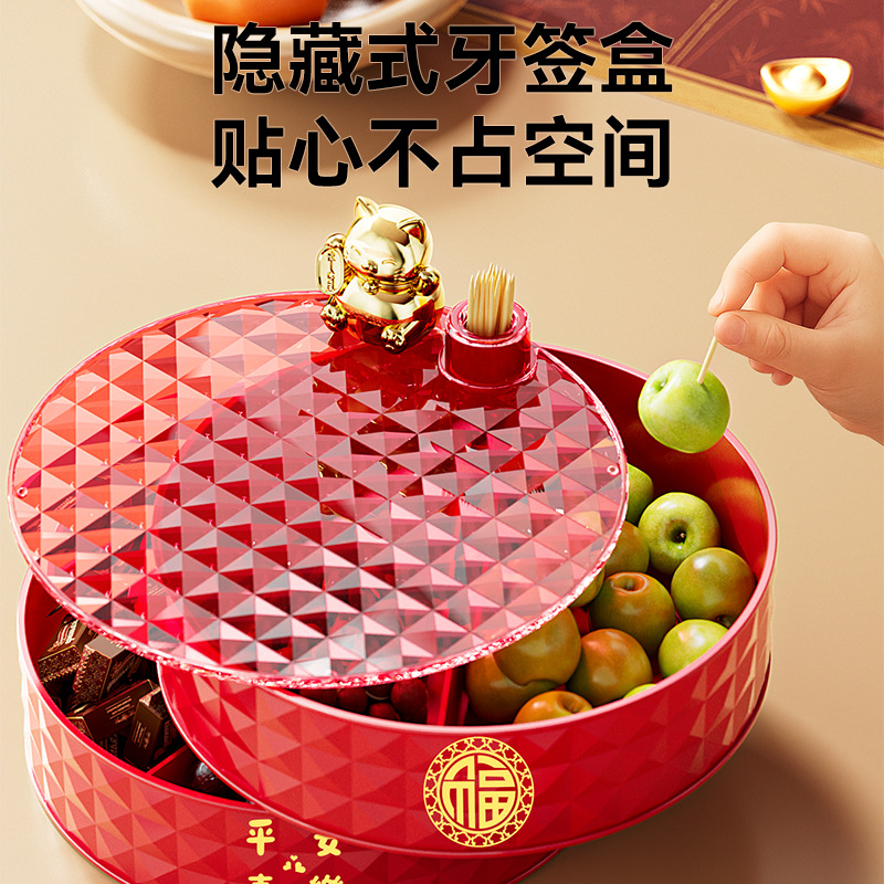 新年果盘轻奢招财猫家用客厅可旋转分格糖果盒干果盘坚果盒水果盘