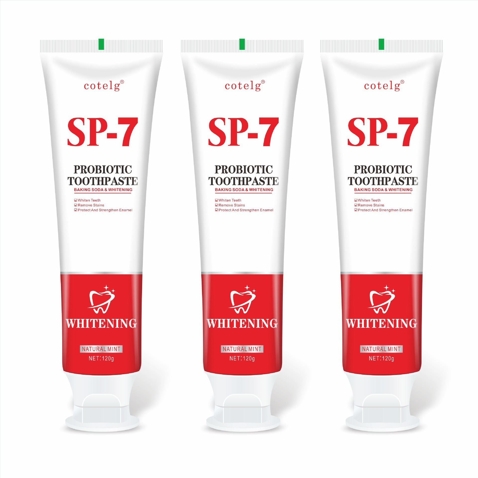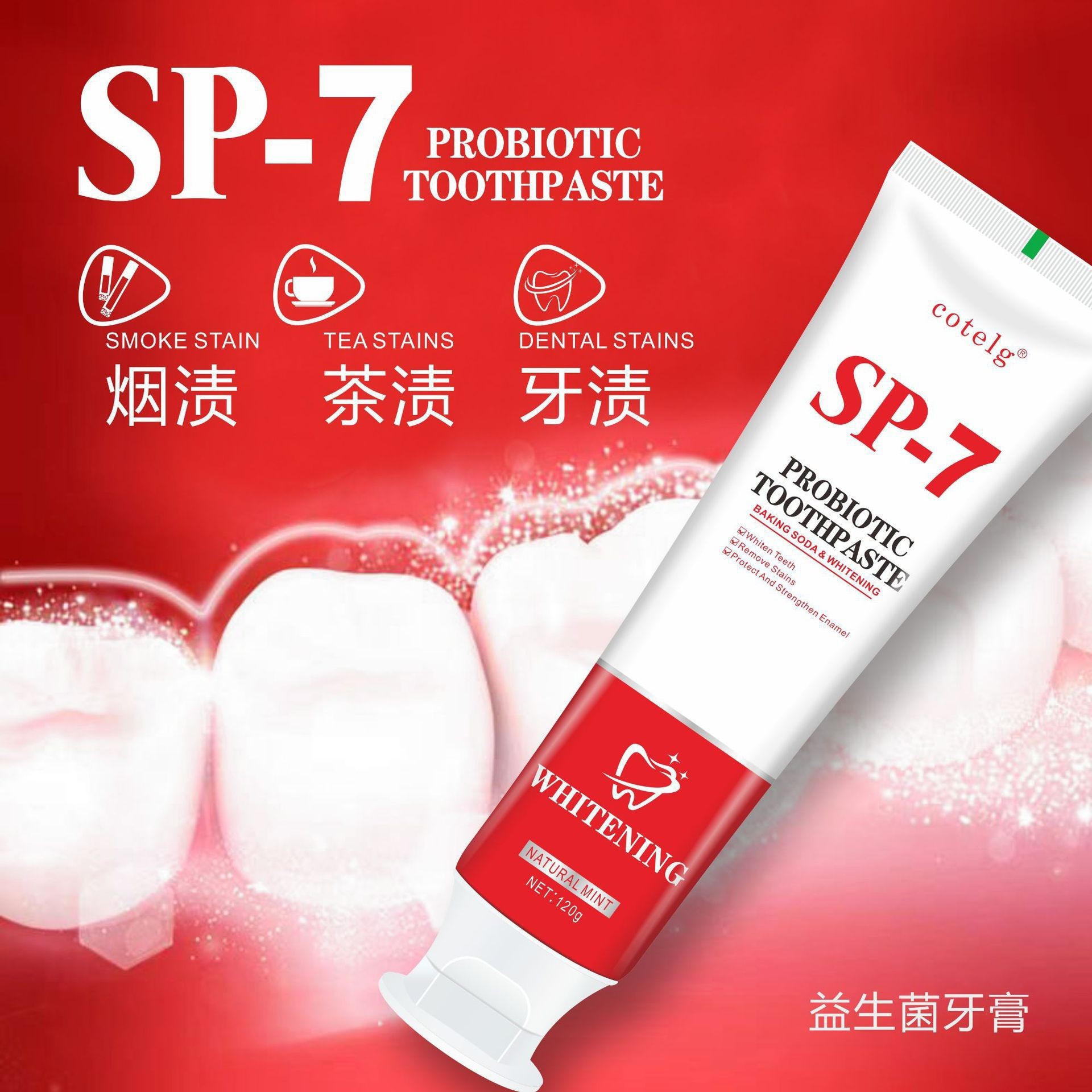 品牌: cotelg 功效: 清洁 品牌类型: 国货品牌 净含量: 120g 香型: 薄荷 是否进口: 否 商品条形码: 6912312123121 功能: 去牙渍 适用对象: 通用 产地: 广州 保质期: 3年 规格类型: 72支/箱 是否含氟: 否 是否量贩装: 否 主要下游平台: 亚马逊 主要销售地区: 东南亚 有可授权的自有品牌: 否 是否跨境出口专供货源: 是 组合: 12支*6组 颜色分类: SP-7英文版-120g 重量: 0.18 kg/支