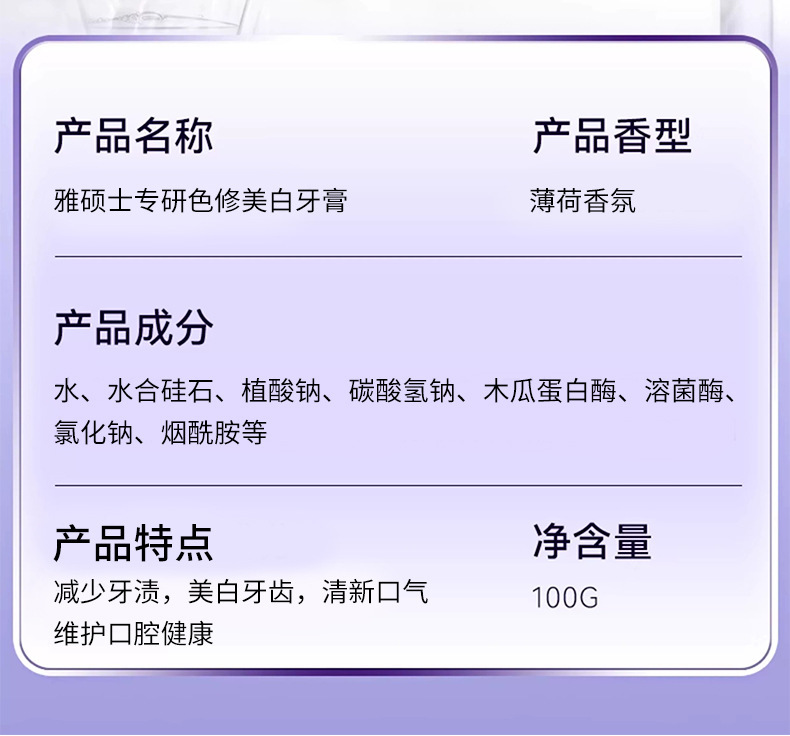 品牌: 雅硕士 功效: 美白 品牌类型: 国货品牌 净含量: 100g 香型: 薄荷 是否进口: 否 商品条形码: 6978598220442 功能: 美白 适用对象: 通用 产地: 广州 箱装数量: 72 保质期: 三年 规格类型: 常规 是否含氟: 否 是否量贩装: 否 主要下游平台: ebay,亚马逊,wish,速卖通,独立 主要销售地区: 非洲,欧洲,南美,东南亚,北美,东北亚, 有可授权的自有品牌: 是 是否跨境出口专供货源: 是 型号: 300 重量: 0.16 kg/支