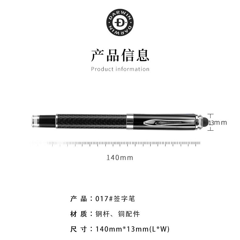 达尔文制笔017#签字笔配置推荐搭配人民币报价3.8元(不含税);钢管(打磨)+上杆3遍烤漆+真碳纤维下杆+铜配件(打磨)+加强电镀+中性700米芯;多项专利产品,全新螺纹结构,垂直度好,不受胶水限制,专模整体芯尾无弹簧设计,反套吸附舒适,精工打磨,手感顺滑,弹簧笔尖配中性油墨设计防止溢出、风干,书写流畅顺滑,达尔文制笔拼的不仅仅是价格,提供专业制笔的解决方案!义乌没有直销点