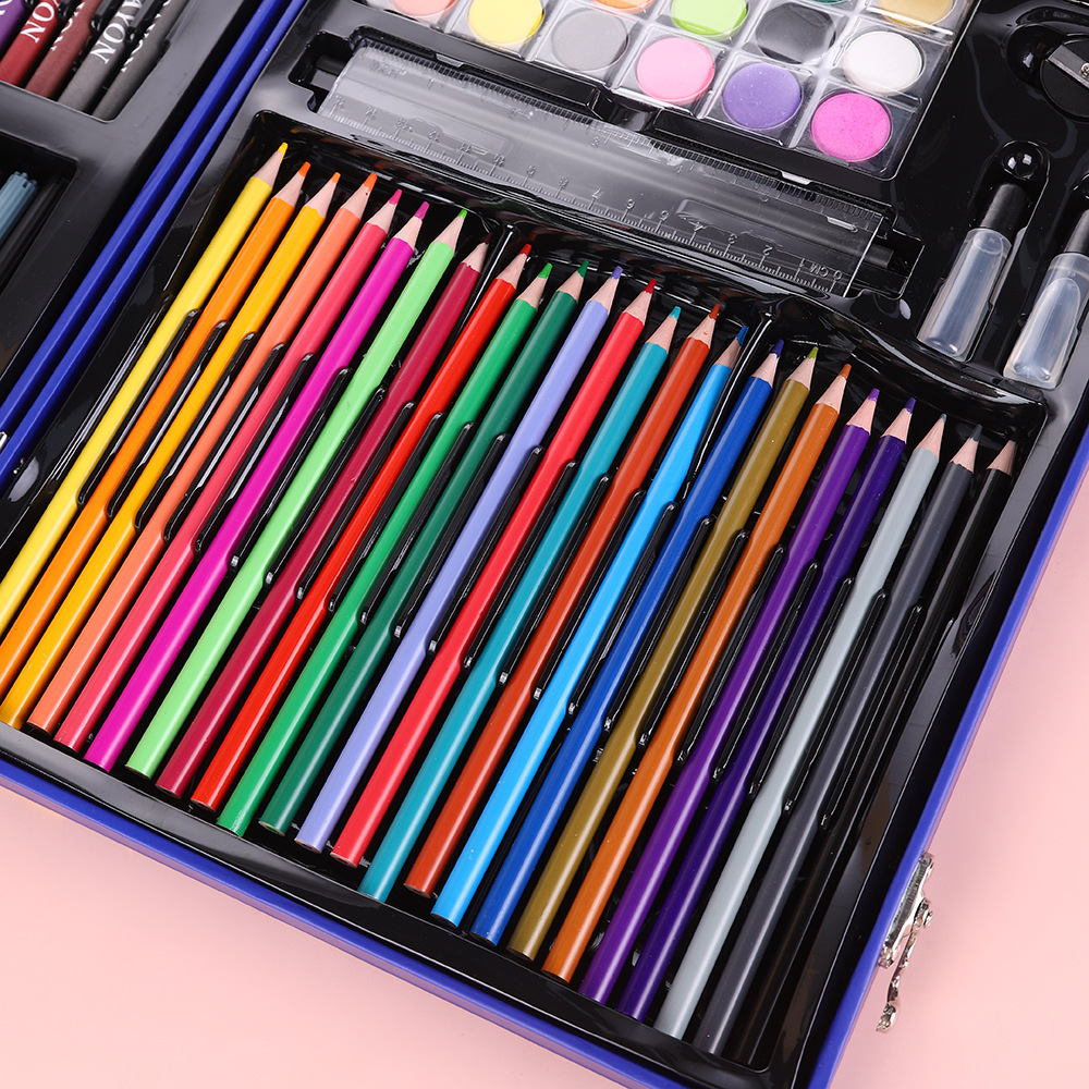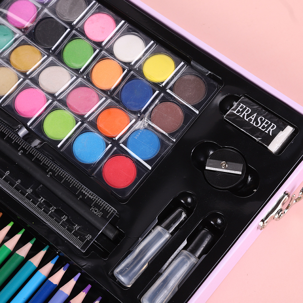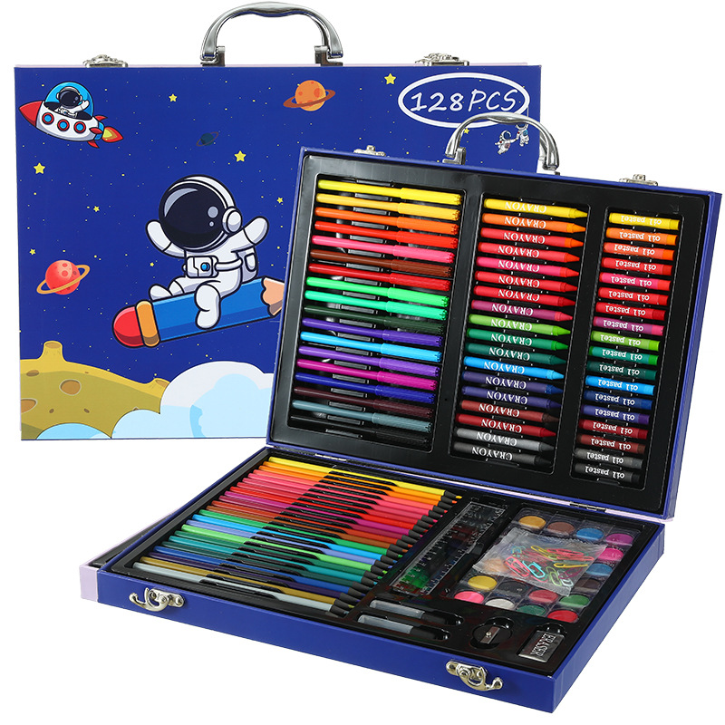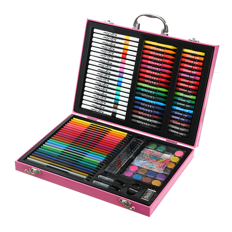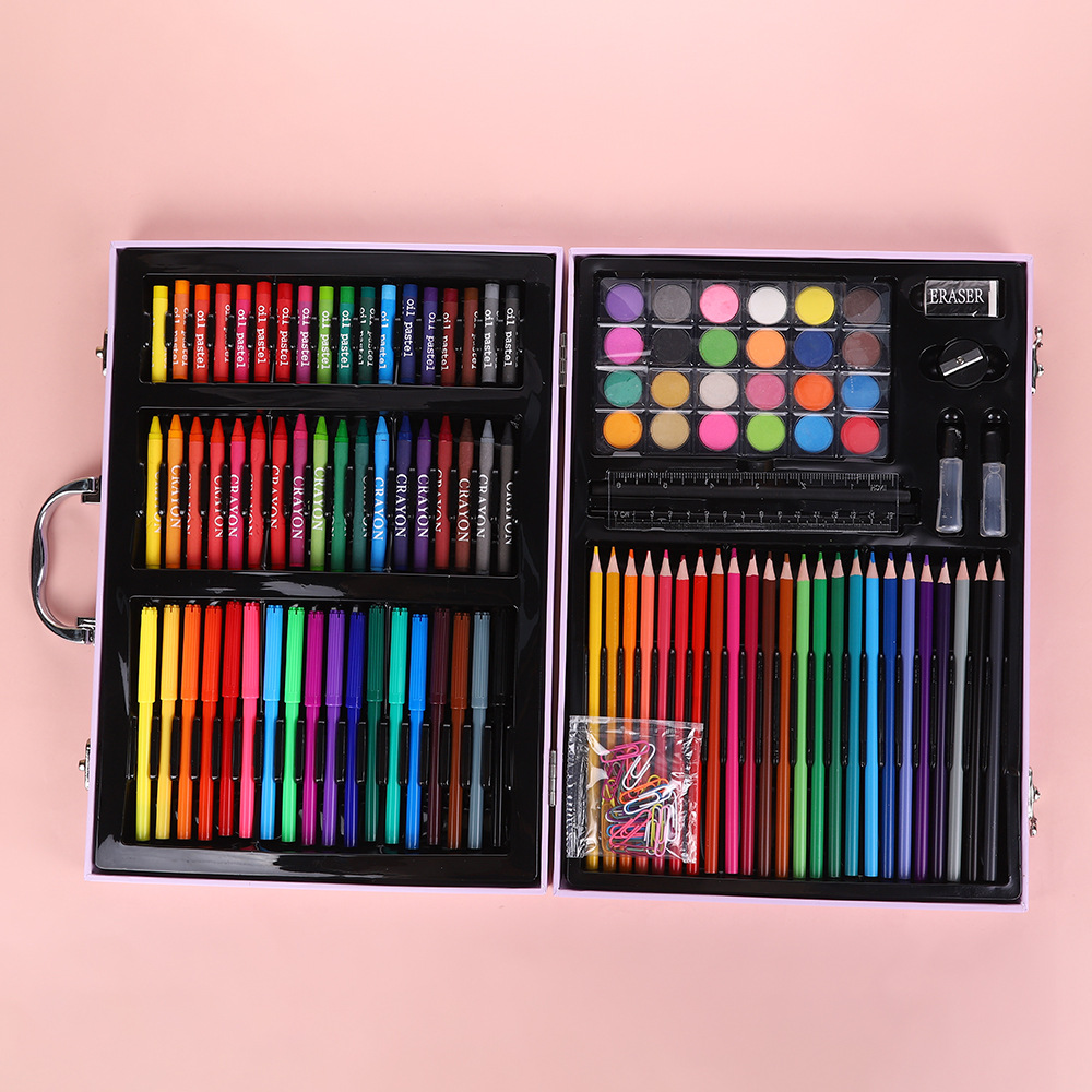 18色油画棒,18色蜡笔,18色水彩笔,24色粉饼,1块橡皮,1个卷笔刀,2个胶水,1只HB,1个毛刷,24色彩铅,20回形针