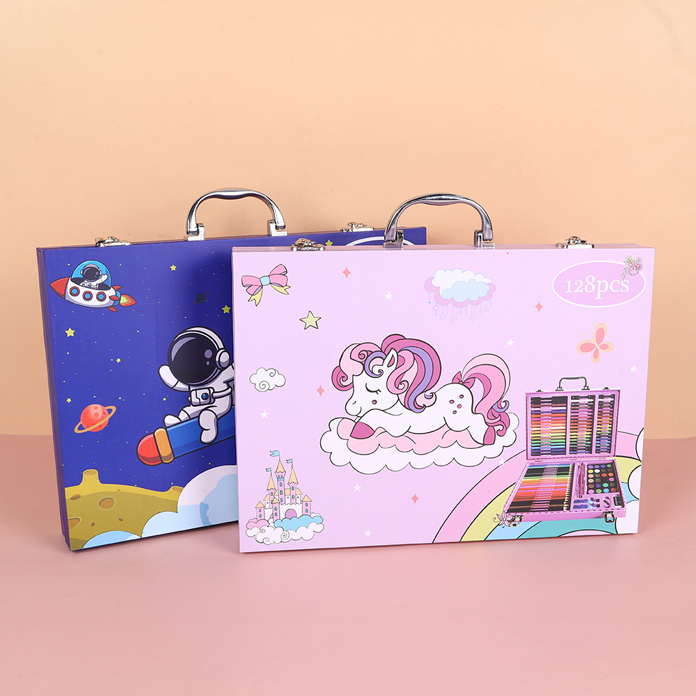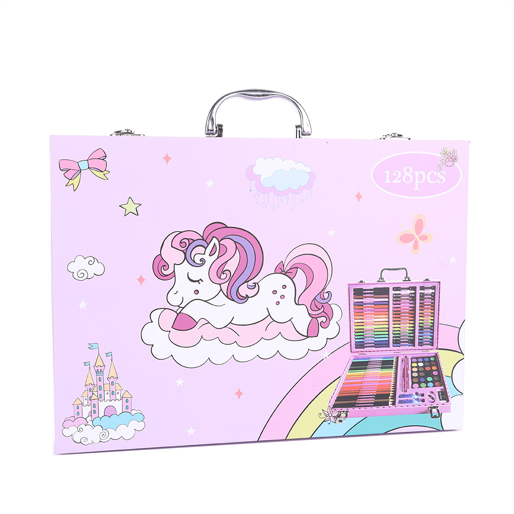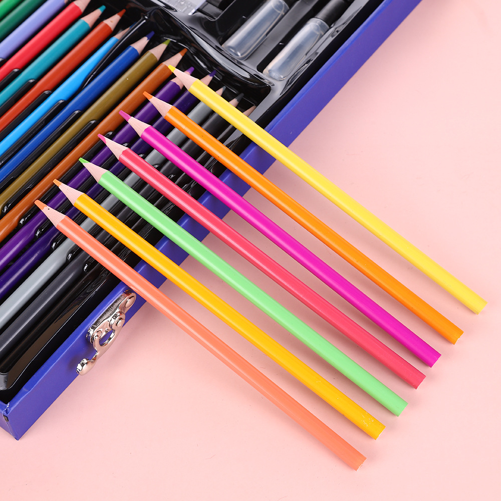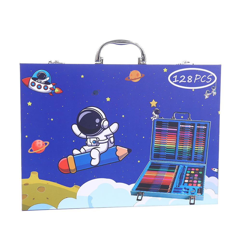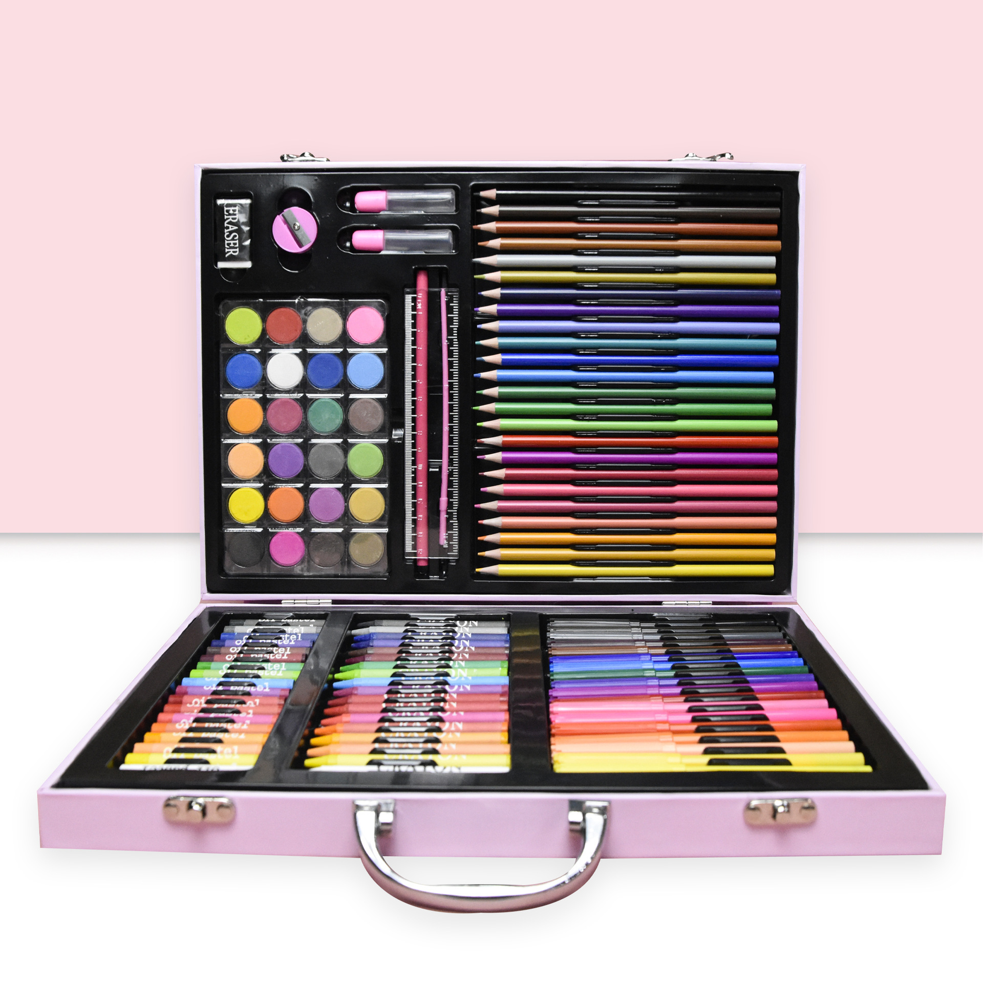 18色油画棒,18色蜡笔,18色水彩笔,24色粉饼,1块橡皮,1个卷笔刀,2个胶水,1只HB,1个毛刷,24色彩铅,20回形针