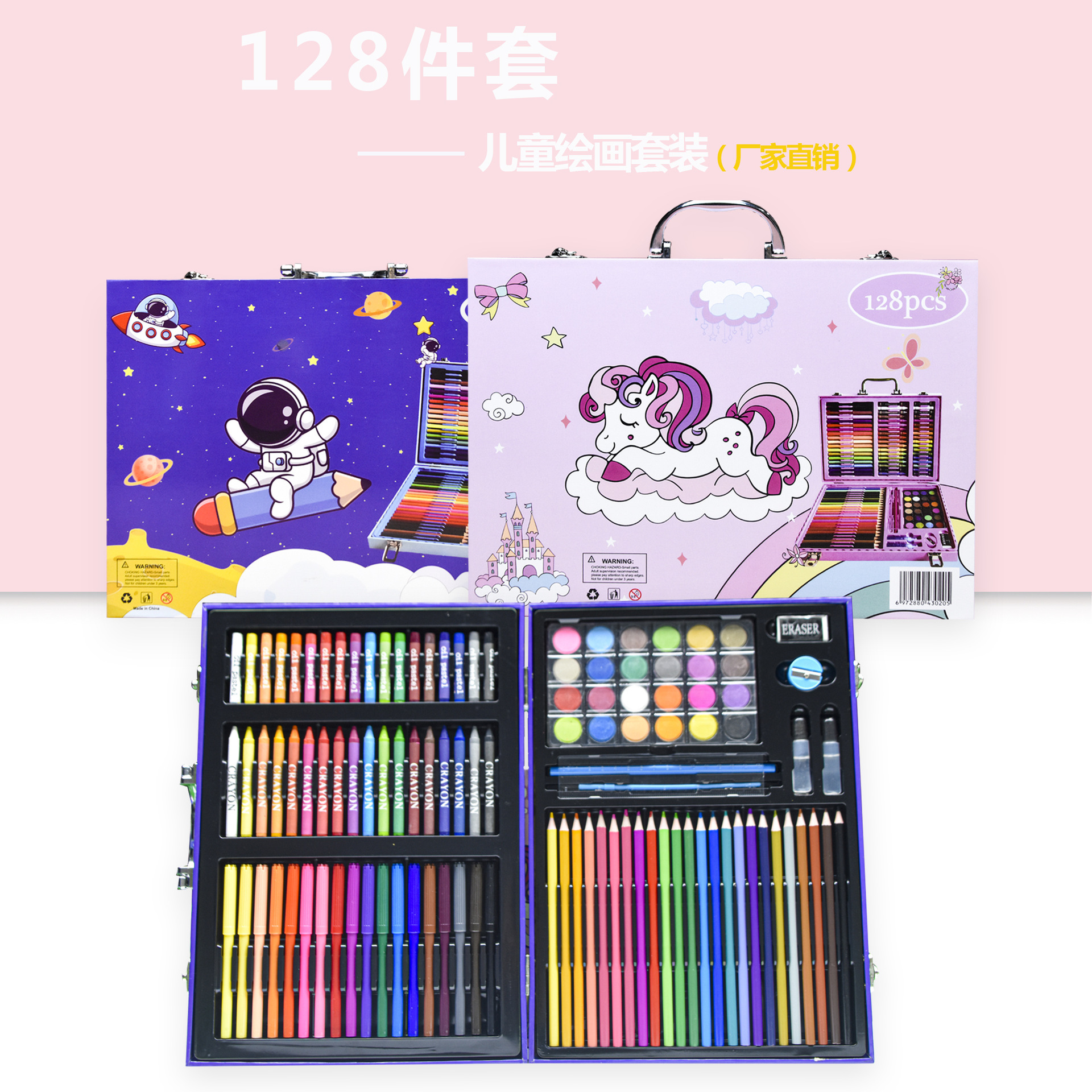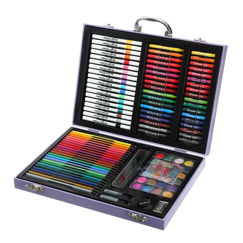 18色丙烯马克笔,18色油画棒,18色蜡笔,24色粉饼,1块橡皮,1个卷笔刀,2个胶水,1只HB,1个毛刷,24色彩铅,20回形针