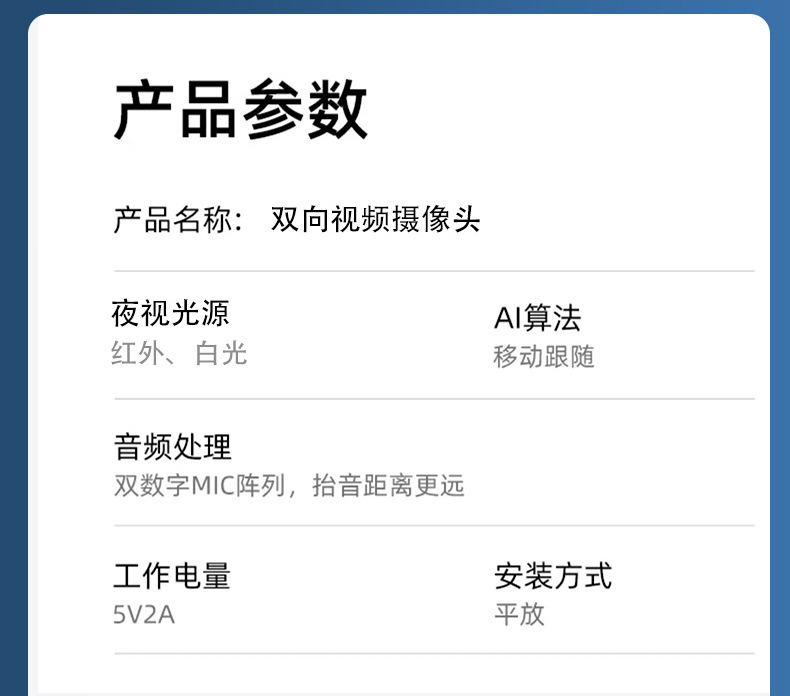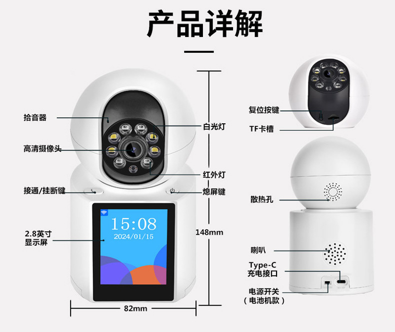 品牌: 琼斯电子 型号: 带屏监控 货号: 双向视频 上市时间: 2023.6.25 货源类别: 现货 类别: 智能监控 焦距: 3.6mm 使用环境: 室内 适用范围: 室内 机身内存: 无 有效距离: 0m(不含)-10m(不含) 清晰度: 200万(1080P) 网络协议: http 焦段: 标准 手机APP支持: 支持 摄像头路数: 1个 附加功能: 夜视效果,报警检测,报警通知 产品尺寸: 72*72*145mm 加工方式: 贴牌加工 加印LOGO: 可以 重量: 0.5 kg/套