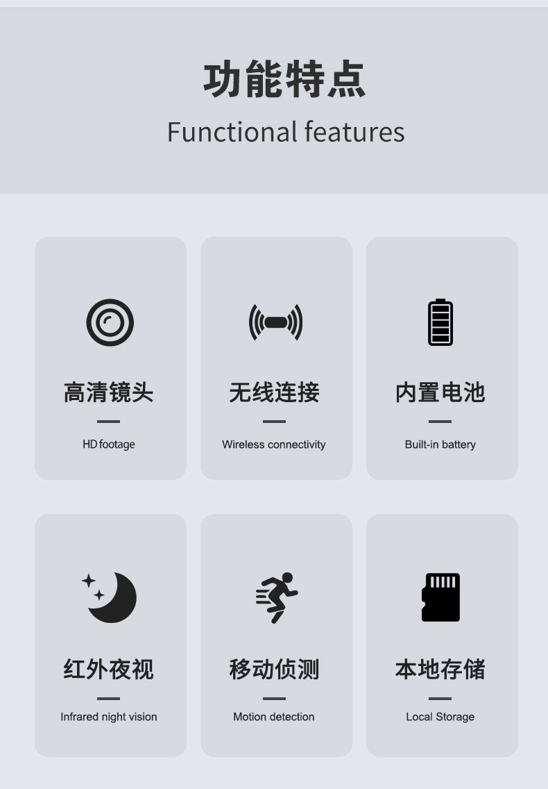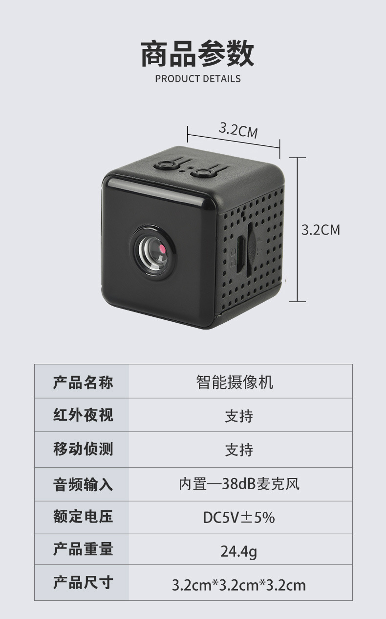 品牌: 中性 变倍变焦: 不支持变倍变焦 工作温度: -20~60℃ 使用环境: 室内 外观尺寸: 32*32*32 防水等级: 室内款,无防水功能 重量: 0.72 电压: 3.7 水平清晰度: 480P 类型: 网络摄像机 材质: ABS原材料 镜头: 2.4mm 信噪比: - 背光补偿: 支持 补充参数1: - 最低照度值: 0.05 产地: 深圳 摄像头传感器尺寸: 1/3 支架类型: 磁吸式 报警功能: 支持 重量: 0.5 kg/个