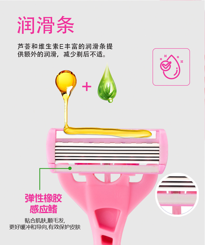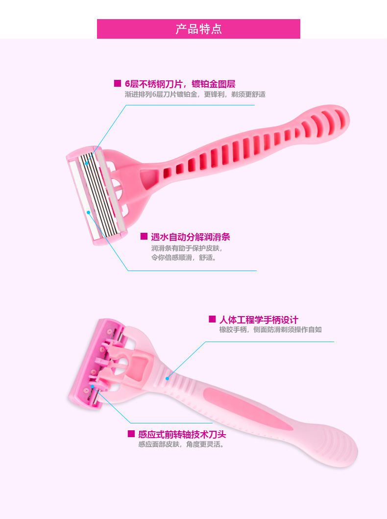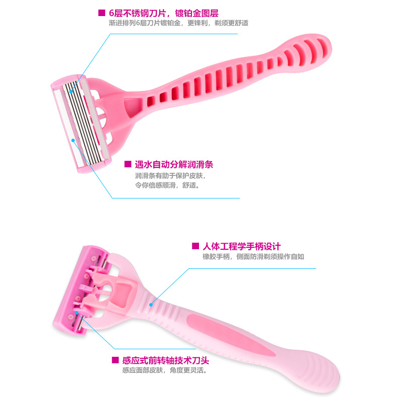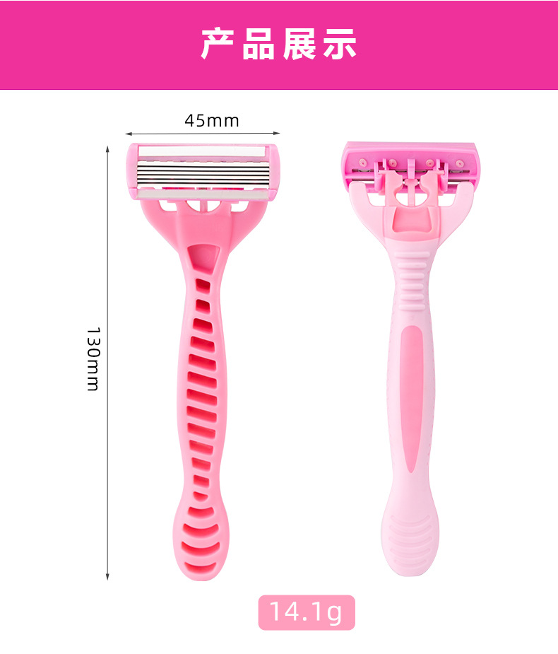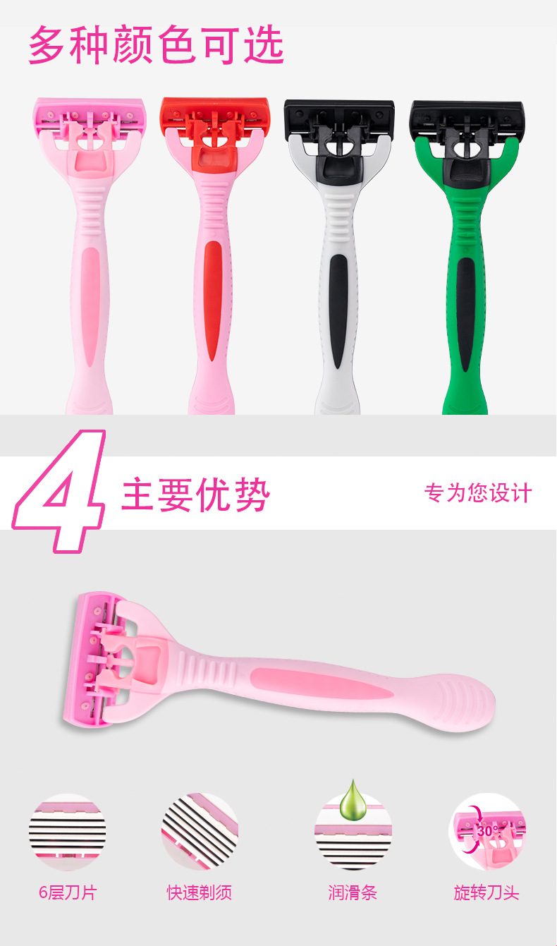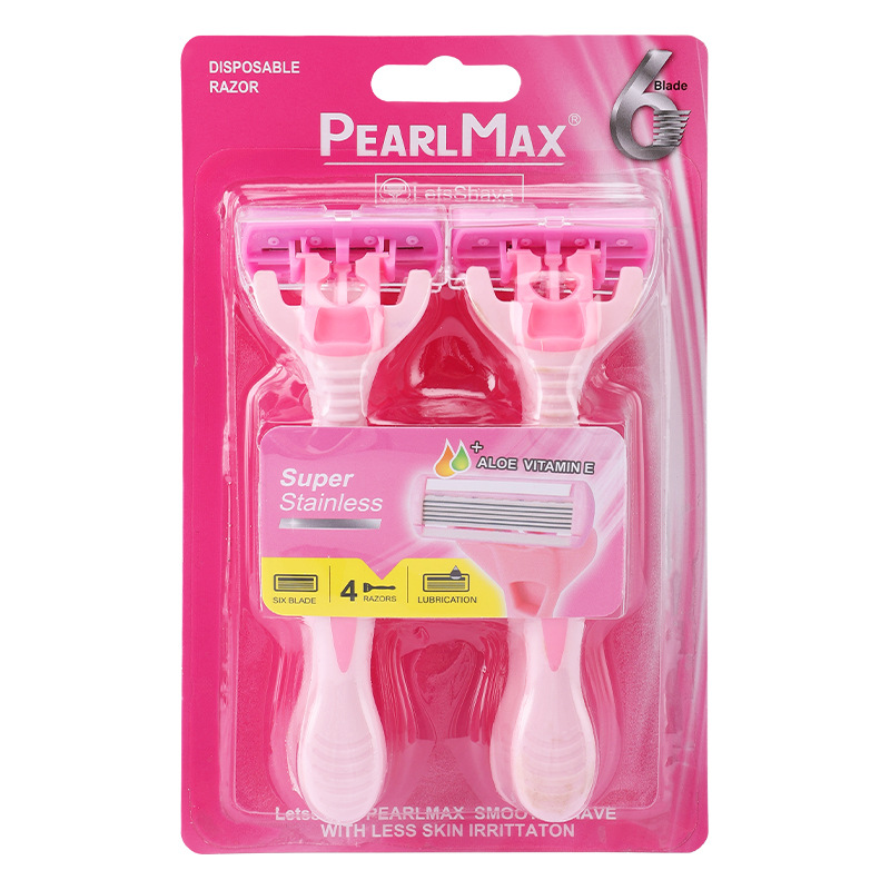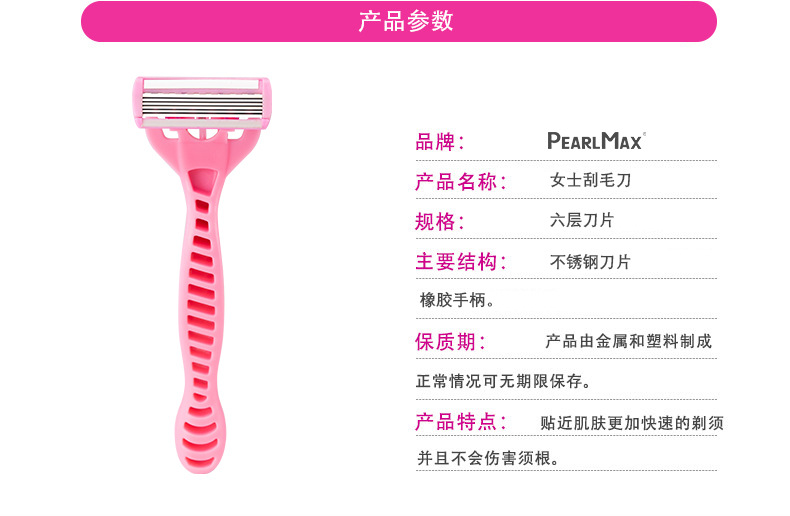 品牌: PearlMax 产品类别: 手动剃须刀 剃须刀刀片: 六层不锈钢刀片 是否进口: 否 箱装数量: 144卡(4支/卡) 主要下游平台: ebay,亚马逊,wish,速卖通,独立 主要销售地区: 非洲,欧洲,南美,东南亚,北美,东北亚, 有可授权的自有品牌: 否 是否跨境出口专供货源: 是 颜色: 粉色,绿色 是否有专利: 否 箱重: 14KG 箱规: 50*35*58 重量: 1.0 kg/套