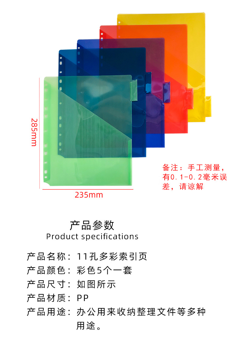 类型: L型夹 材质: PP 品牌: IDEALINK 尺寸: 235 X 285 适用纸张尺寸: 美规letter size 夹具尺寸: 11孔 货号: SH16880048 型号: A4活页夹 规格: 美规-彩色5页套装 加印LOGO: 可以 加工定制: 否 板材厚度: 0.16 尺寸(宽x长): 美规11孔 主要下游平台: ebay,亚马逊,wish,速卖通,LA 主要销售地区: 欧洲,南美,东南亚,北美,中东 有可授权的自有品牌: 否 是否跨境出口专供货源: 是 是否属于礼品: 否 是否专利货源: 否 源头工厂: 5tab分隔页3孔彩虹索引分隔活页袋标签 重量: 0.2 kg/套