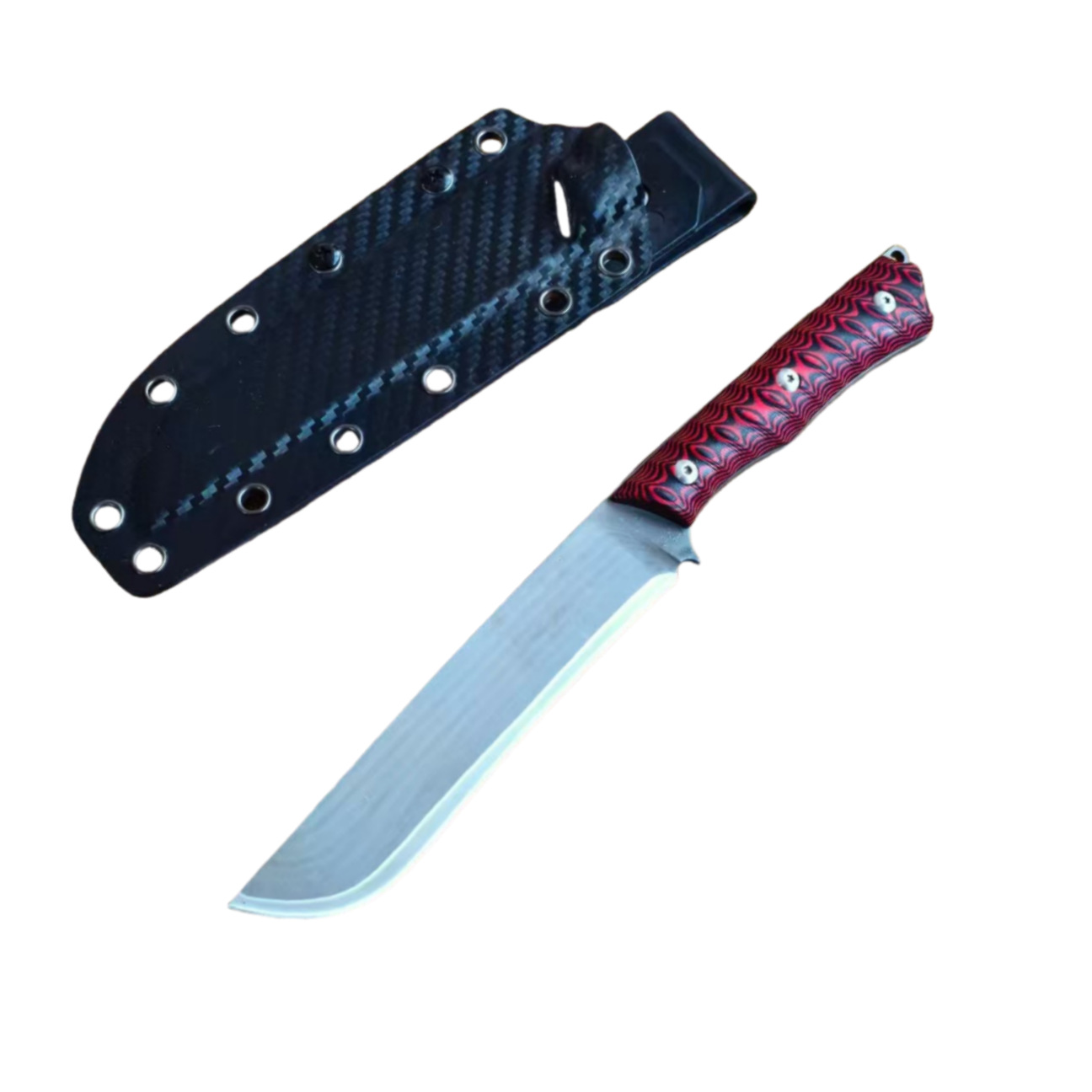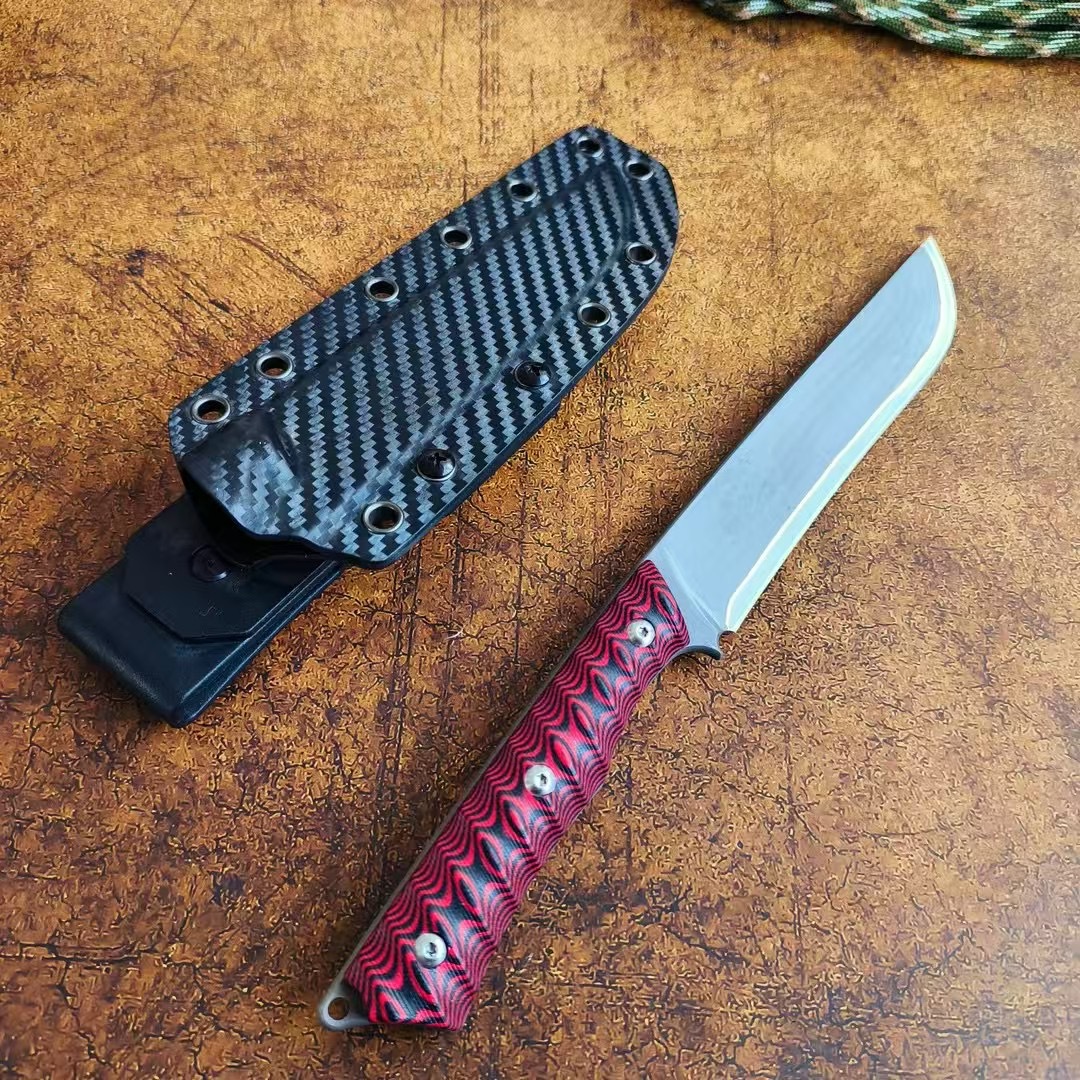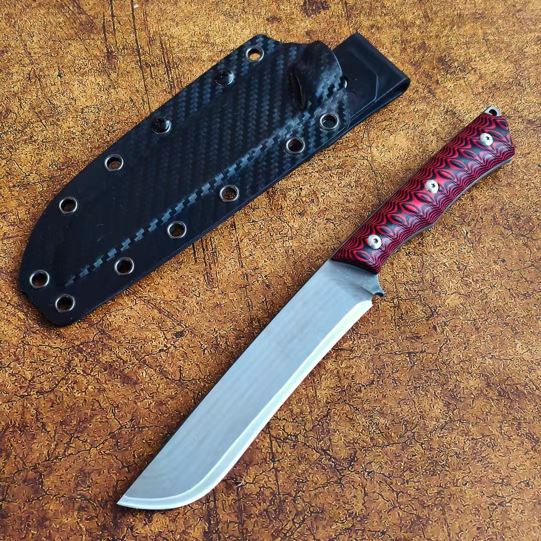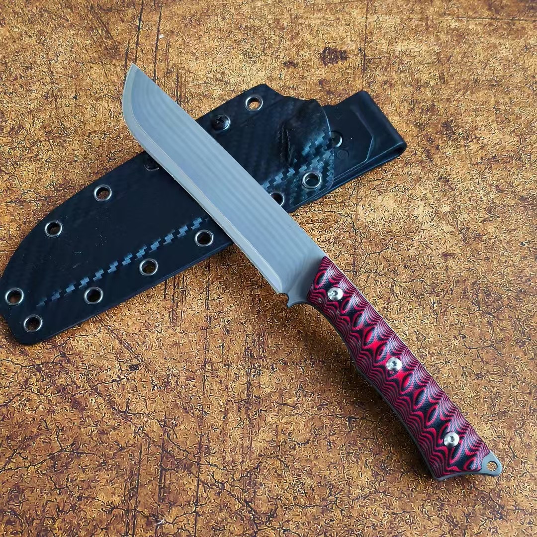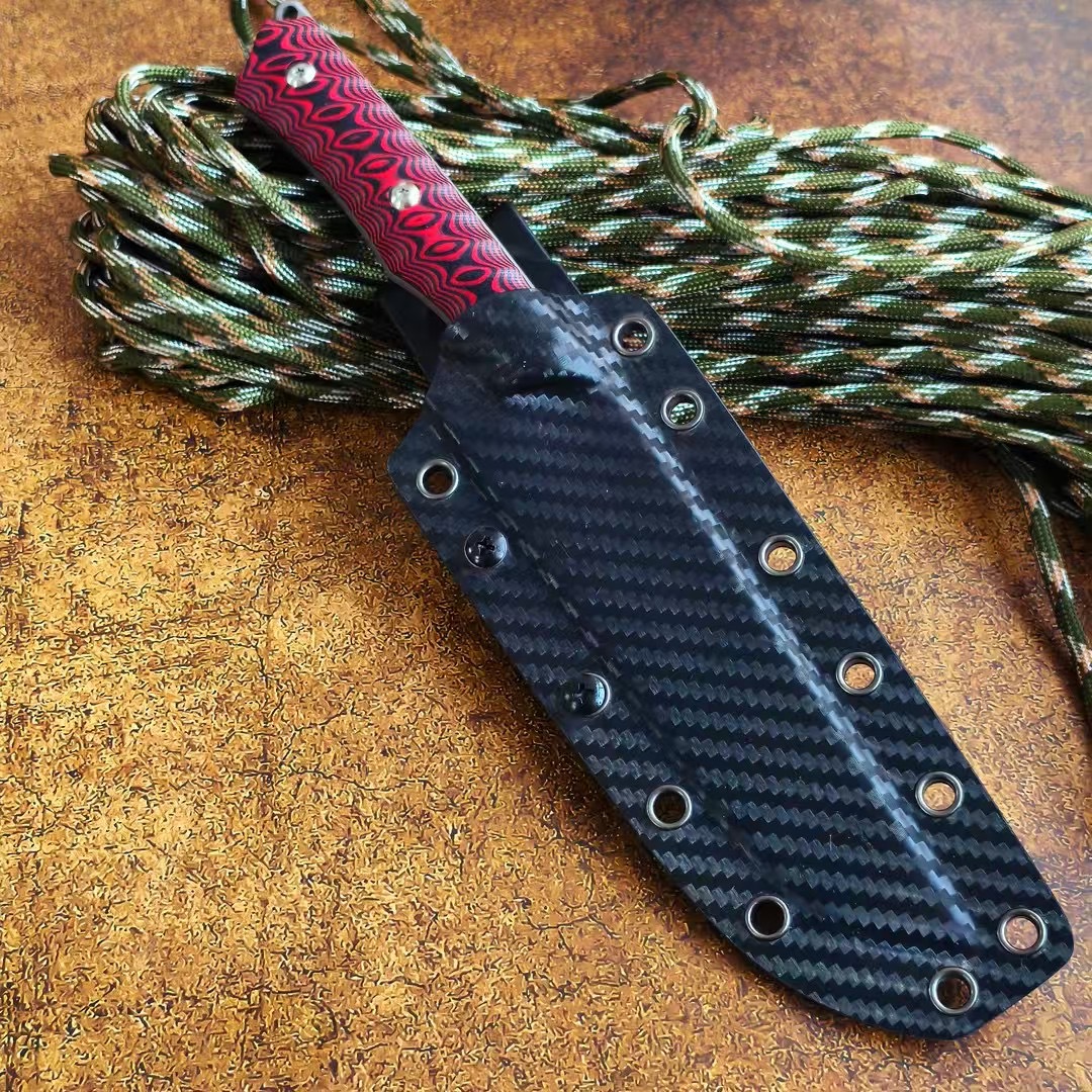 红莲之刃刃材 三合钢柄材 双色G10刀鞘 碳纤K鞘(带背夹)全长26cm刃长14cm刃厚0.4cm刃宽2.7cm重量299g(刀+鞘)420g含包装包装尺寸 29.9*5*8.2cm