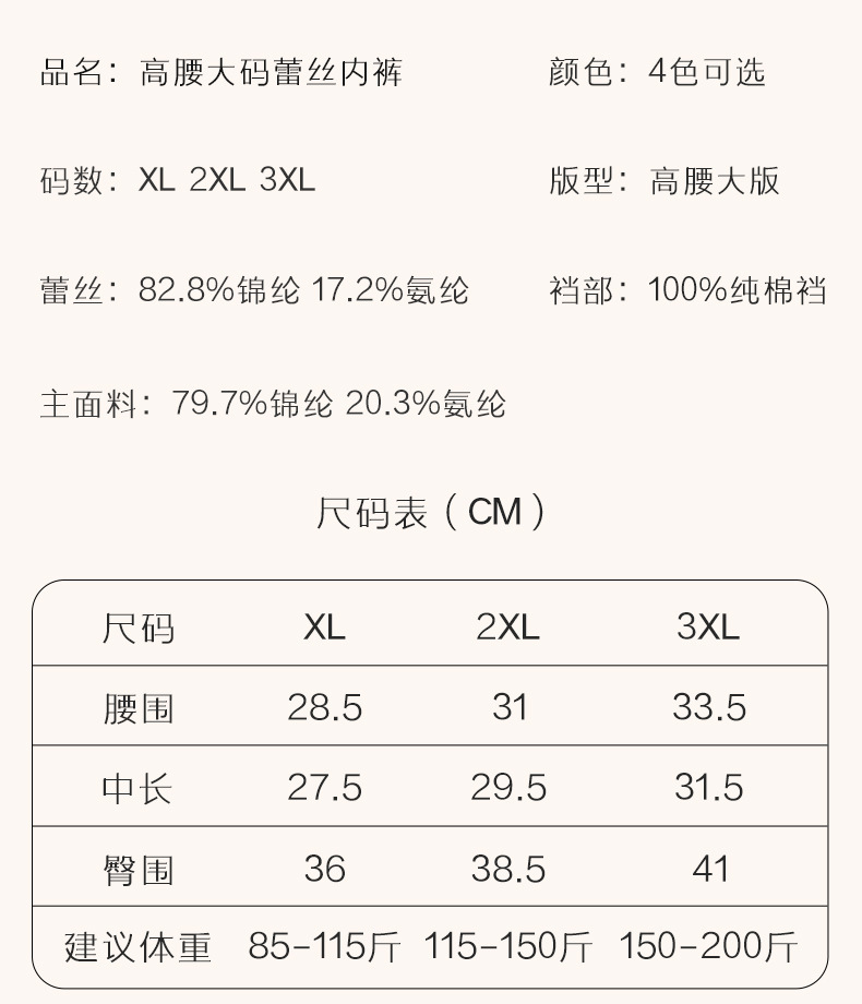 面料名称: 蕾丝 裆部里料成分: 棉 品牌: 默认项 主面料成分: 锦纶 功能: 无痕,提臀,速干,透气,抗菌 腰型: 高腰 适用人群类别: 少女 学生 胖妹妹 胖MM 女人 女士 货号: 311-S 纱支D数: 41-50d 织法: 针织 包装形式: 袋装 是否支持代工: 不支持 产地: 汕头市谷饶镇 是否无缝: 否 图案: 纯色,花朵,环保,植物花卉,都市风貌 颜色: 咖啡,淡粉,黑色,香槟 尺码: XL,2XL,3XL 是否进口: 否 是否跨境出口专供货源: 否 主面料成分含量: 70%(含)-80%(不含) 重量: 0.05 kg/条