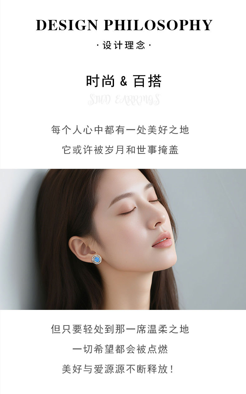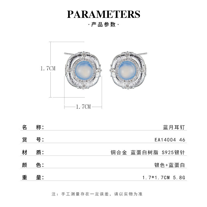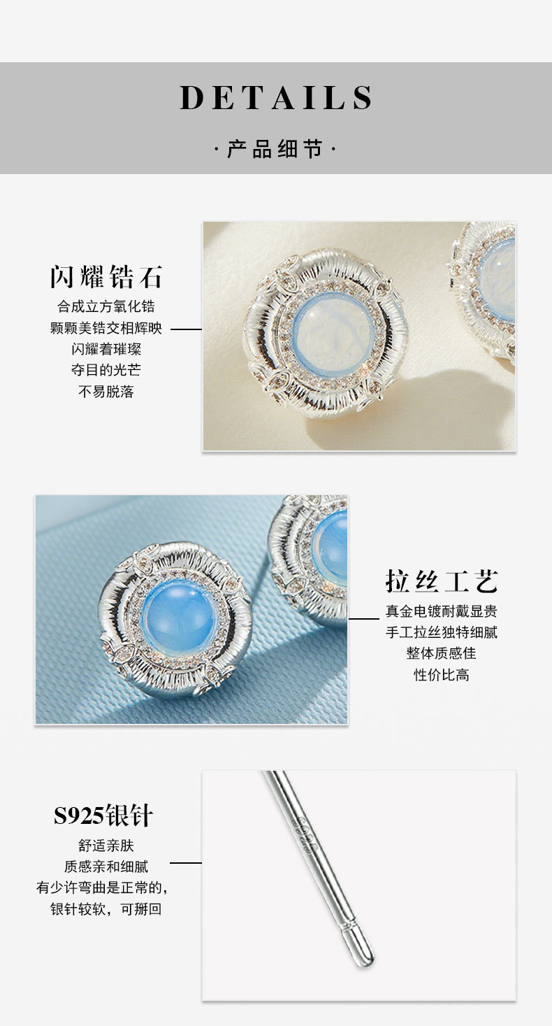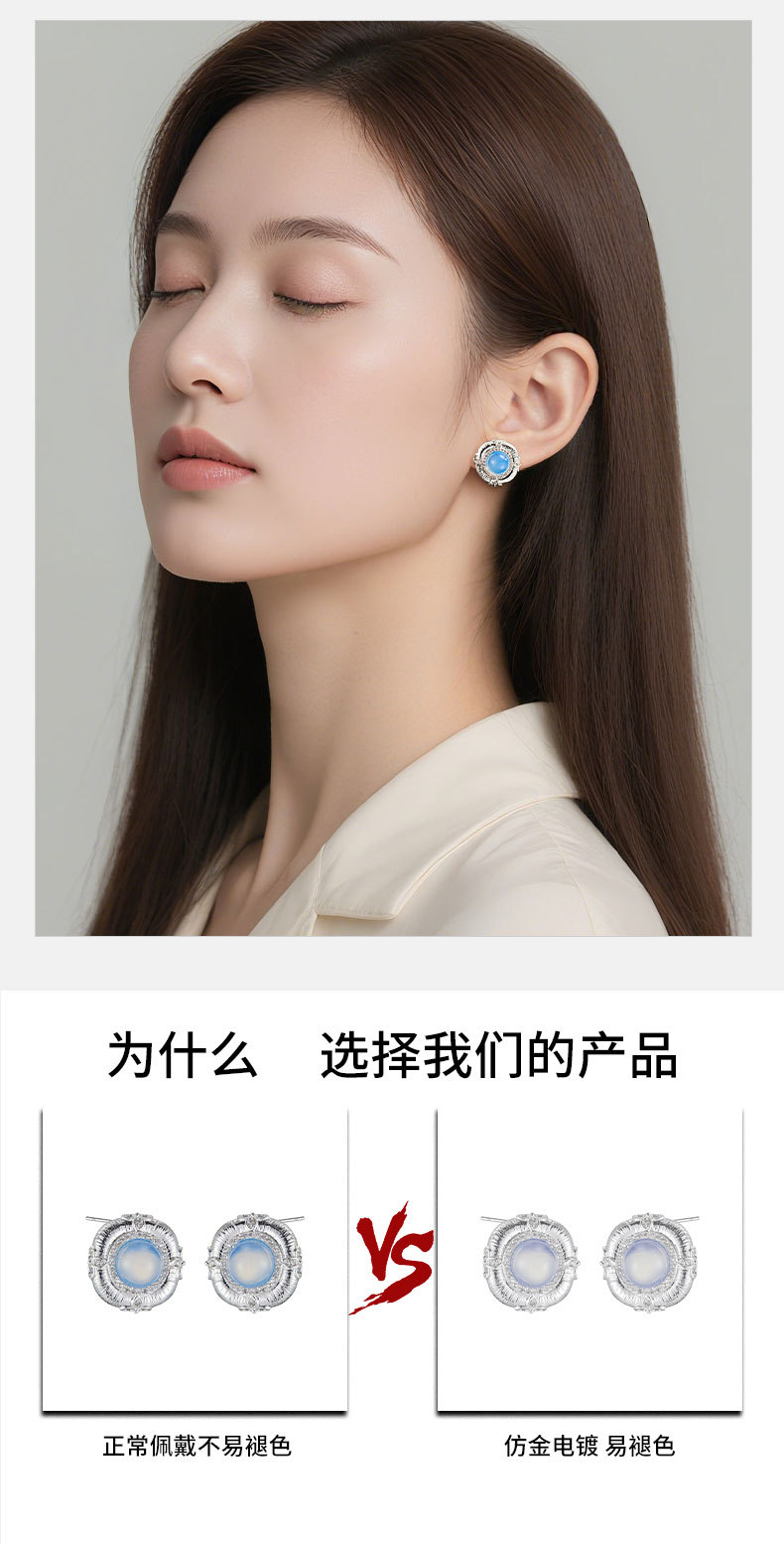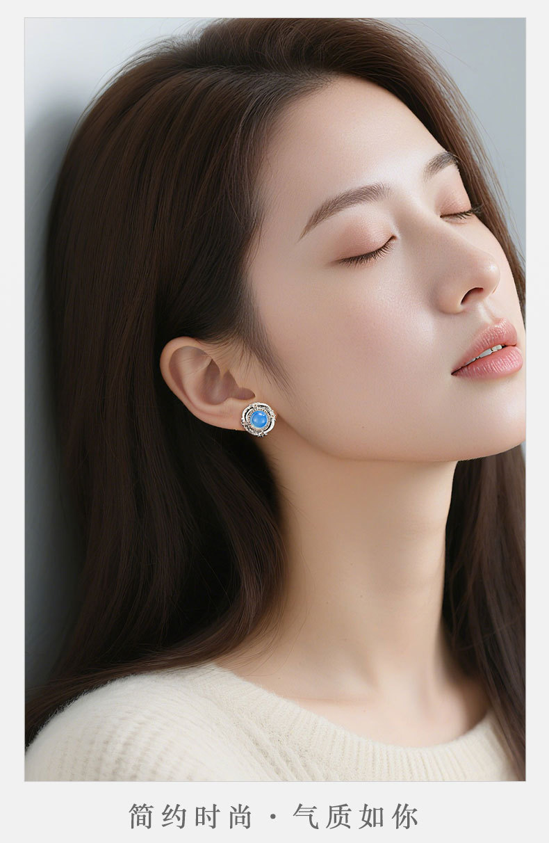 轻奢高级感蓝蛋白浮雕设计耳钉必入款铜合金真金电镀s925银针耳饰 投诉