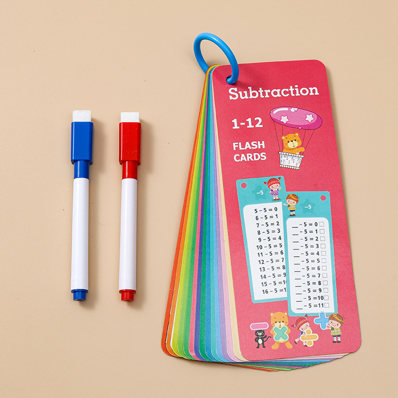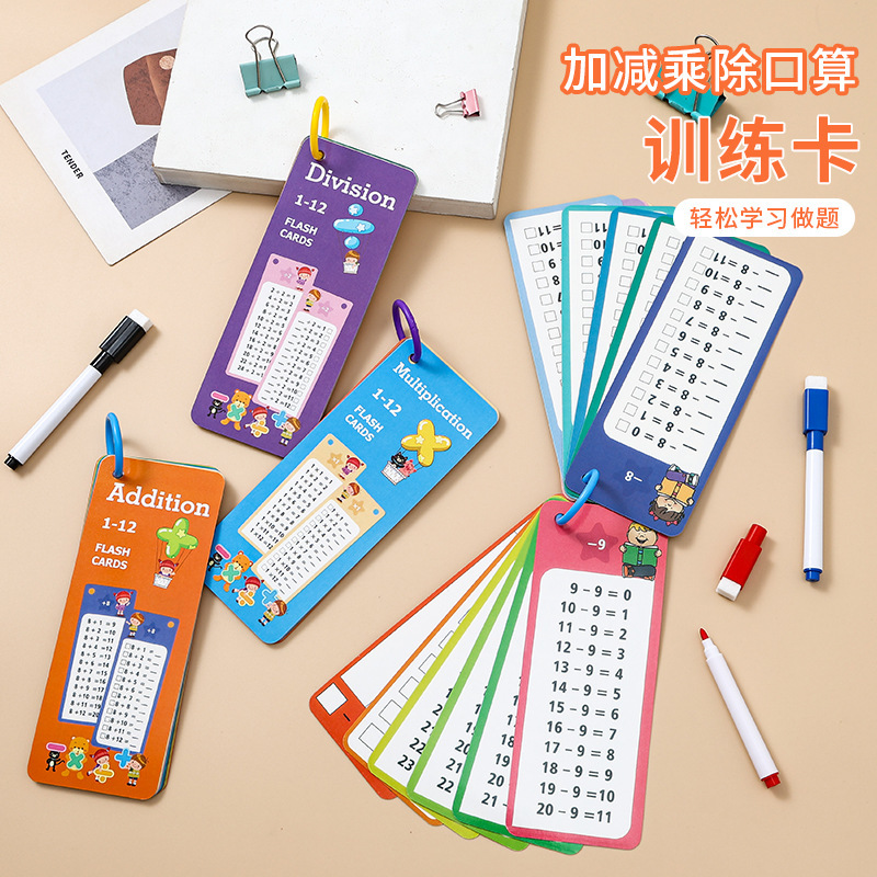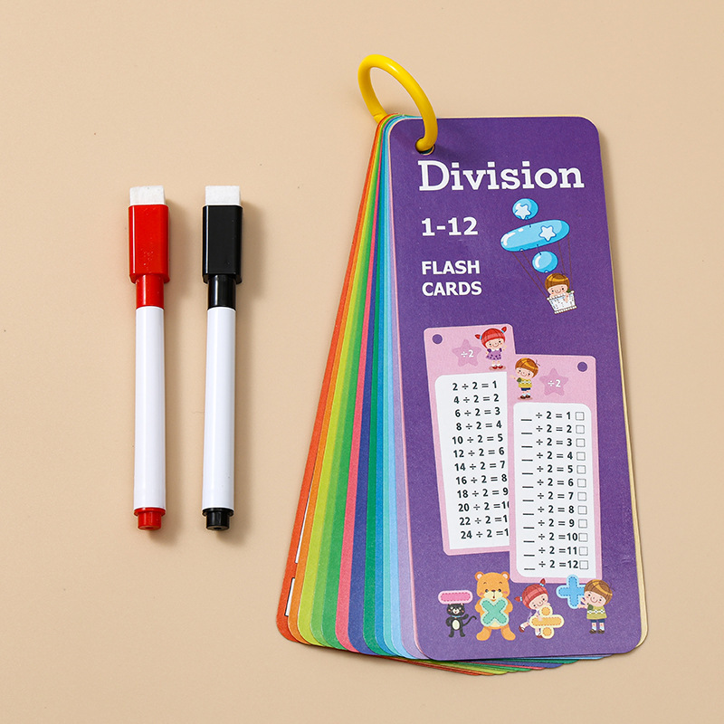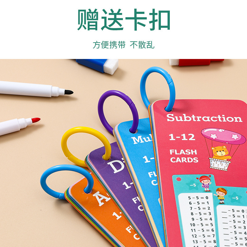 (除法加法减法)15张卡片+1支红色可擦笔+1支黑色可擦笔+1个收纳环入OPP袋子。