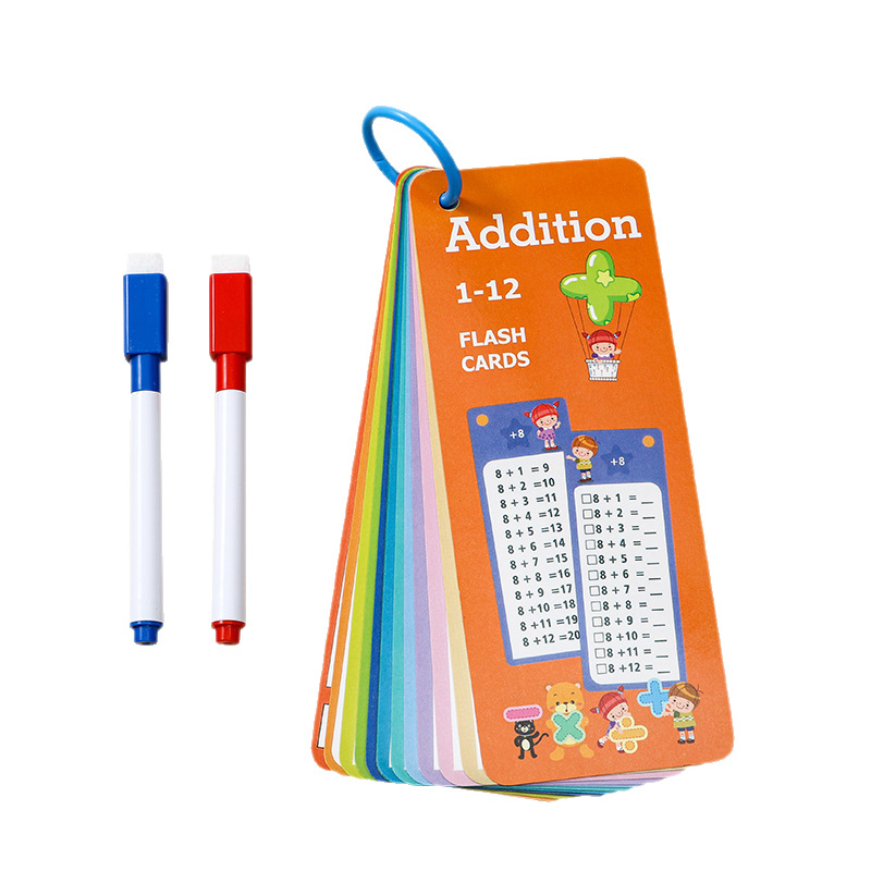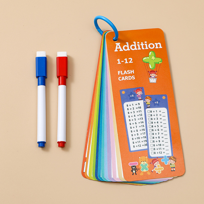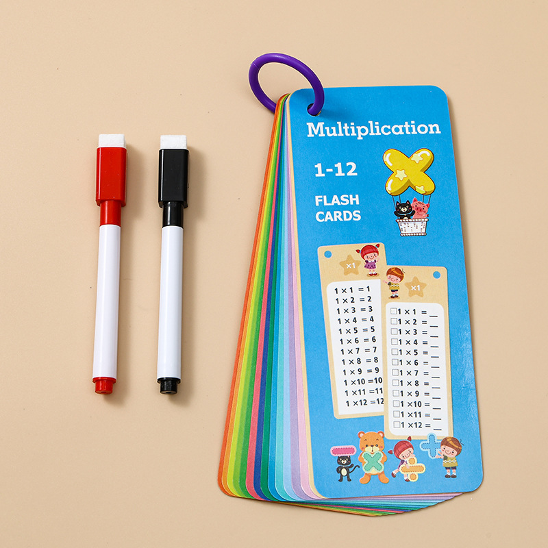包装方式:(乘法)14张卡片+1支红色可擦笔+1支黑色可擦笔+1个收纳环入OPP袋子。