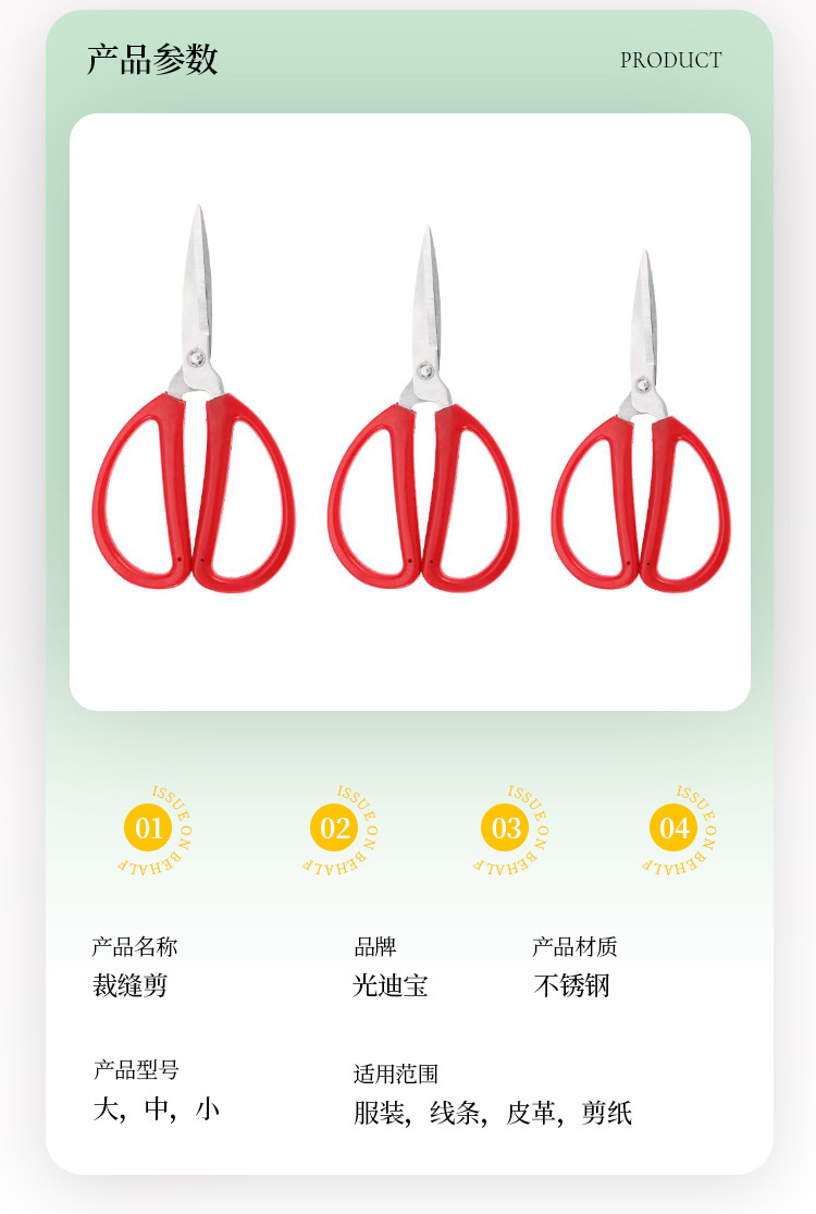 品牌: 光迪宝 用途: 文具办公 形状: 直头 材质: 不锈钢 是否进口: 否 货号: 民用剪 产地: 阳江 箱装数量: 100 是否专利货源: 否 颜色: 红色 规格: 小,中,大 主要下游平台: 亚马逊 主要销售地区: 其他 有可授权的自有品牌: 否 是否跨境出口专供货源: 是 风格: 现代简约 风格: 现代简约 加工定制: 是 宽度: 8.2,9.2,10.2 长度: 6,7,8寸
