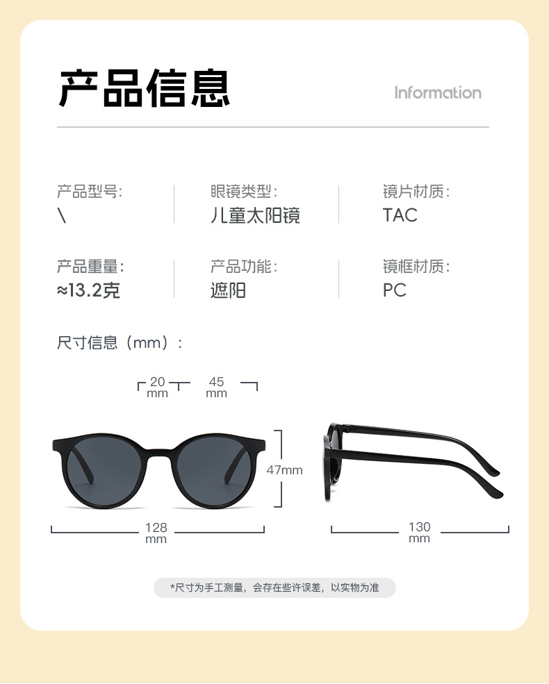镜片材质: PC 是否偏光: 否 镜框材质: PC 品牌: 其他 抗UV等级: UV400 眼镜款式: 圆框 眼镜结构: 全框 是否支持近视镜: 否 上市年份/季节: 2025年春季 是否跨境出口专供货源: 是 货号: C09 镜架颜色: 黑框,实白框,米粉框,酒红框,果冻茶 流行元素: -1 产地: 台州 风格分类: 清新甜美 适用性别: 儿童 透射比分类: 3类/遮阳镜 镜架材质: PC 流行元素分类: 生活用品 重量: 0.5 kg/副