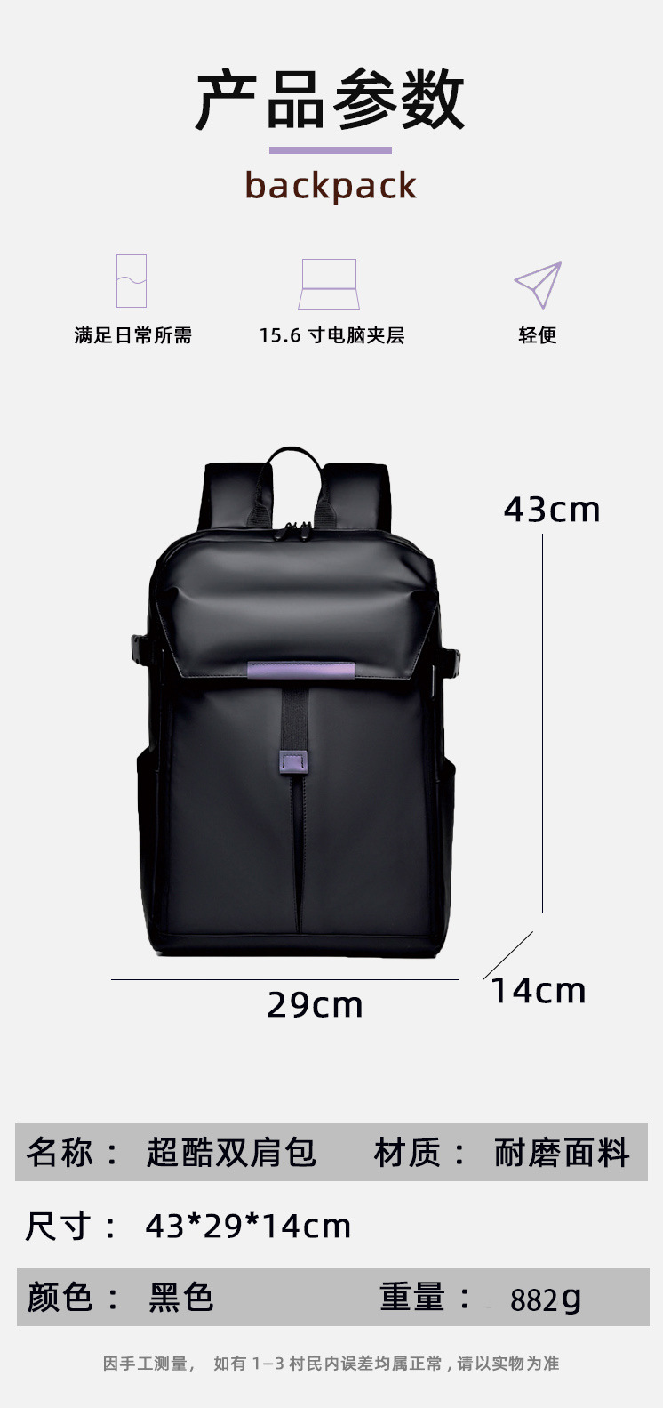 材质: 耐磨面料 里料质地: 涤纶 皮质特征: 无 容纳电脑尺寸: 15英寸 容量: 20L以下 适用性别: 中性/男女均可 品牌: 洪凯 颜色: 黑色 尺寸: 43*29*14cm 适用场景: 休闲旅行 风格: 无性别风 上市年份季节: 2025年冬季 货号: 8011 图案: 无 流行元素: 车缝线 背负系统: 弧形肩带 重量: 0.8 kg/个
