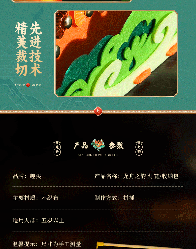 材质: 不织布 功能: 发光 工艺: 其他 品牌: 趣买 规格: 25*35*10*cm 形状: 不规则形 加印LOGO: 可以 货号: 龙舟提灯 重量: 84g左右 重量: 0.377 kg/件
