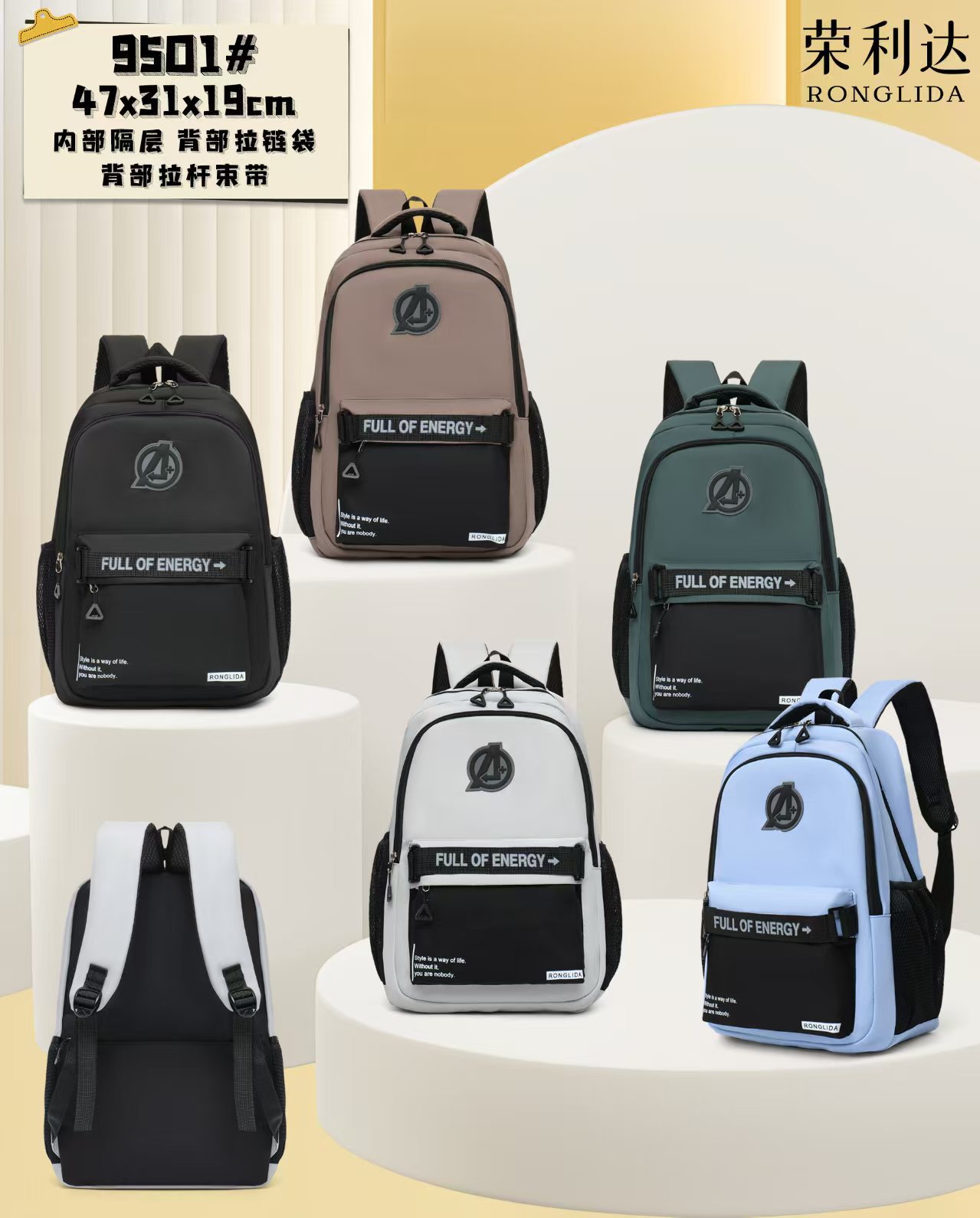 材质: 牛津布 功能: 透气,防水,超轻,抗菌,耐磨,减负,护脊 里料质地: 涤纶 容纳电脑尺寸: 13英寸 容量: 20L以下 适用性别: 中性/男女均可 品牌: 荣利荙 颜色: 黑色,咖啡色,绿色,灰色,蓝色 尺寸: 高47宽31厚19 适用场景: 学校教育 风格: 休闲旅行 上市年份季节: 2025夏季 货号: 9501 图案: 纯色 流行元素: 撞色 背负系统: 气垫背带 有可授权的自有品牌: 是 重量: 0.3 kg/个