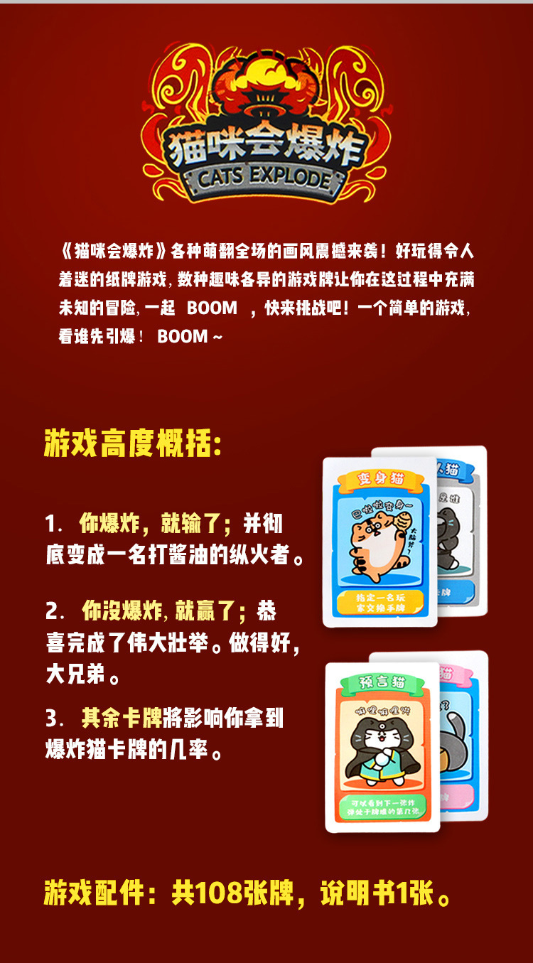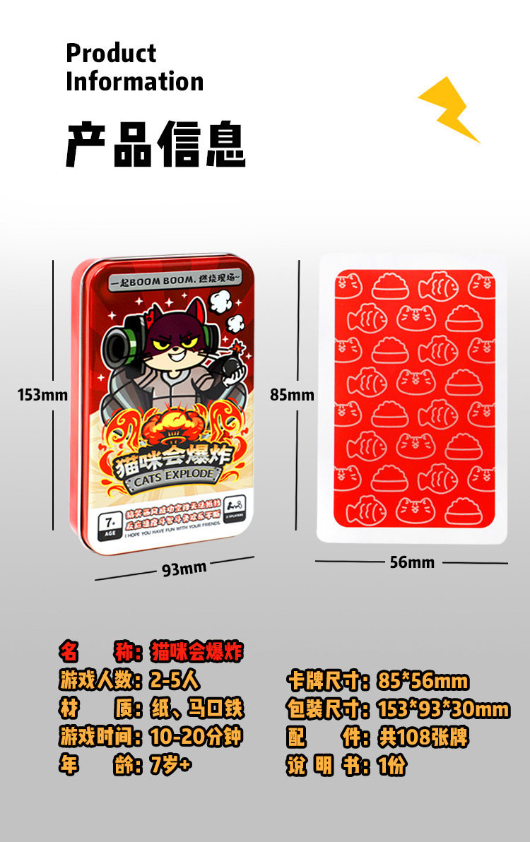 品牌: 游洛 分类: 桌游牌 材质: 纸 能力培养: 情感 特色功能: 默认项 适用年龄: 青年(15-35岁) 是否专供外贸: 否 适用场合: 通用 3C配置类别: 14岁以上的玩具 颜色: 铁盒装猫咪会爆炸 重量: 0.5 kg/盒