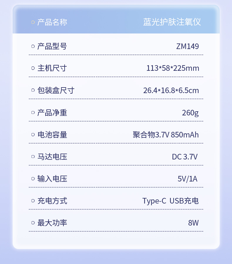 功能: 彩光,19037836944 产品类别: 补水仪 防水等级: IPX9 专利类型: 无 适用场景: 家用 是否内置电池: 否 上市时间: 2022 颜色: 紫色 货号: ZM149 是否便携: 是