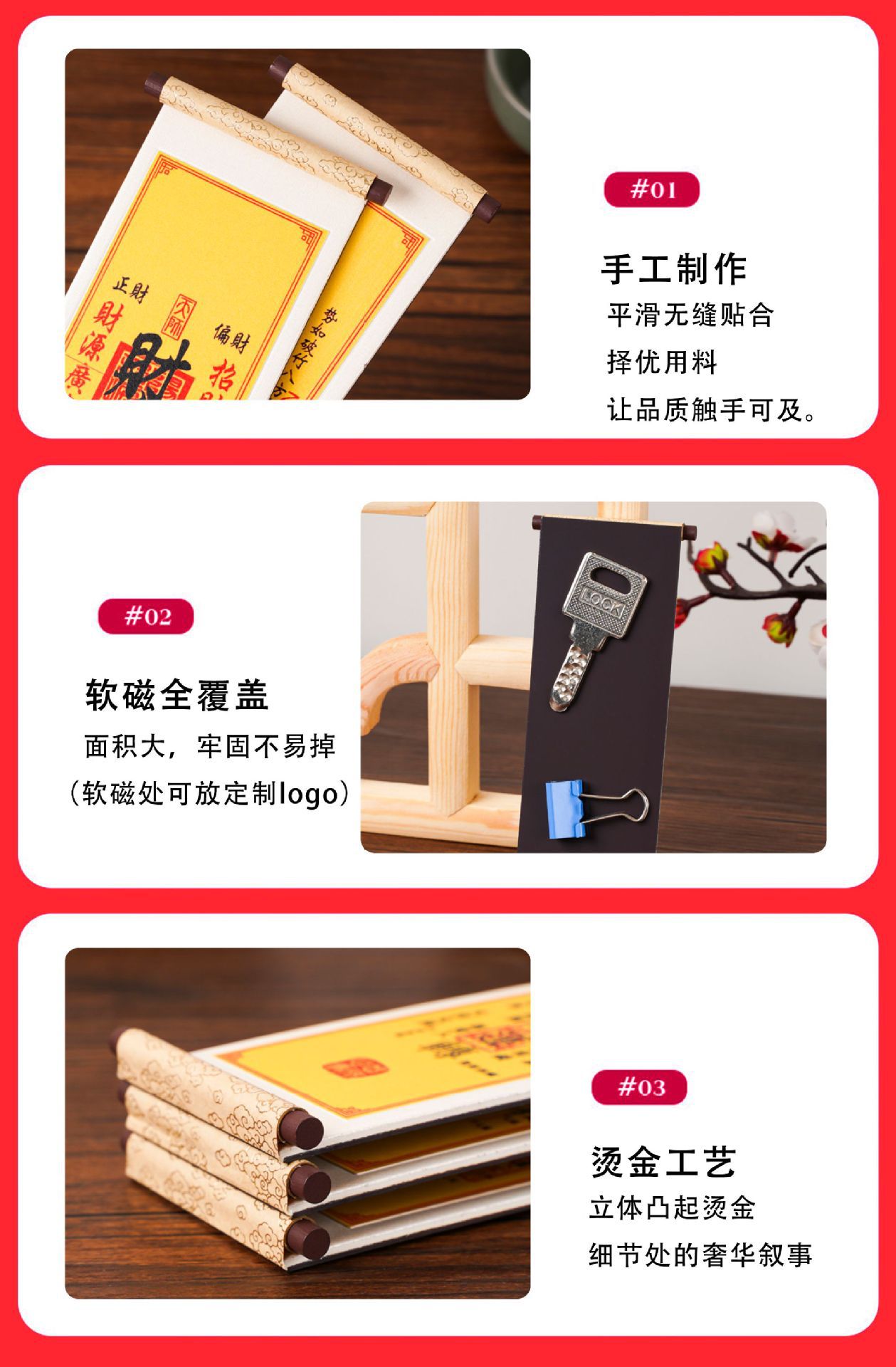 材质: 木质 尺寸: 8 品牌: 无 风格: 个性风,中式风,文创风 规格: 13*5.4 cm 版权: 无版权 产品编号: CD-210 是否进口: 否 支持支付宝: 支持 是否专利货源: 否 货号: 招财符系列木制卷轴冰箱贴 是否跨境出口专供货源: 是 是否属于礼品: 是,商务礼品 加工定制: 是 流行元素: 纯色 冰箱贴类型: 装饰型 重量: 0.002 kg/件