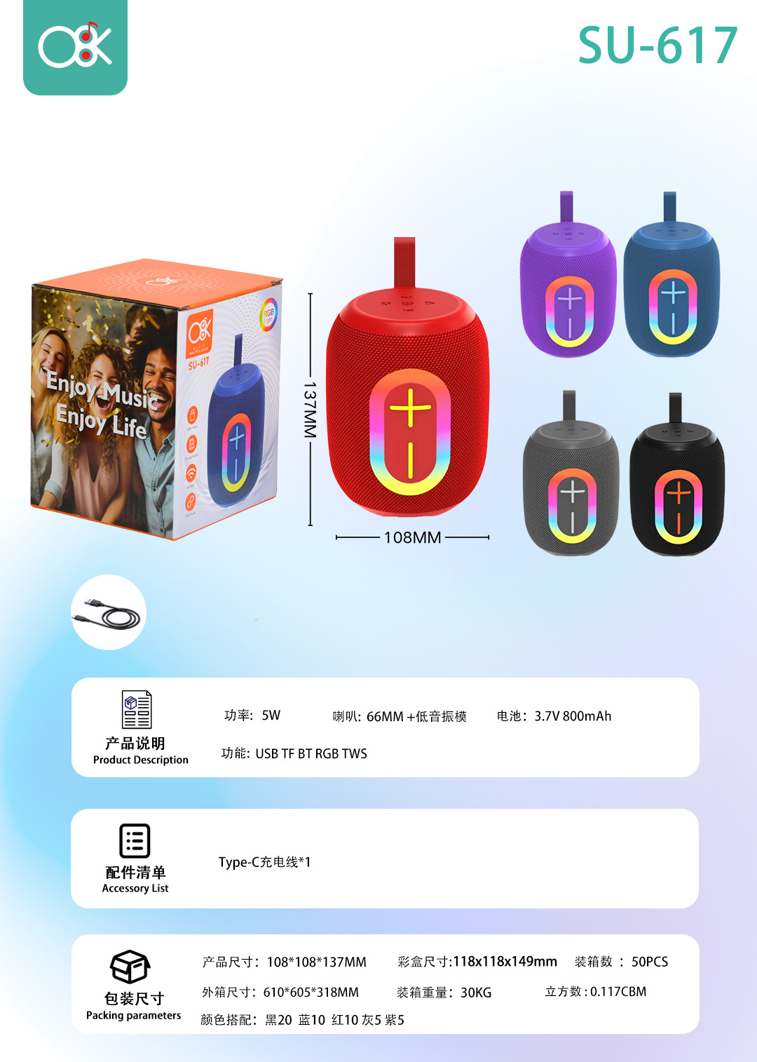 功能:USB/TF/BT/FM/TWS/RGB