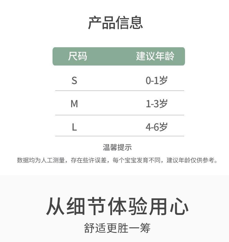 尺寸:S(0-1岁) M(1-3岁) L(3-5岁)