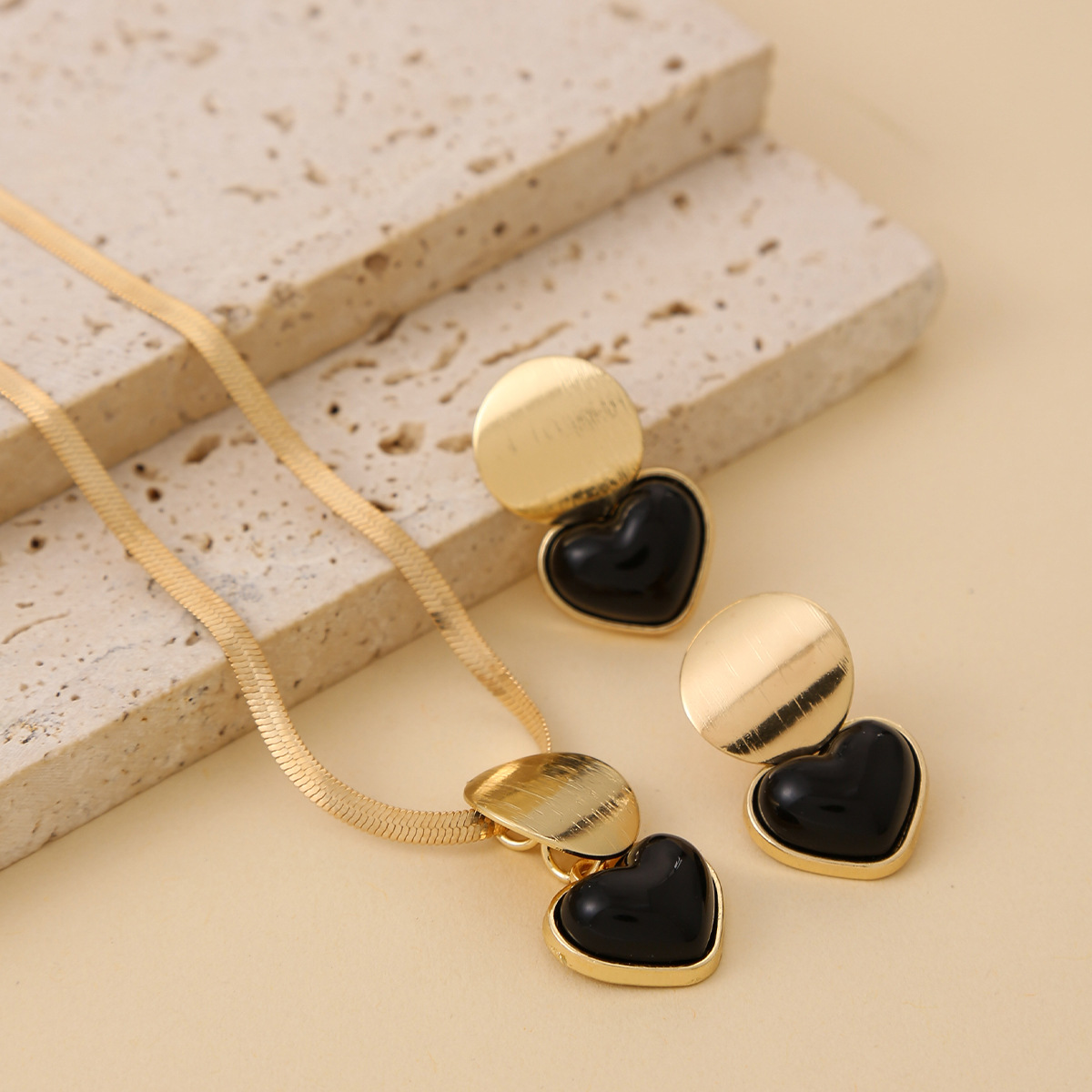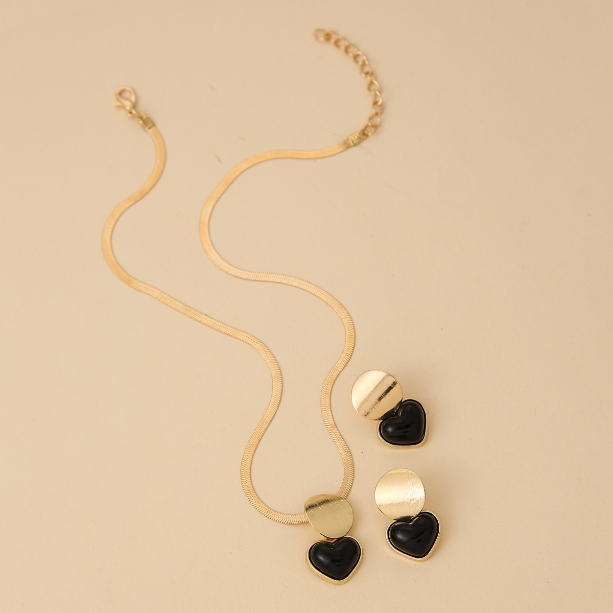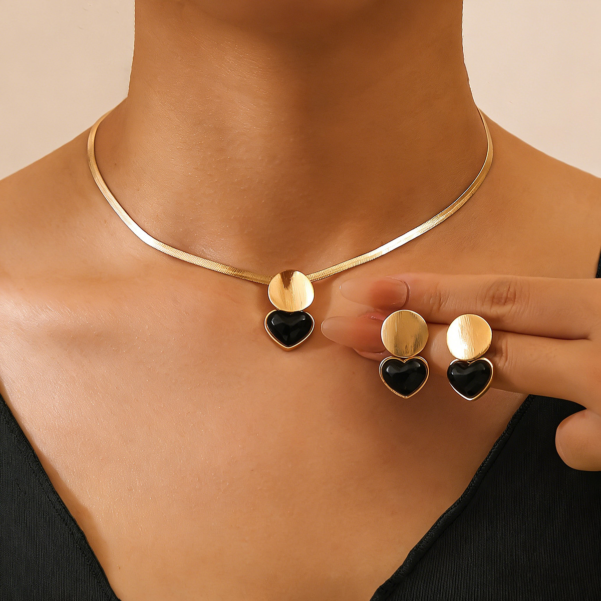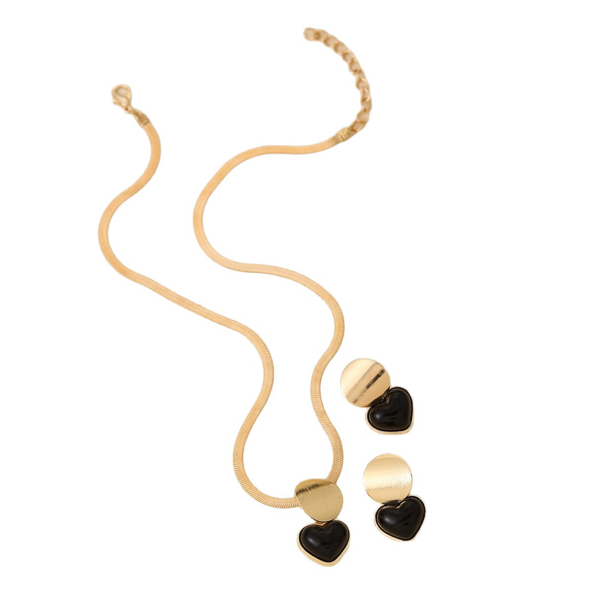 跨境热销黑色心形吊坠造型耳环和项链个性百搭高级感首饰套装耳饰 English | 投诉