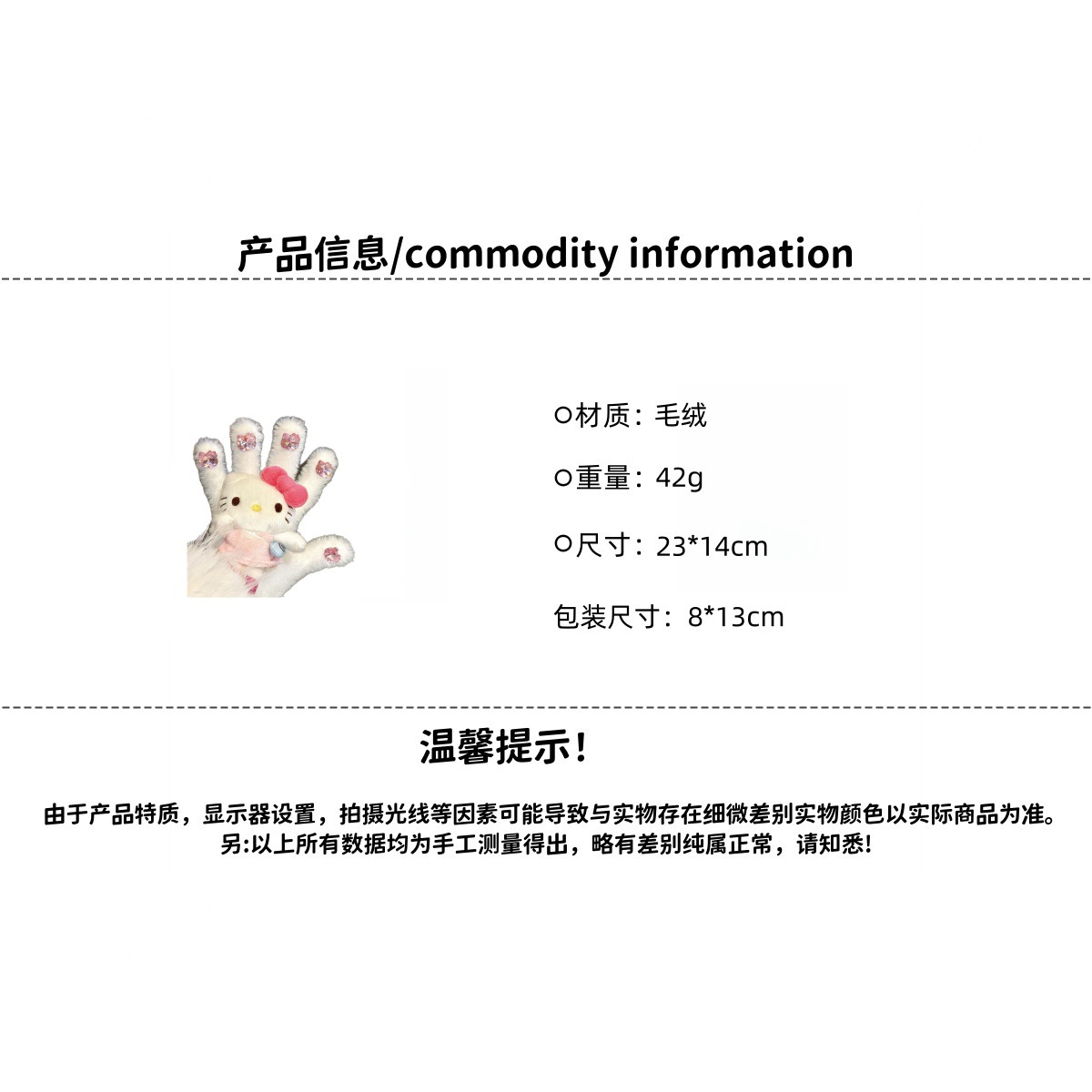 功能: 保暖,防风,其他 款式: 分指手套 面料名称: 毛绒 产品类别: 保暖手套 品牌: 无品牌 货号: SL1156 有可授权的自有品牌: 否 是否跨境出口专供货源: 是 适合季节: 冬季 上市年份/季节: 2025年冬季 产地: 义乌 风格: 甜美 适用场景: 运动,滑雪,手工制作,通勤,骑车 厚度等级: 厚 风格分类: 清新甜美 处理工艺: 其他 适用人群: 通用 是否一次性: 否 流行元素分类: 卡通/人物 重量: 0.229 kg/双