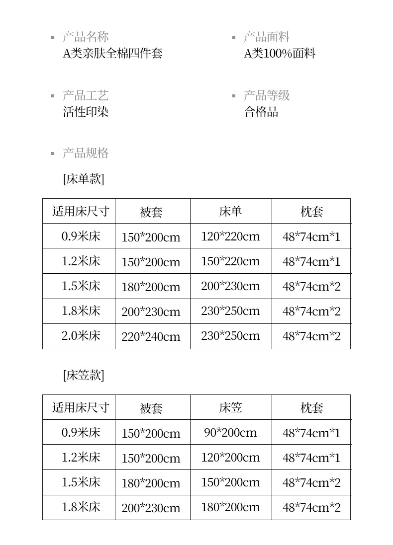 | 1.5m床四件套【被套1.8x2.0m,床单2.0x2.3m,枕套2个】 | ¥18125 | 2998套可售 |